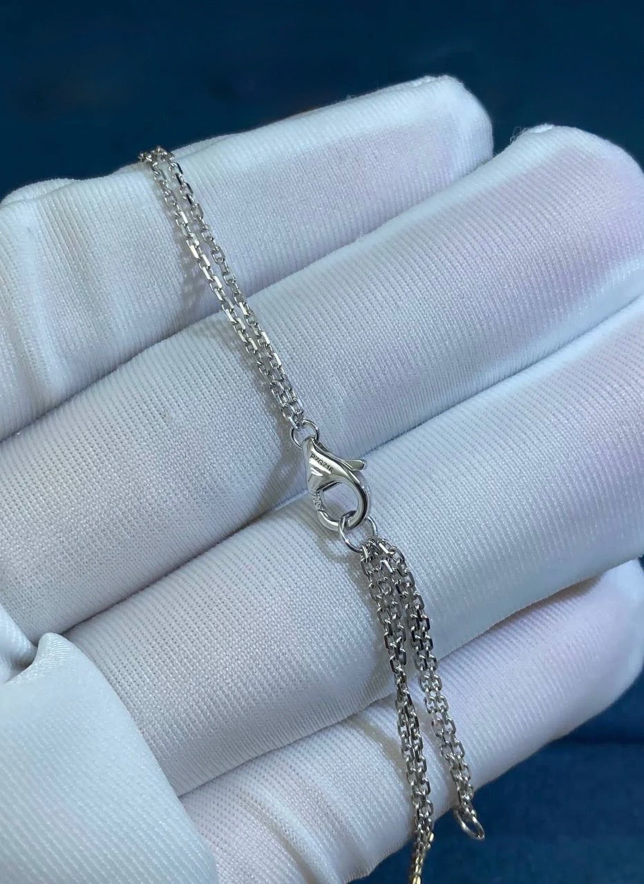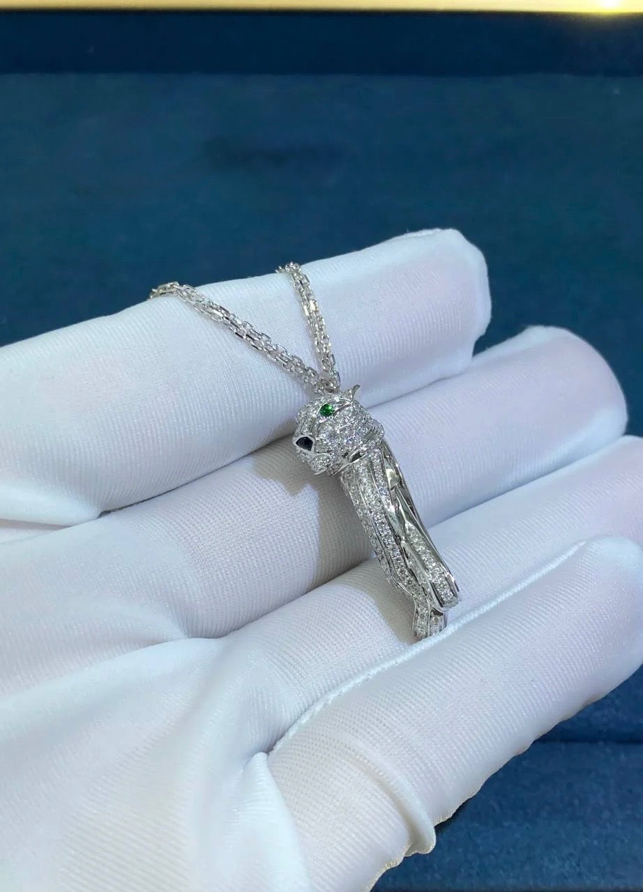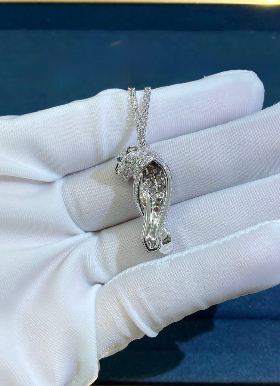Sleek, iconic, and instantly recognizable, this exquisite pendant necklace celebrates the legendary panther motif. Expertly crafted in 18K white gold, it shimmers with 77 brilliant-cut diamonds totaling 0.31 carats, adding subtle radiance to its bold design. The panther’s piercing gaze is brought to life with two vivid emerald eyes, while a polished onyx nose lends a refined finishing touch. A timeless jewel that perfectly balances elegance and fierce allure.