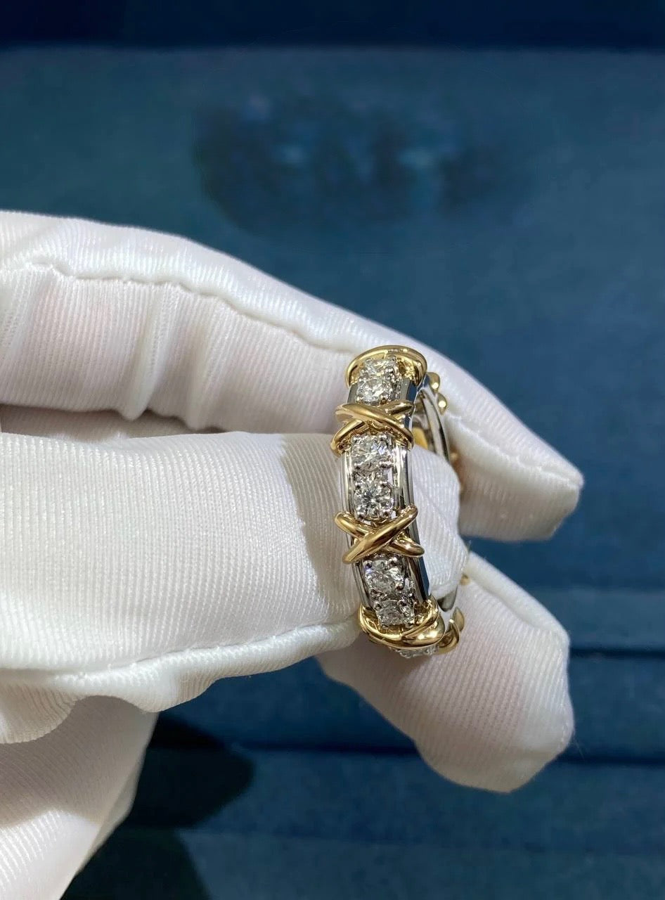 This exquisite ring is a standout piece from a uniquely distinguished collection. Sixteen round brilliant diamonds, totaling 1.14 carats, are arranged in pairs along the length of the ring, each of exceptional quality with F color and VVS clarity. Between each diamond section, the iconic cross motif—crafted in 18k yellow gold—adds striking detail, while the band itself is expertly made in platinum. Available in a combination of yellow gold and platinum or in platinum alone, this ring is both elegant and distinctive.