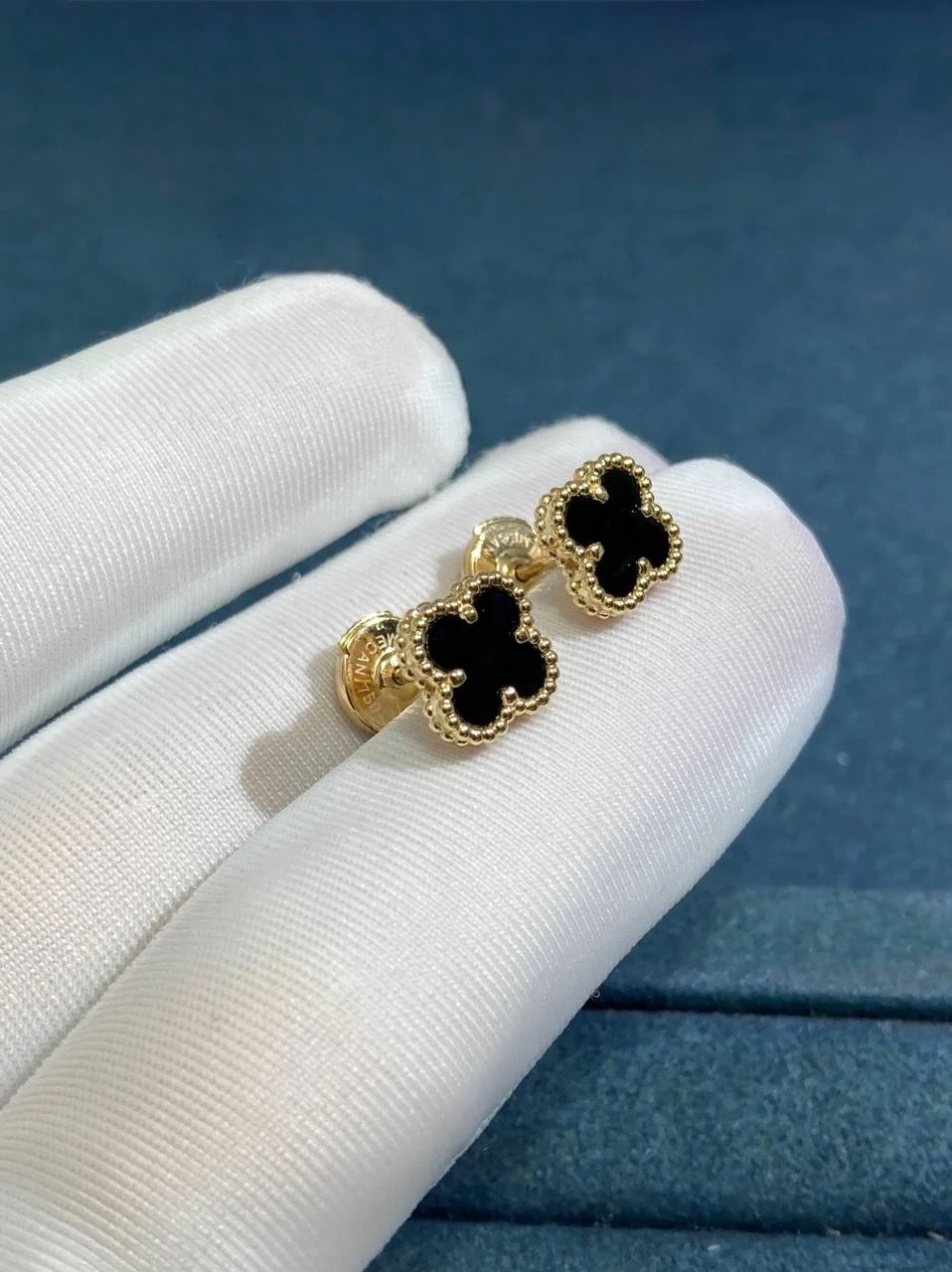 An iconic pair of 18k yellow gold earrings showcasing the timeless four-leaf clover motif, a symbol of luck and elegance. Each earring is framed with a delicate beaded edge and set with a deep black onyx inlay, offering a striking contrast against the warm glow of yellow gold. A refined design that balances classic charm with modern sophistication.