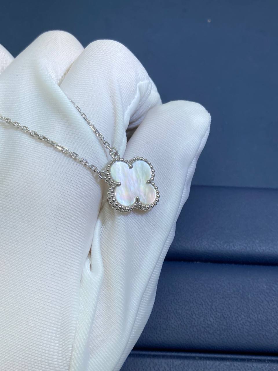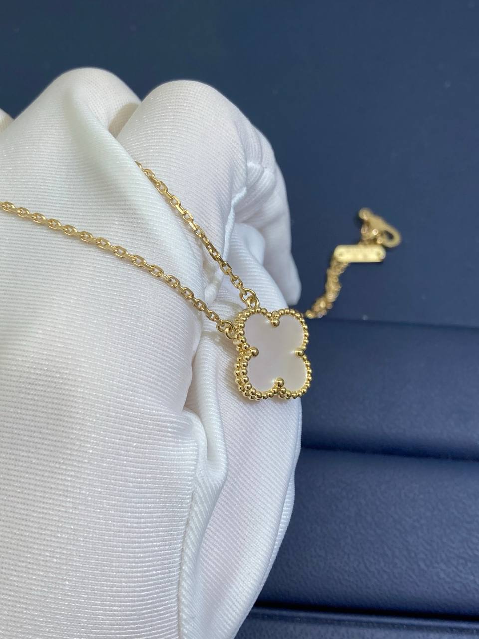 This elegant collar-length necklace is crafted in 18k gold and features a single clover motif delicately inlaid with white mother-of-pearl. Finished with a signature hallmark clasp, the design embodies timeless sophistication and effortless versatility, making it ideal for both everyday wear and special occasions.