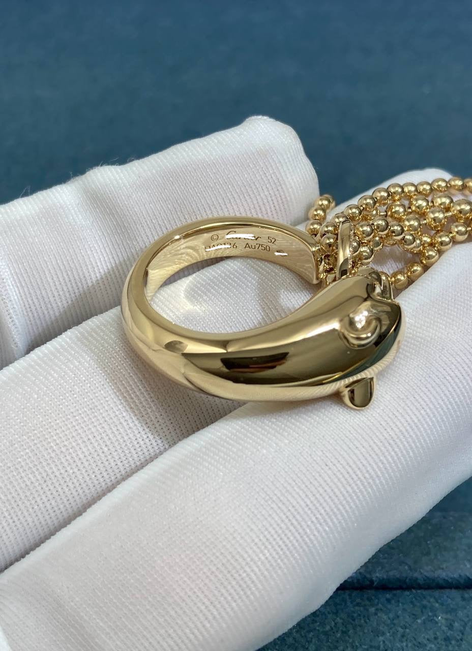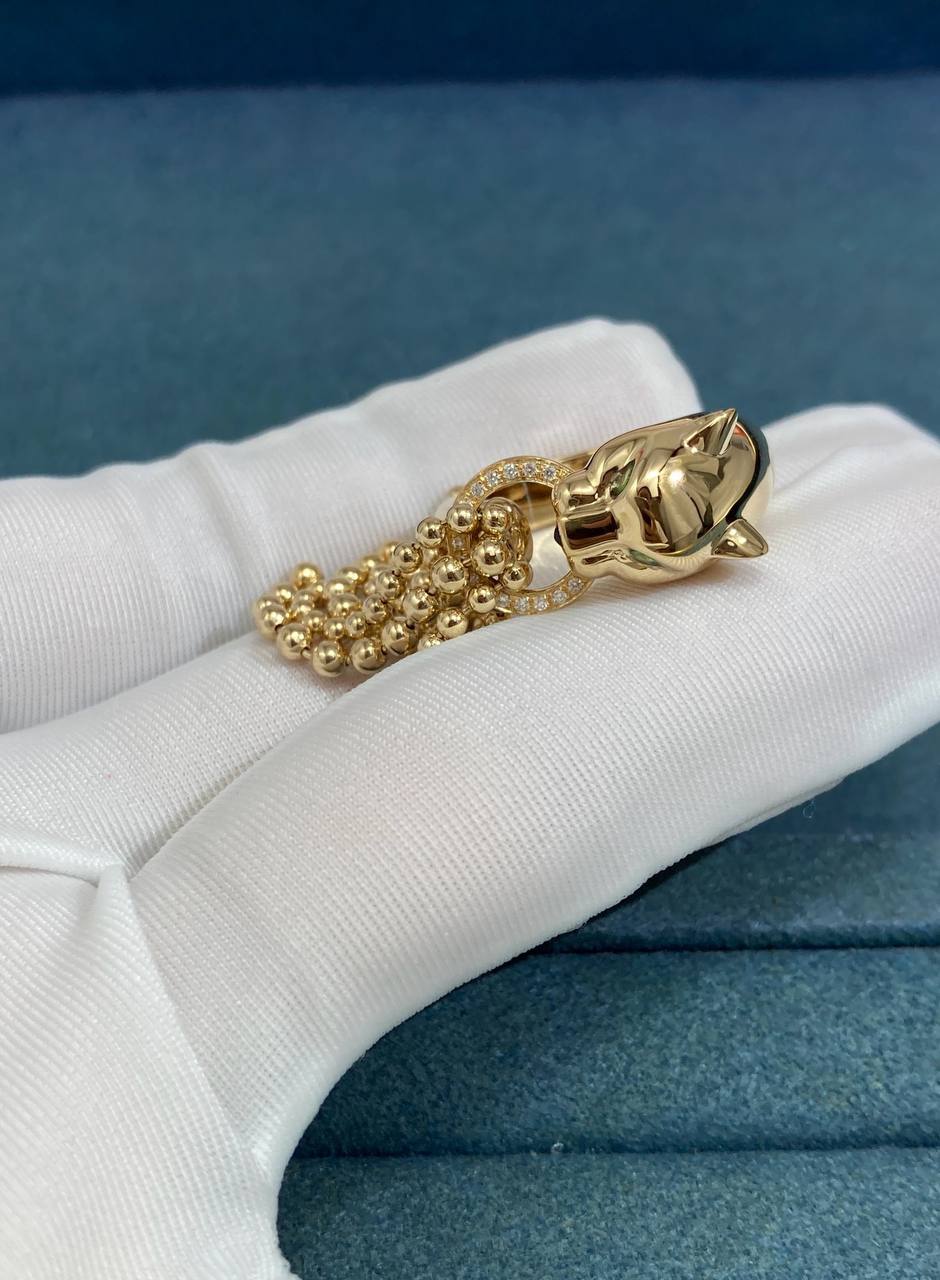 Embodying elegance and strength, this exquisite ring is crafted from radiant 18k yellow gold and accented with a striking blend of precious stones. Seventeen brilliant-cut diamonds, totaling 0.04 carats, add subtle sparkle, while vivid tsavorite garnets form piercing eyes and polished onyx details the nose. The stylized panther head motif measures 9.32 mm in width, capturing both the grace and power of this iconic creature.