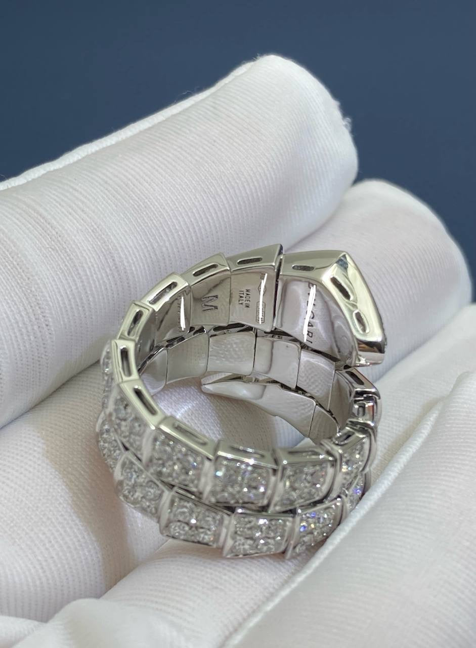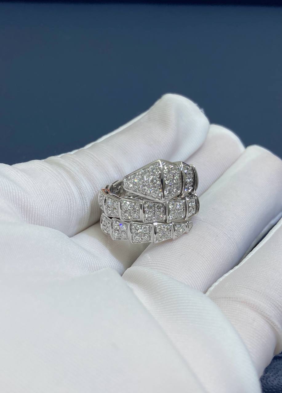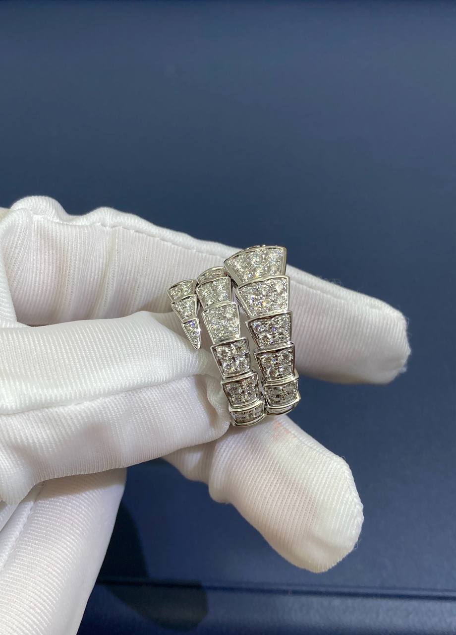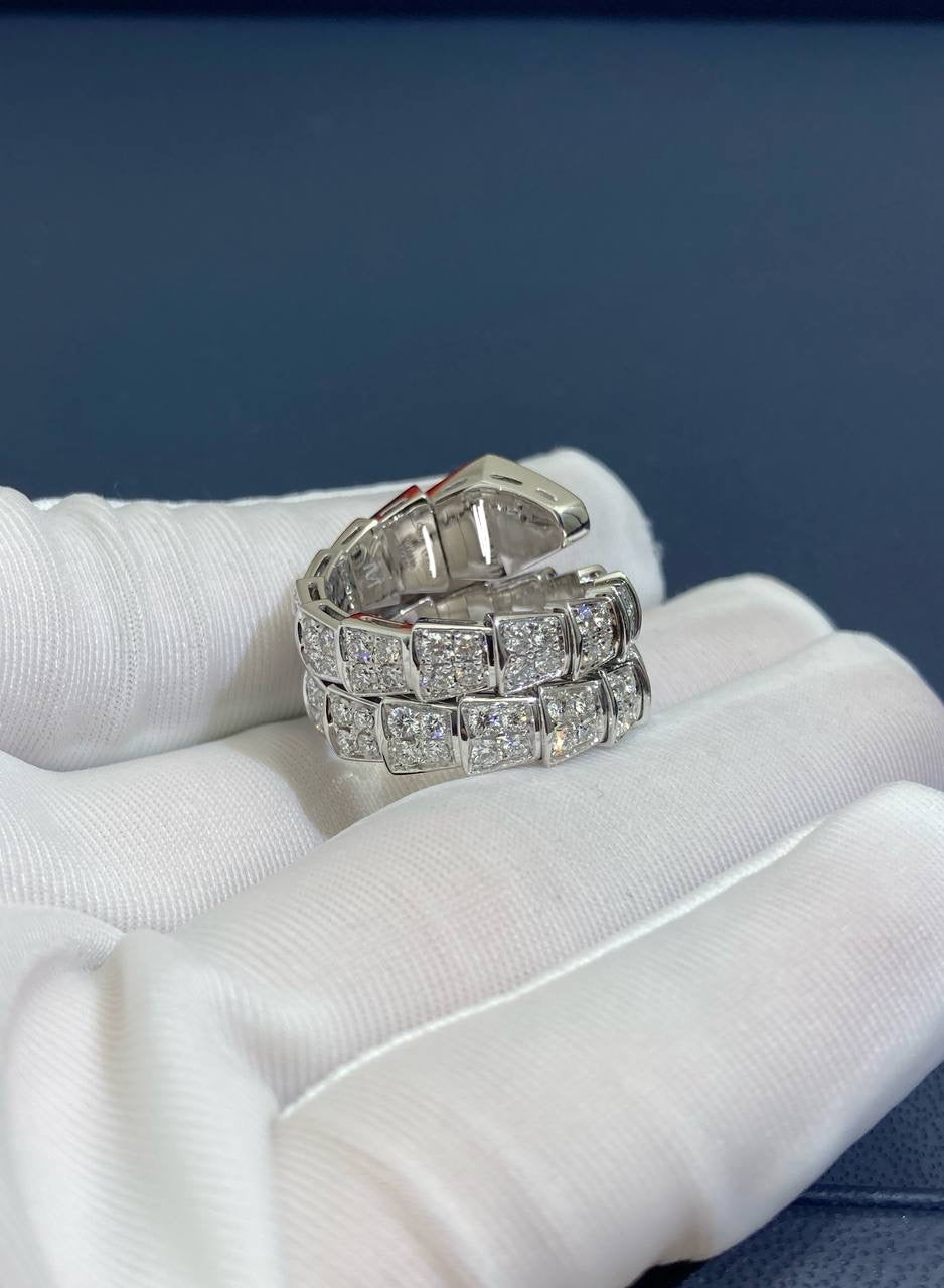 Showcasing exceptional craftsmanship and design, this stunning Serpent ring is a timeless classic. Inspired by the mythical snake, it features a sleek, geometric silhouette that coils gracefully around the finger. Pavé-set diamonds enhance the design with captivating sparkle, highlighting the fluidity and elegance of this iconic piece.