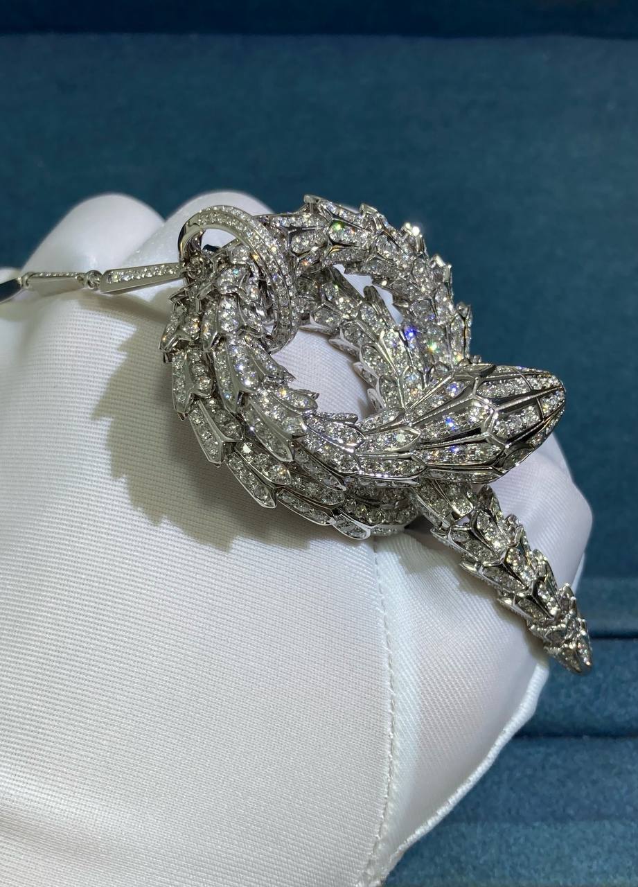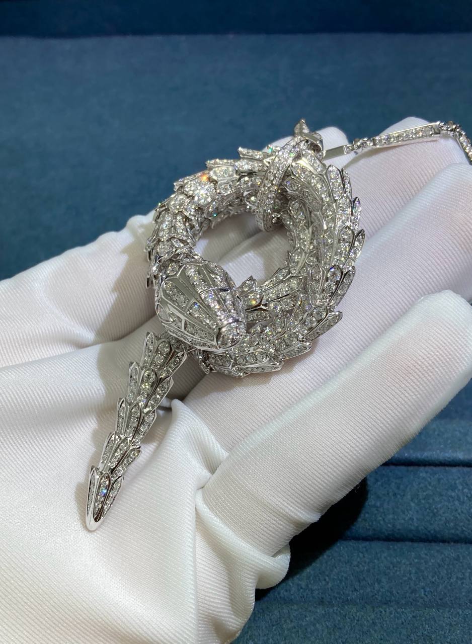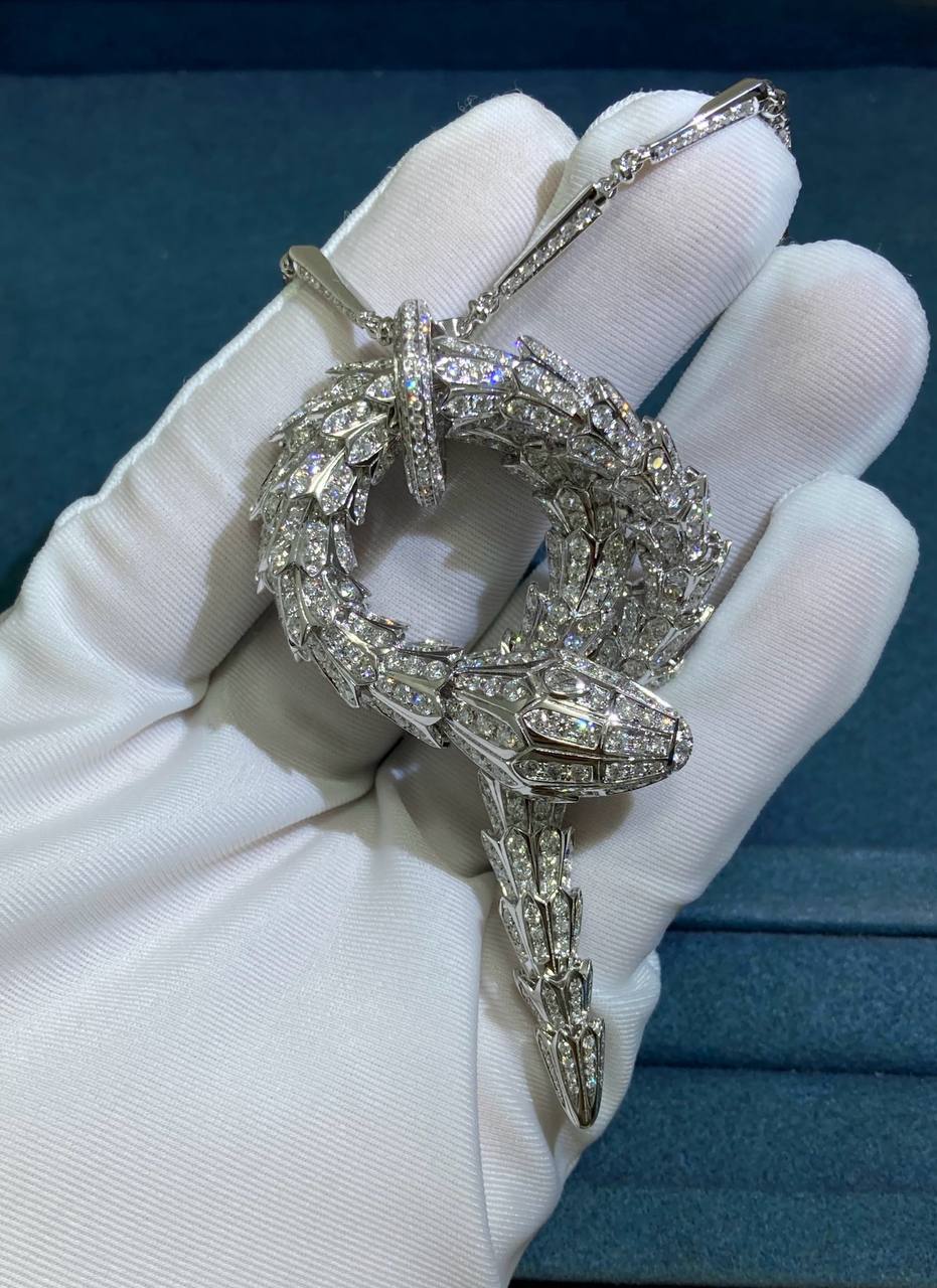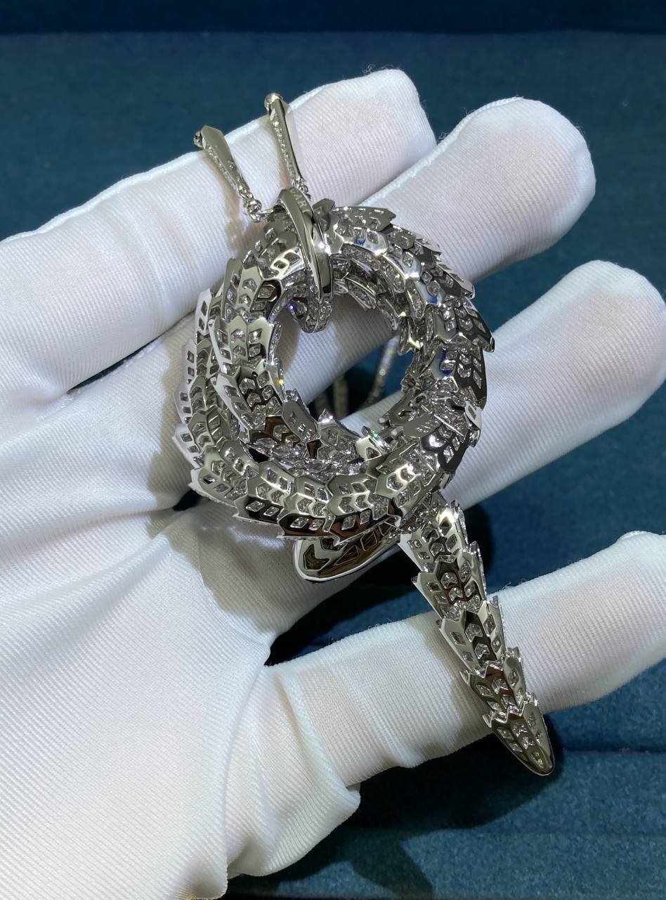 A masterpiece of craftsmanship, this Serpent pendant necklace coils with brilliant sophistication, transforming luxury into art. Meticulously forged in 18k white gold, the serpent’s layered scales curl with astonishing detail, while its spine is lavishly adorned with a staggering 15 ct of brilliant-cut diamonds. The cascade of stones creates a rippling effect that is both mesmerizing and opulent. Every scale, curve, and setting exemplifies technical finesse, creating a piece that radiates both power and elegance.