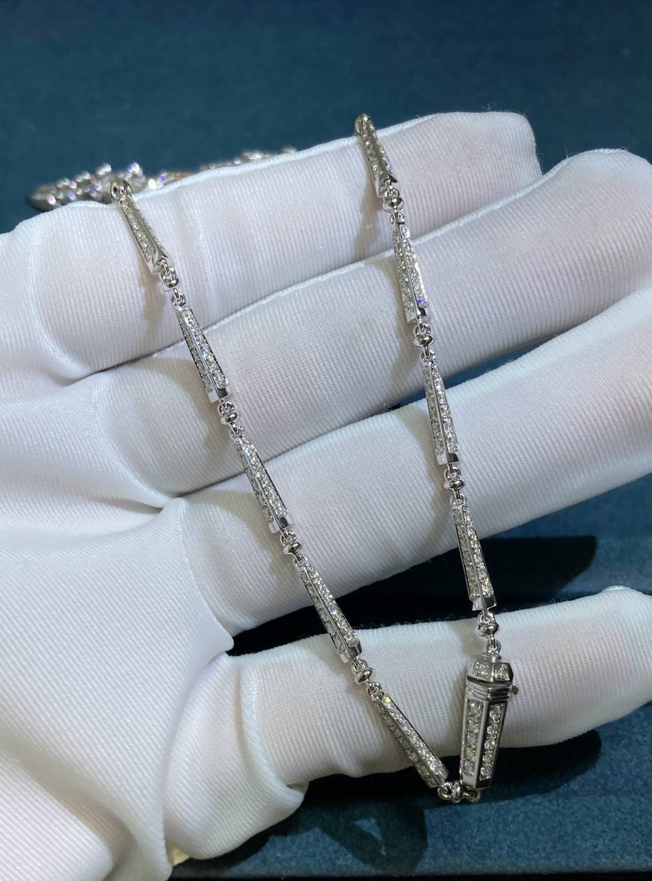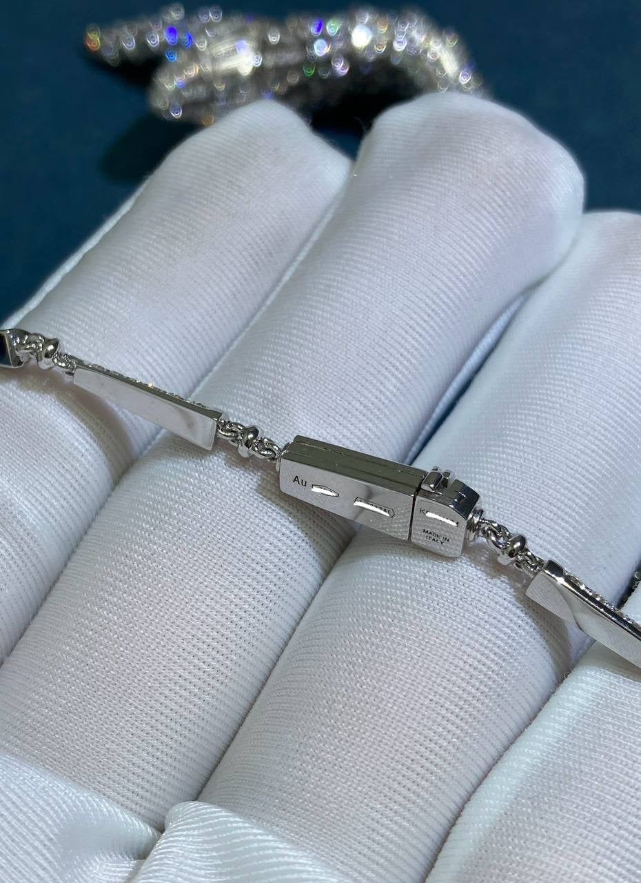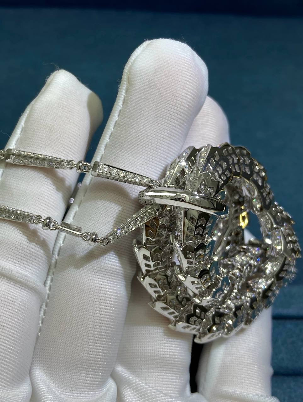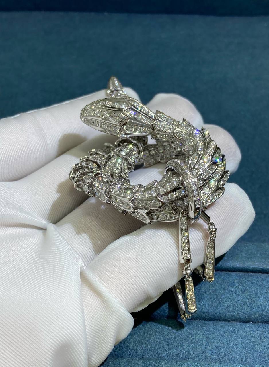 A masterpiece of craftsmanship, this Serpent pendant necklace coils with brilliant sophistication, transforming luxury into art. Meticulously forged in 18k white gold, the serpent’s layered scales curl with astonishing detail, while its spine is lavishly adorned with a staggering 15 ct of brilliant-cut diamonds. The cascade of stones creates a rippling effect that is both mesmerizing and opulent. Every scale, curve, and setting exemplifies technical finesse, creating a piece that radiates both power and elegance.