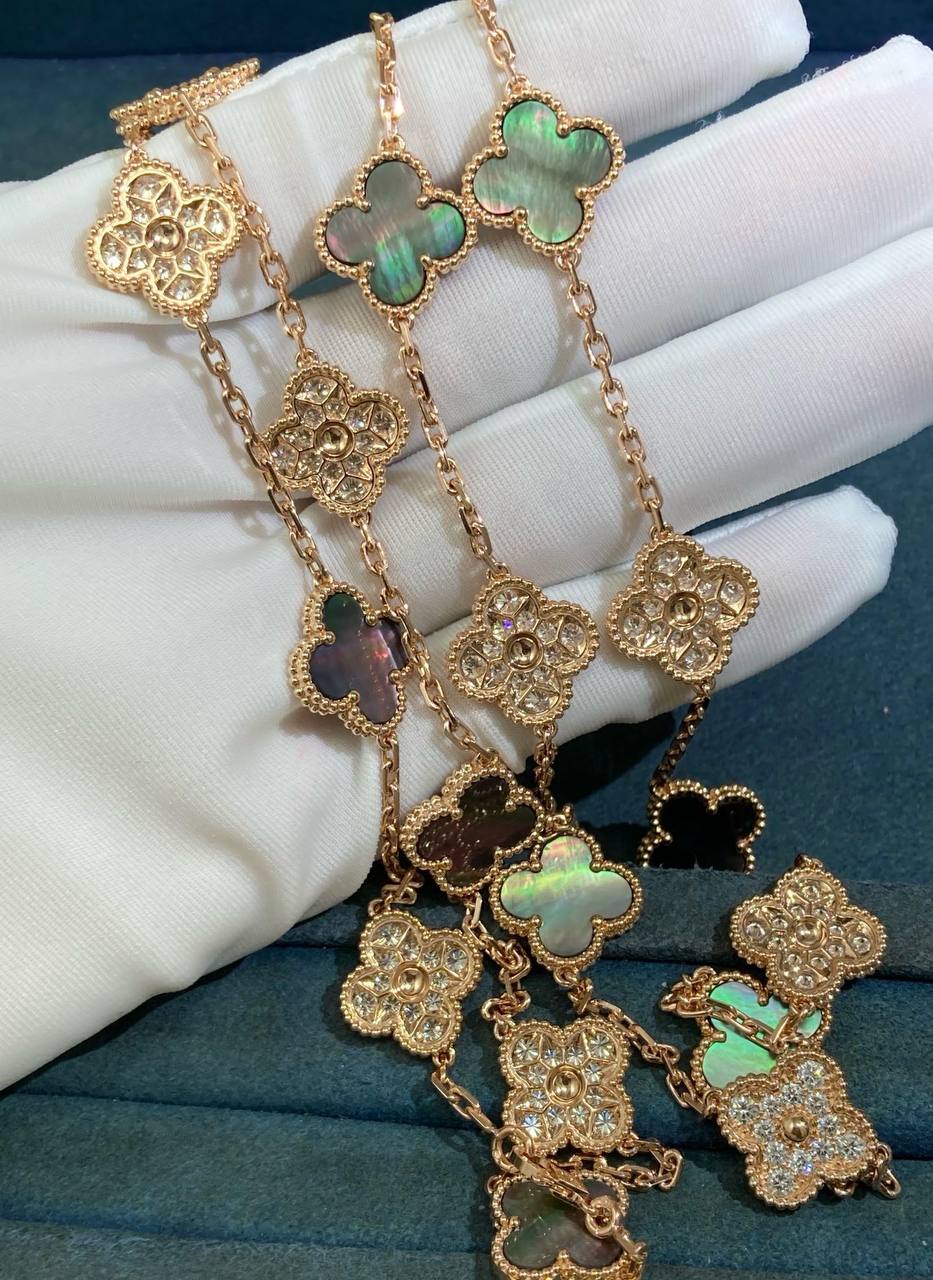 Absolutely exquisite and exceptionally rare, this limited-edition necklace is a highly collectible masterpiece. Crafted in 18K rose gold, it features 20 iconic motifs—10 set with luminous grey mother-of-pearl and 10 fully pavé-set with sparkling diamonds. Versatile in design, the necklace can be elegantly worn as a single strand or doubled for a layered look.