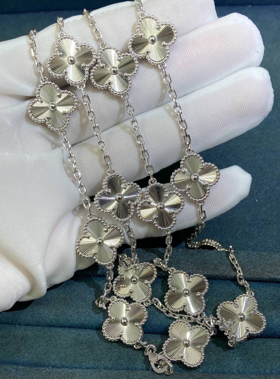 This iconic creation features 20 meticulously crafted clover motifs, bringing timeless elegance to any collection. Expertly fashioned in solid 18K white gold, the necklace is finished with a secure lobster clasp for both style and functionality.
