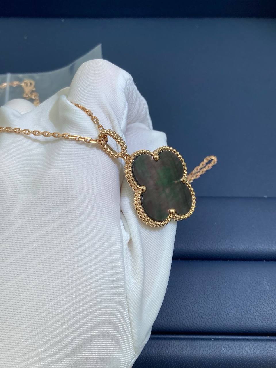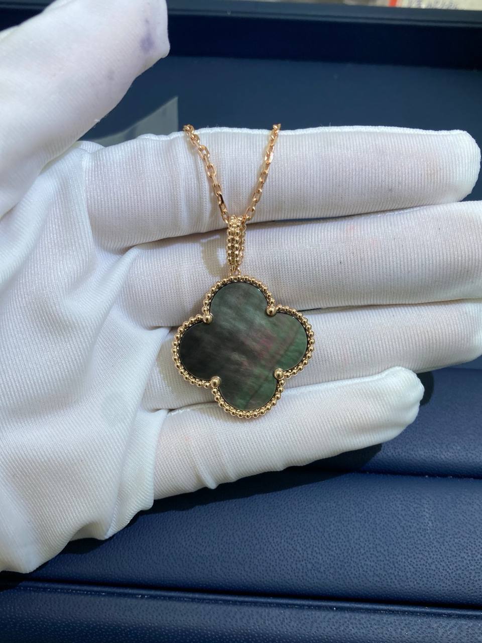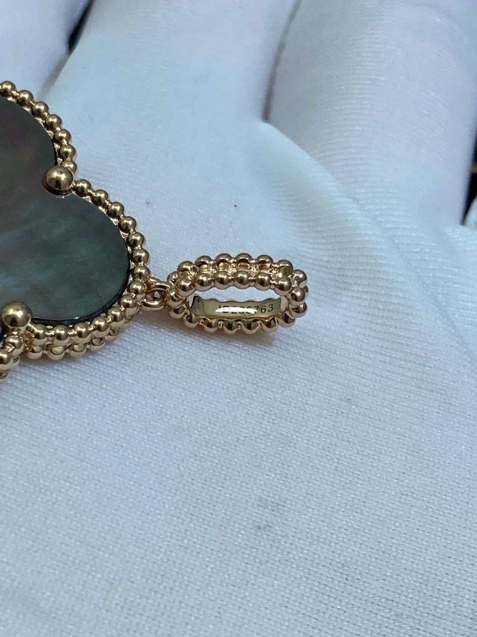 This sophisticated necklace, crafted in 18K rose gold, showcases the iconic four-leaf clover motif with a lustrous grey mother-of-pearl inlay, elegantly framed by a finely beaded edge. Suspended from a 35-inch rectangular trace link chain, the design exudes timeless elegance and is finished with a secure hallmark clasp and loop.