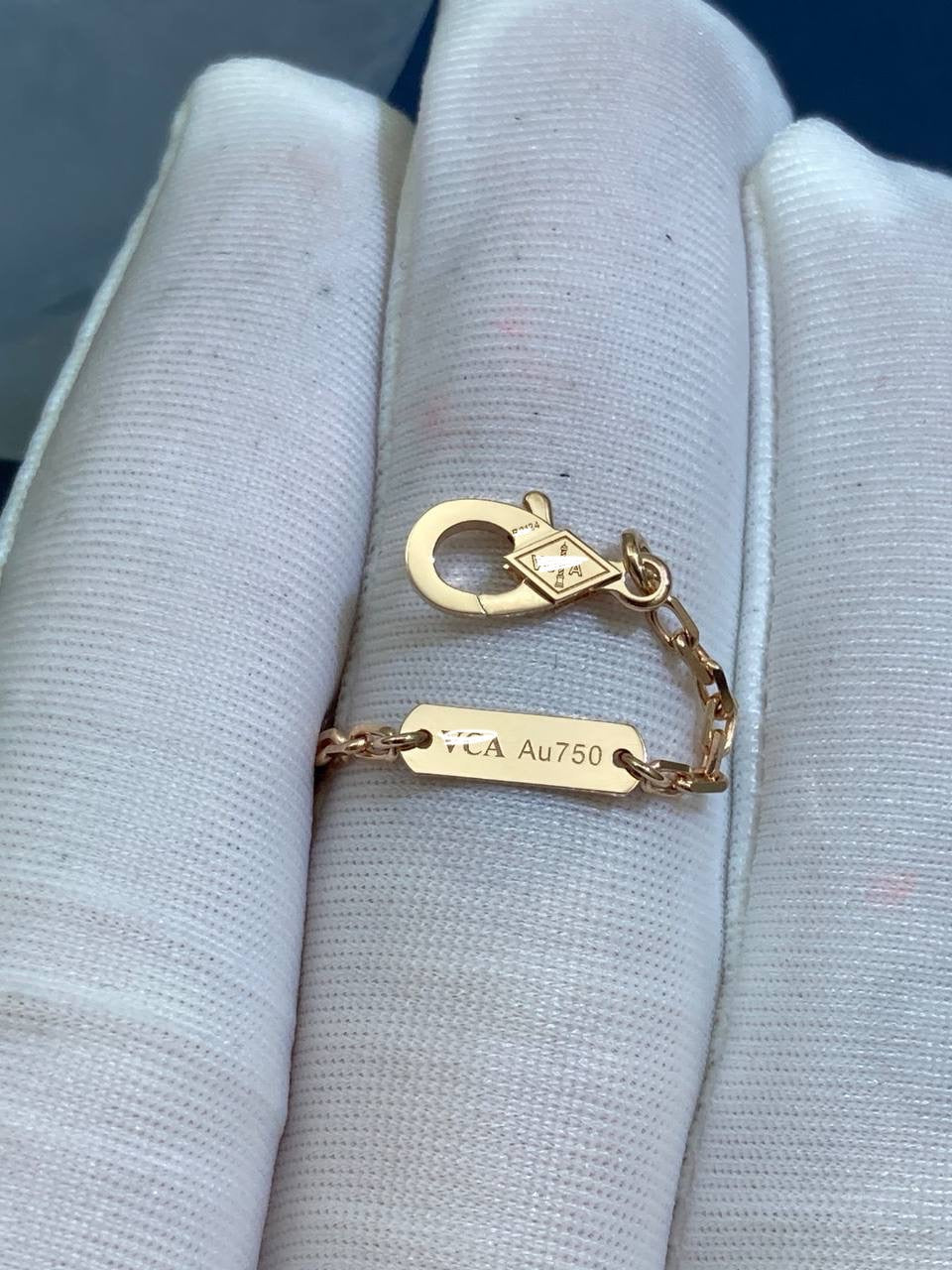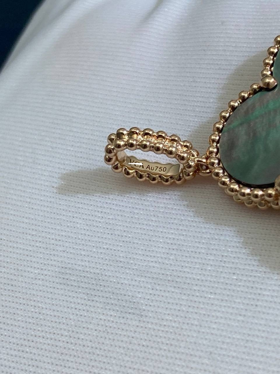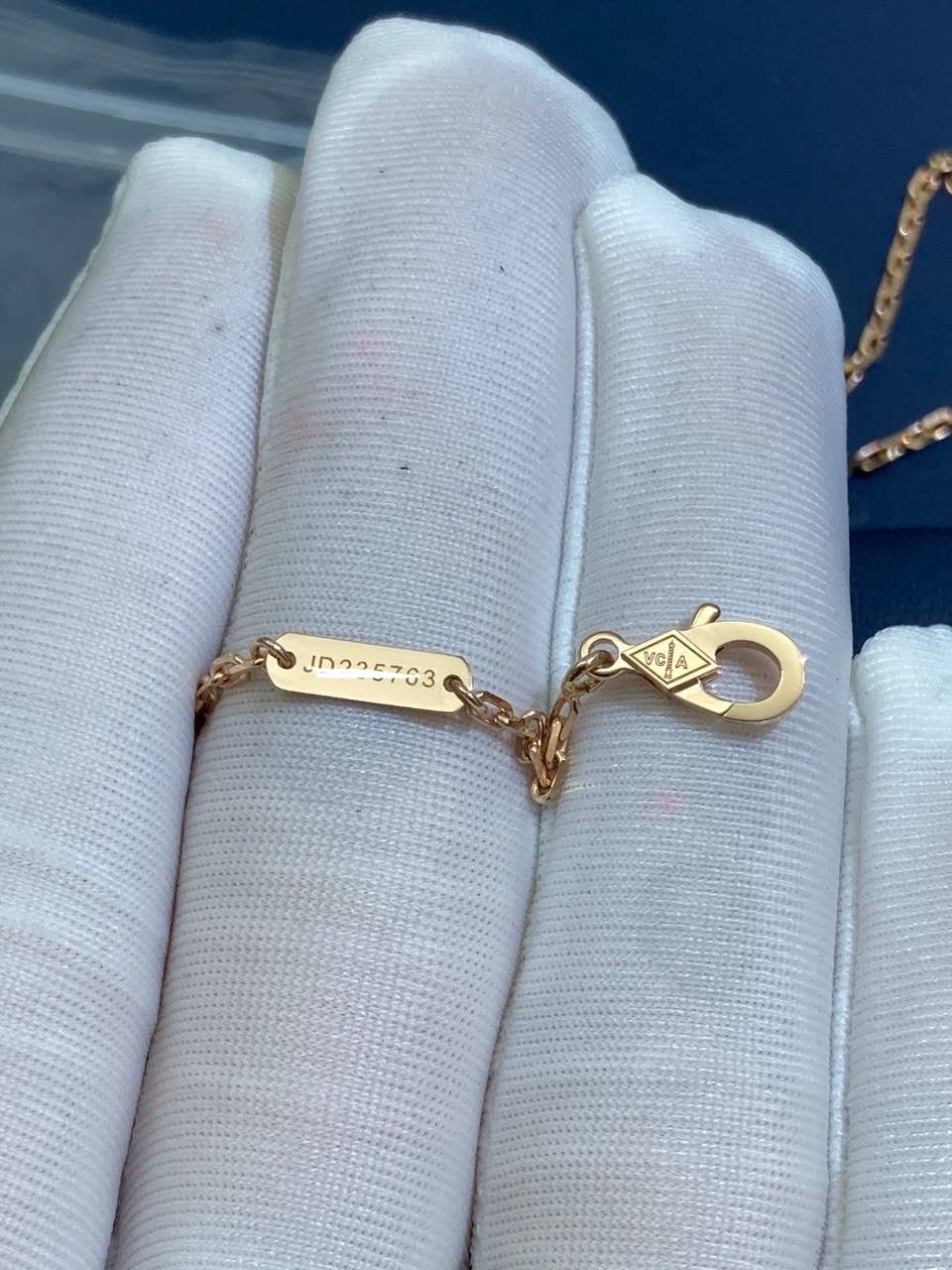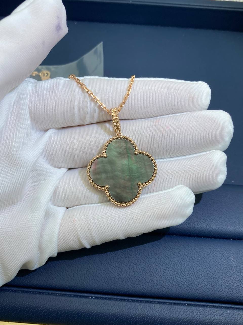 This sophisticated necklace, crafted in 18K rose gold, showcases the iconic four-leaf clover motif with a lustrous grey mother-of-pearl inlay, elegantly framed by a finely beaded edge. Suspended from a 35-inch rectangular trace link chain, the design exudes timeless elegance and is finished with a secure hallmark clasp and loop.