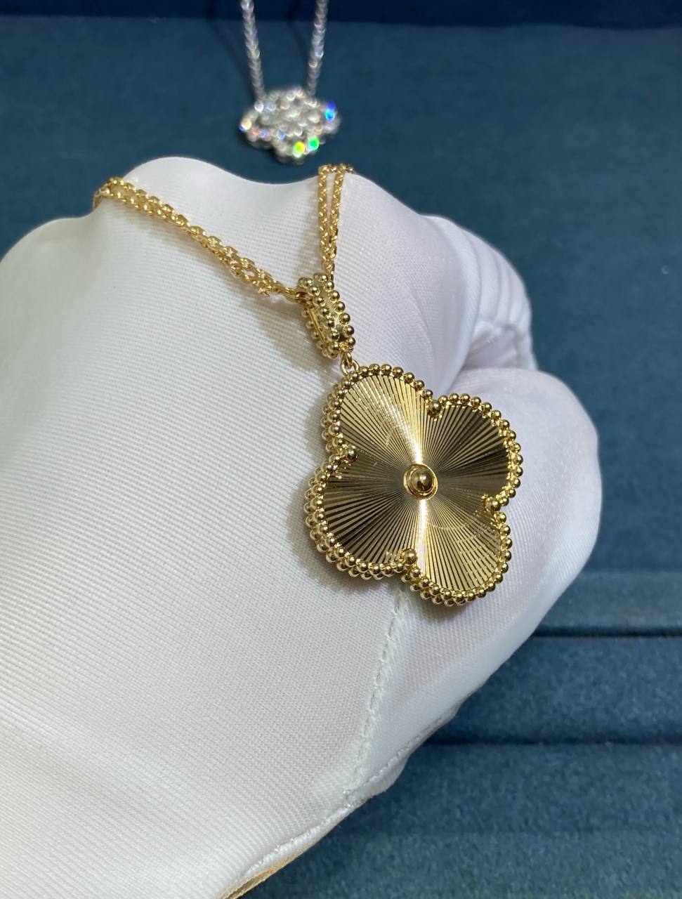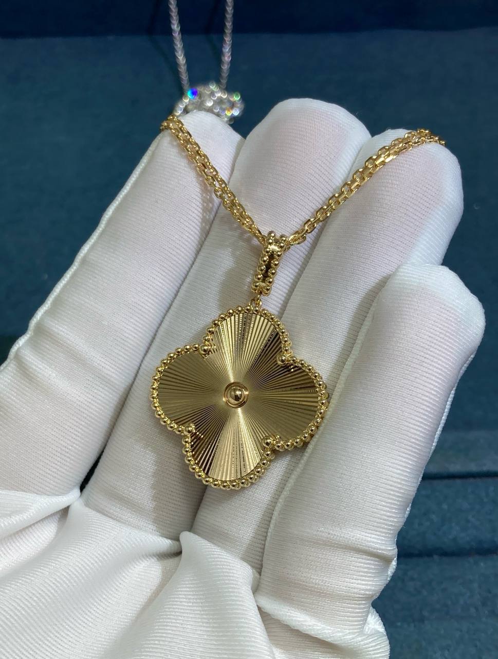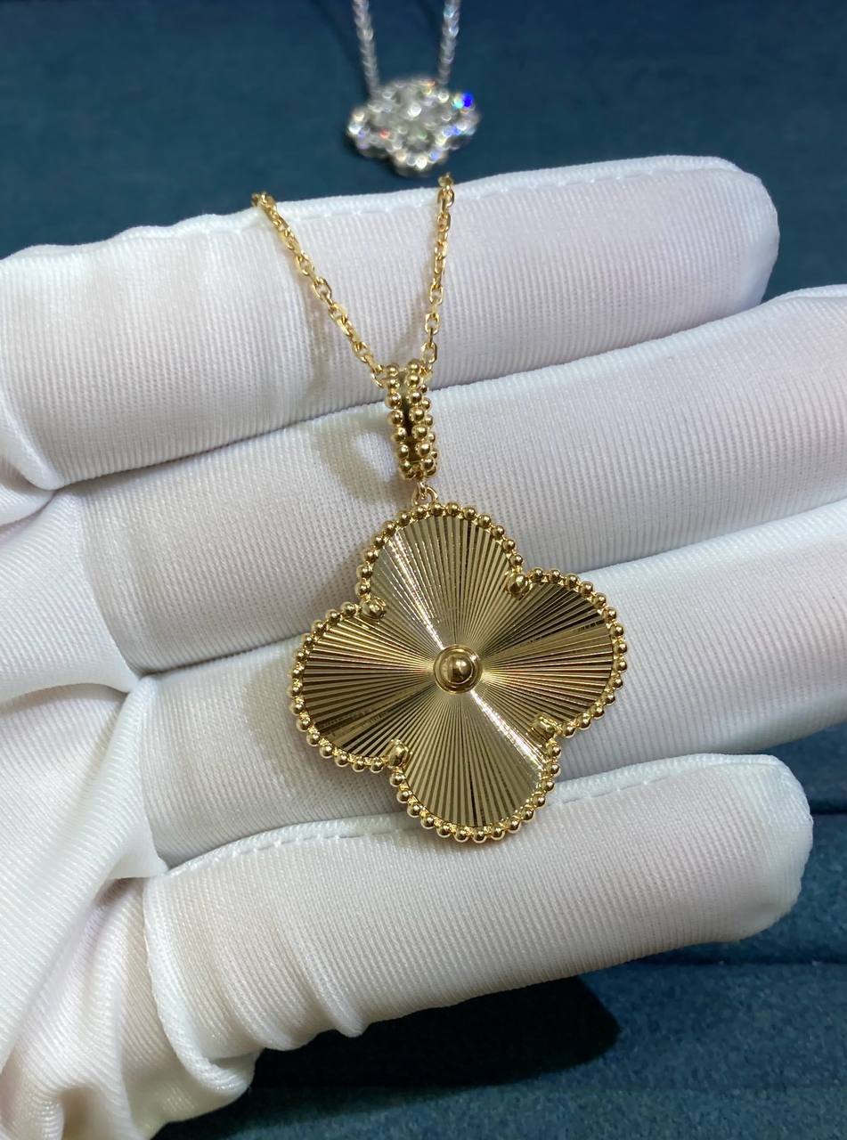 This necklace is a handcrafted work of art, created using the timeless guilloché technique. The intricate engraving, inspired by the sun’s rays, captures light from every angle, making the 18K yellow gold glow with radiant warmth.