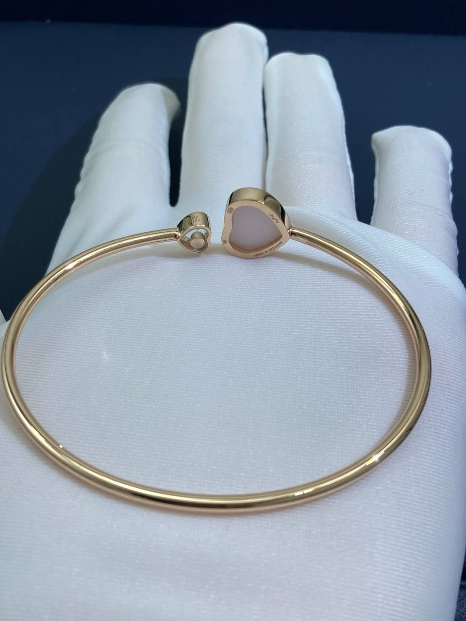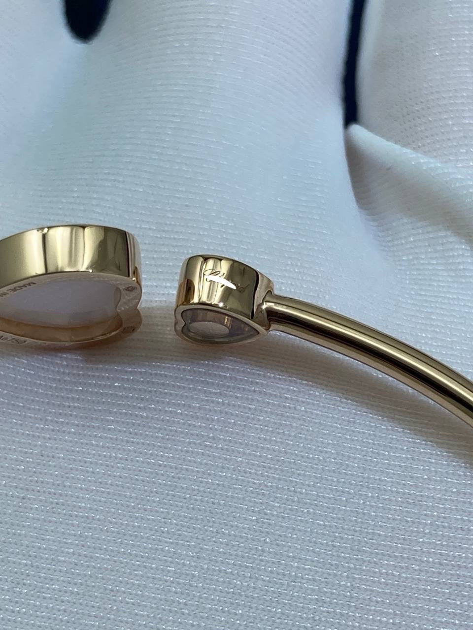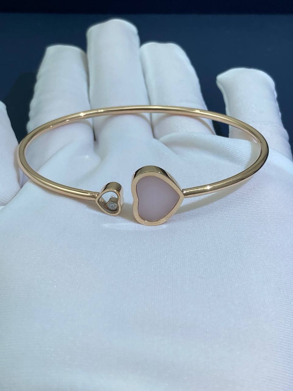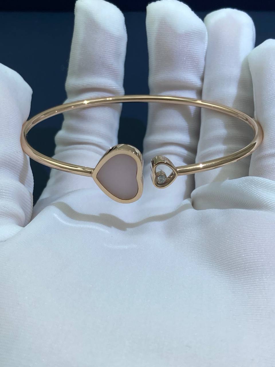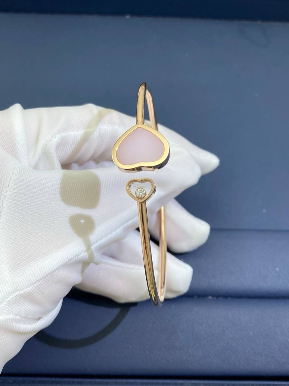 This elegant 18K rose gold bangle is a romantic celebration of love and cherished moments. One end is adorned with a larger heart in soft pink opal, while the other features a smaller heart encasing a free-moving diamond. Playful yet refined, it captures the joyful spirit of love with timeless charm.