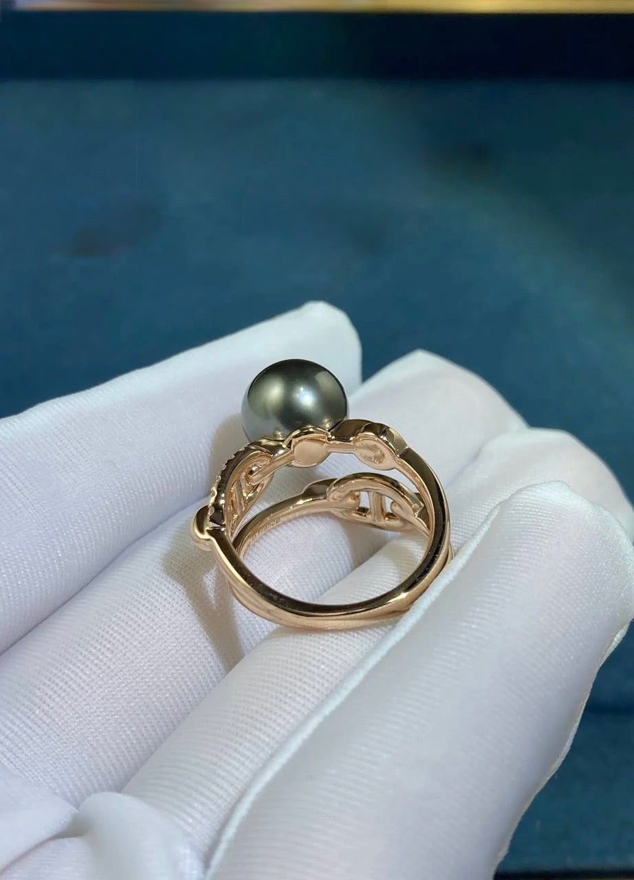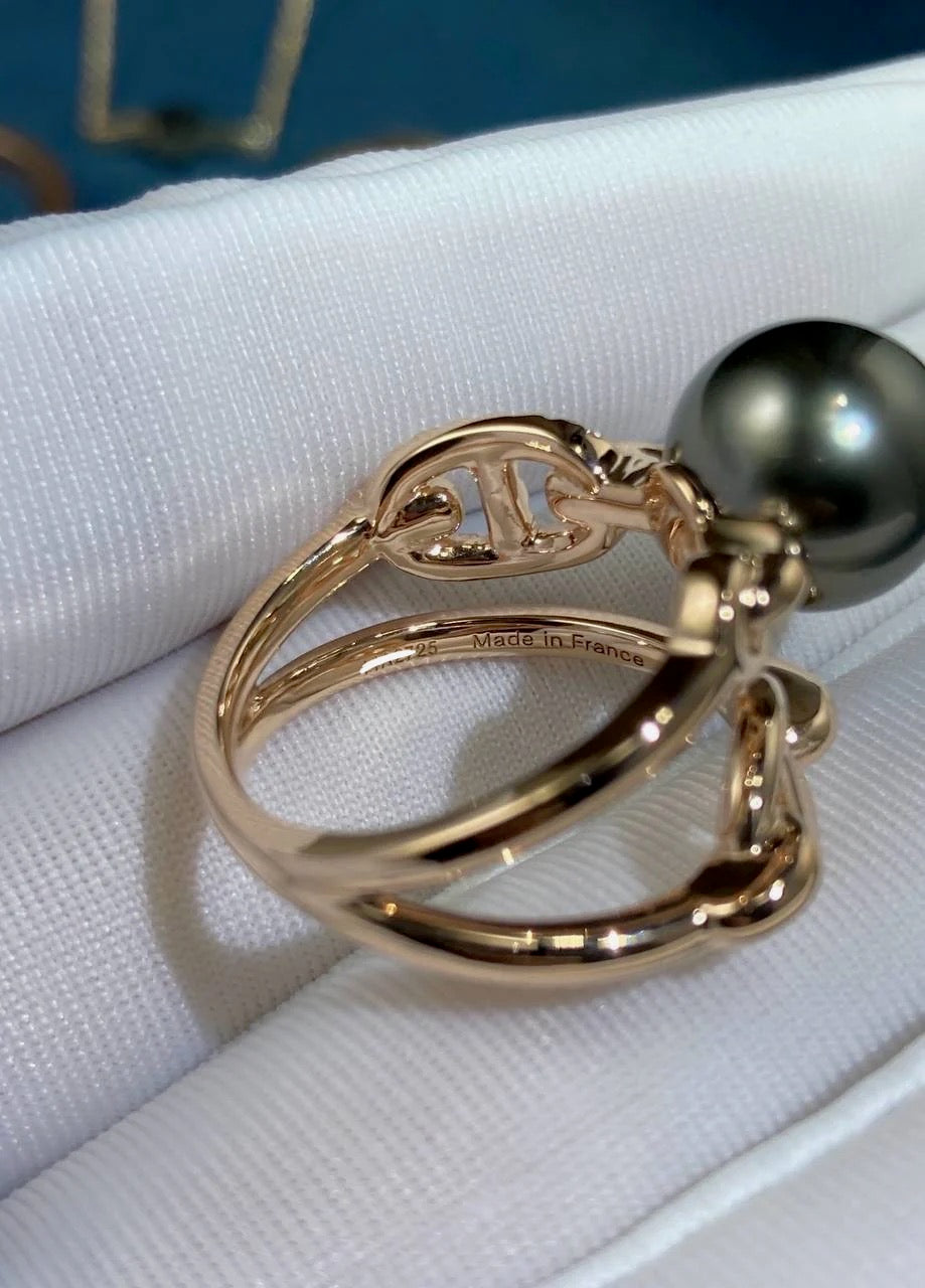 This exquisite ring is artfully crafted in 18k rose gold, showcasing the captivating beauty of a grey Tahitian pearl. Its luminous surface is perfectly complemented by pavé-set diamonds, adding a subtle brilliance that enhances the pearl’s natural allure. Elegant and distinctive, it is a timeless statement of refined sophistication.