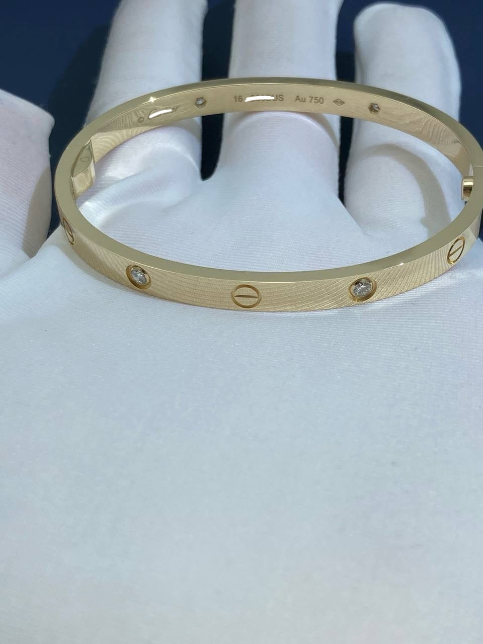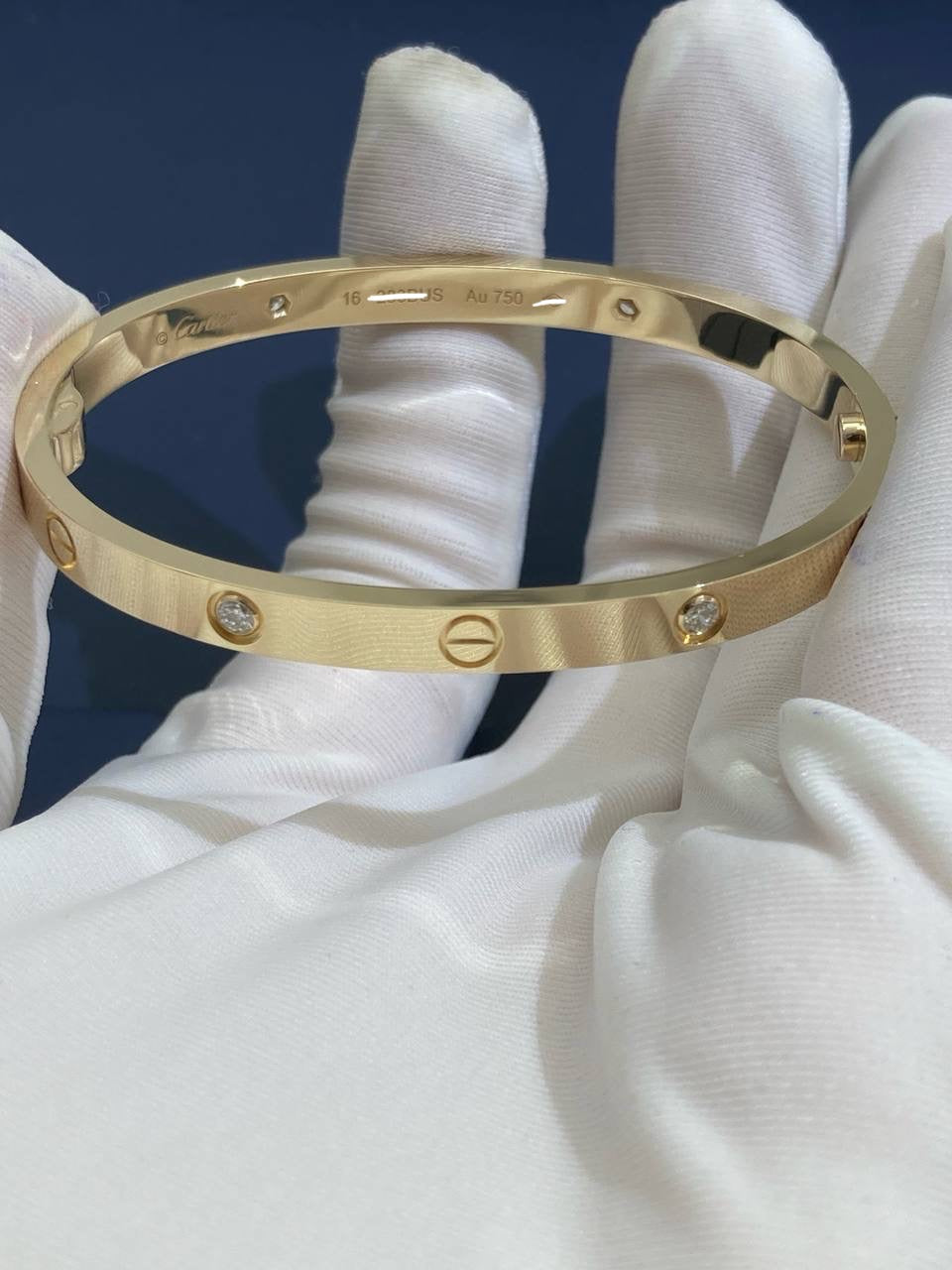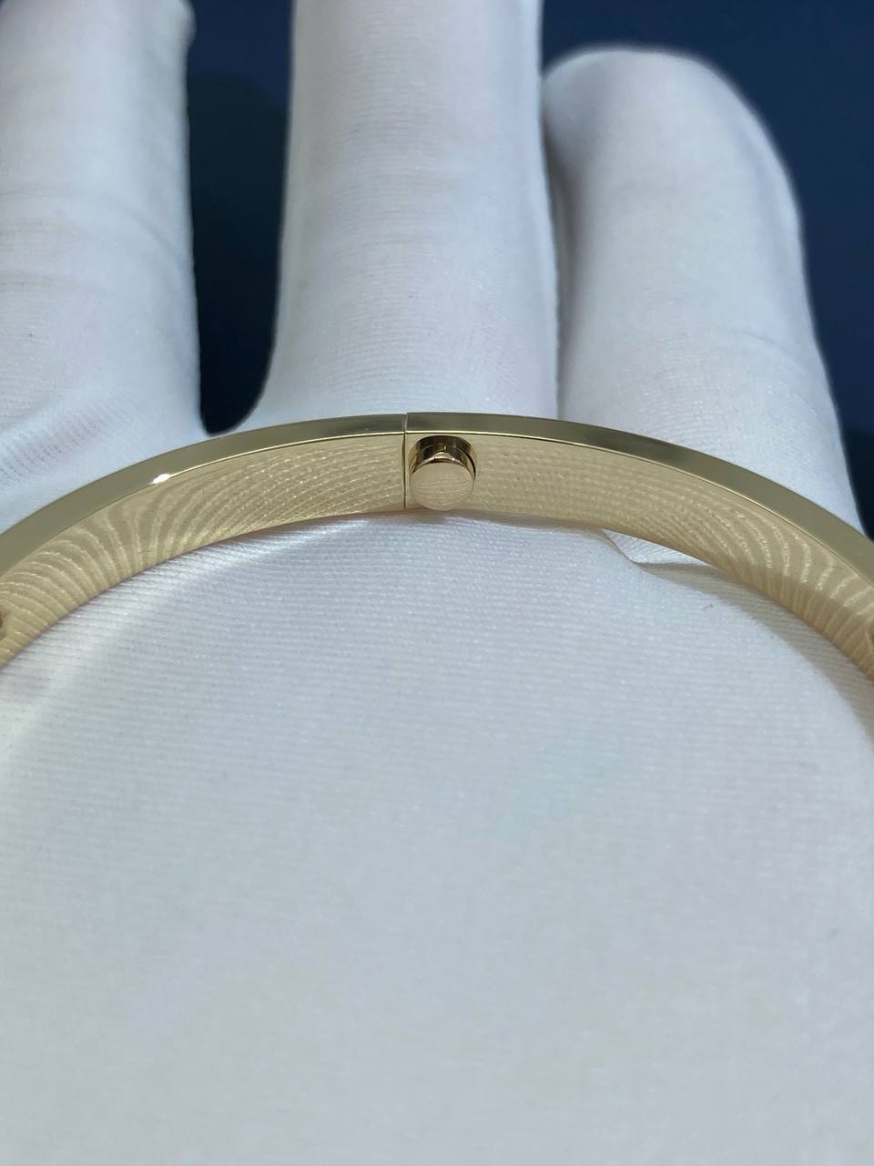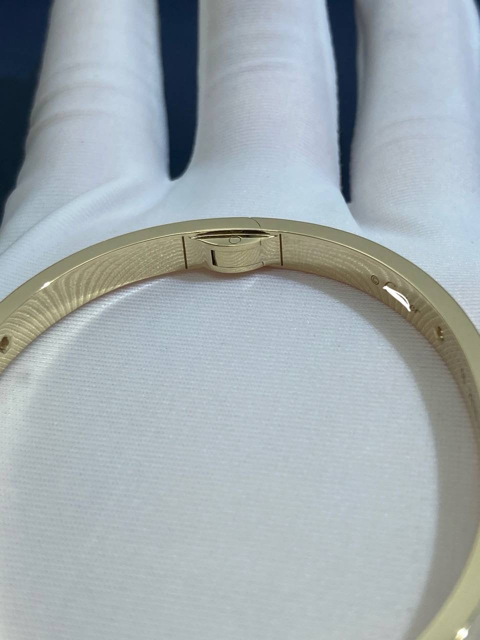 This Love Bracelet, small model, is crafted in 18k yellow gold and set with six brilliant-cut diamonds totaling 0.15 carats. A timeless symbol of devotion, its signature screw motif and elegant design make it both iconic and intimate. Sleek, refined, and effortlessly luxurious, it’s perfect for daily wear or stacking with other fine pieces.