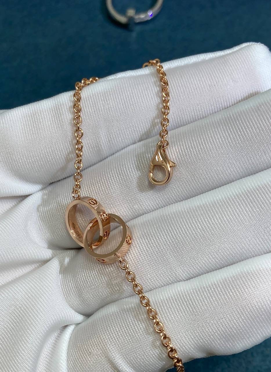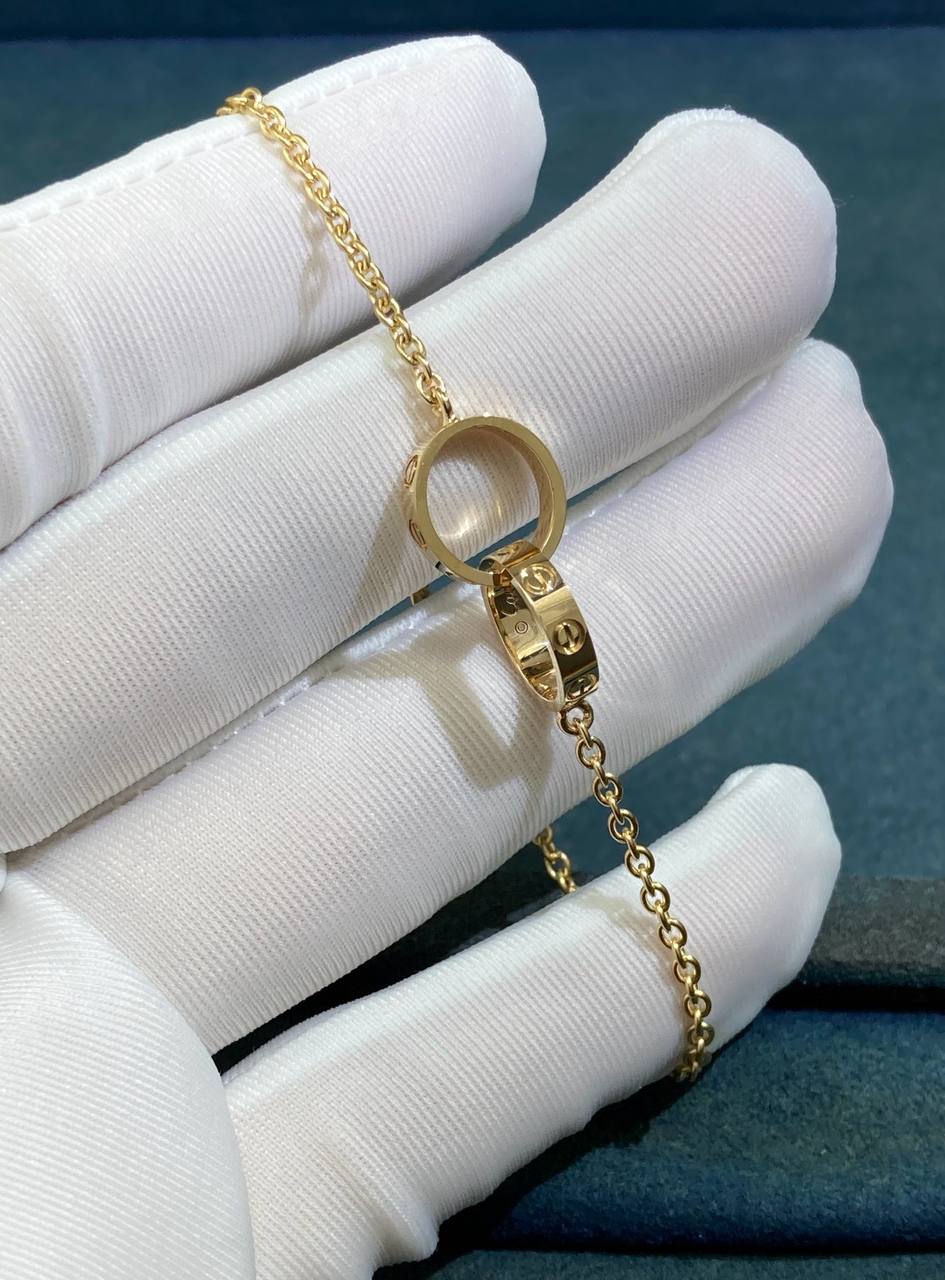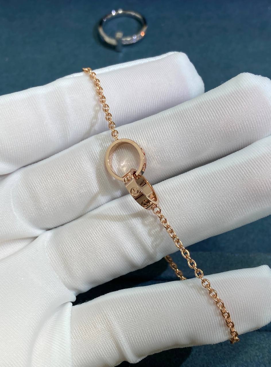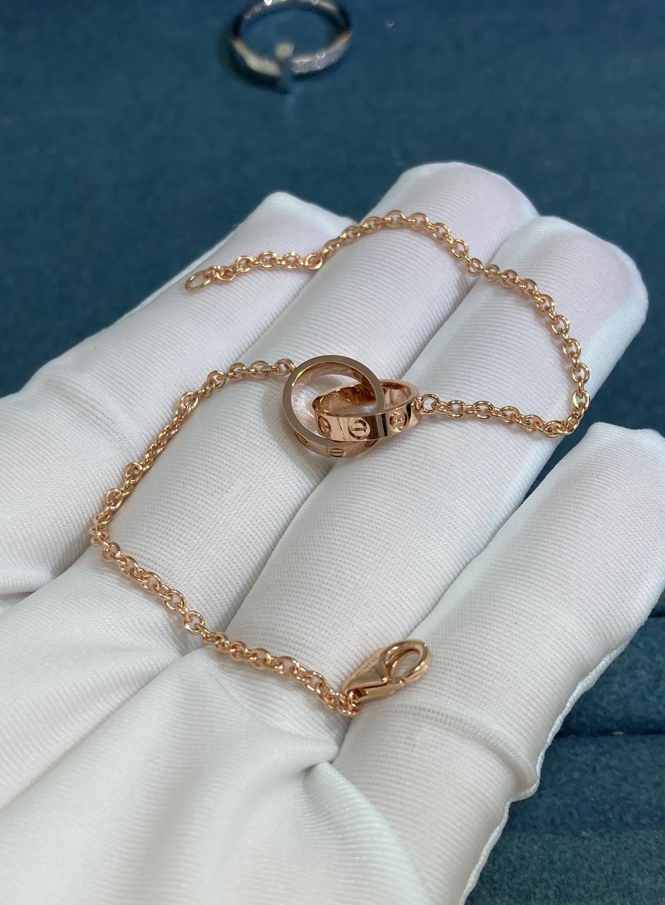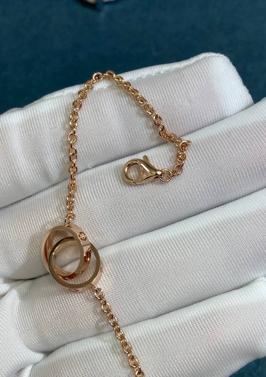 This exquisite bracelet, crafted in 18k gold, is affectionately known as the Baby Love Bracelet. Its design features two interlocking Love rings, symbolizing unity and timeless connection, gracefully set on a delicate oval link cable chain secured with a refined lobster clasp.