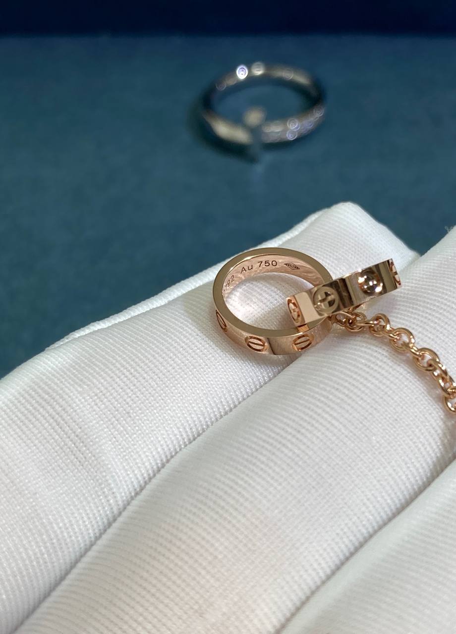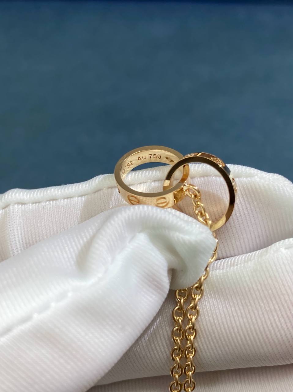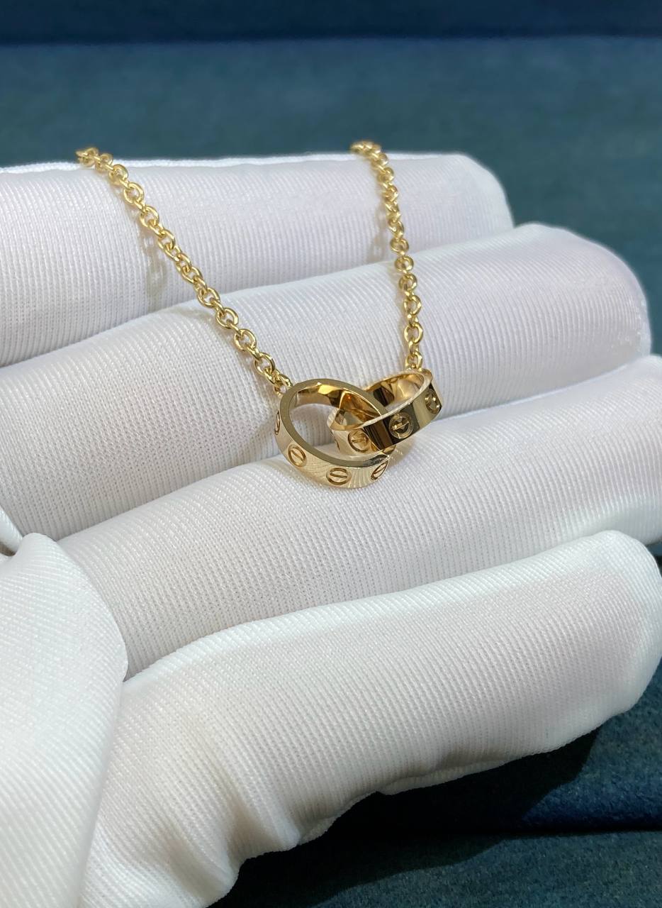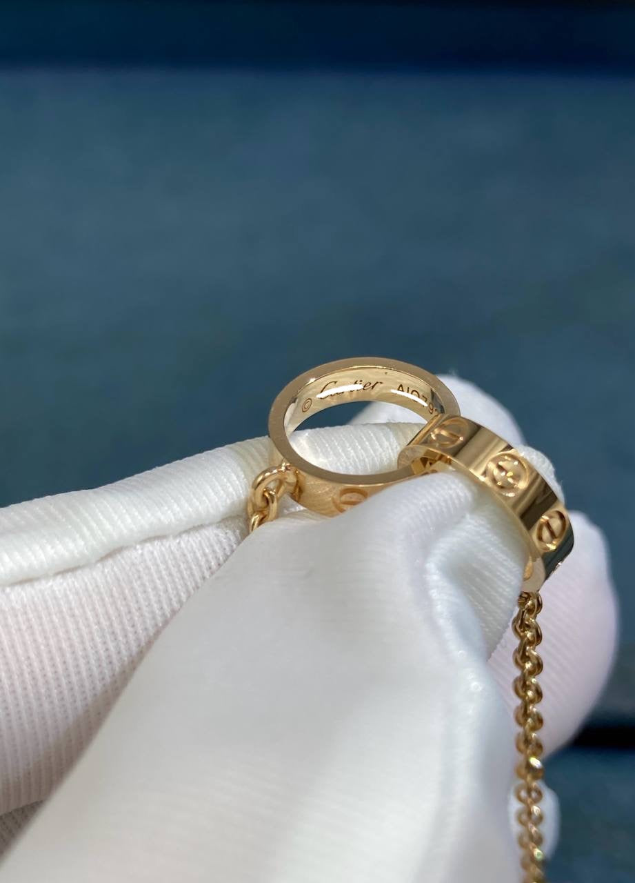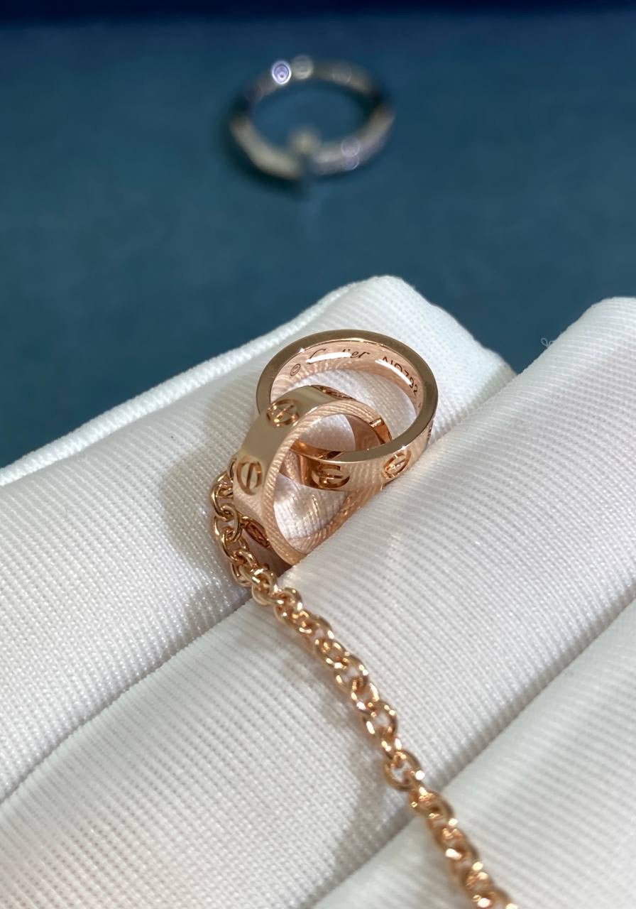 This exquisite bracelet, crafted in 18k gold, is affectionately known as the Baby Love Bracelet. Its design features two interlocking Love rings, symbolizing unity and timeless connection, gracefully set on a delicate oval link cable chain secured with a refined lobster clasp.