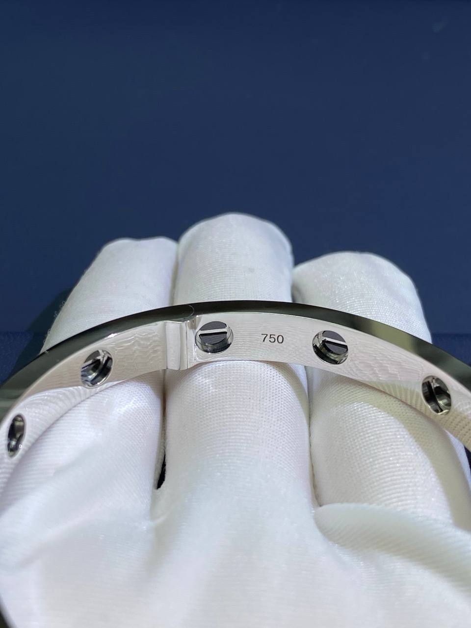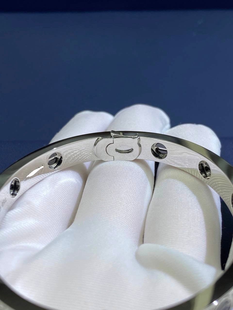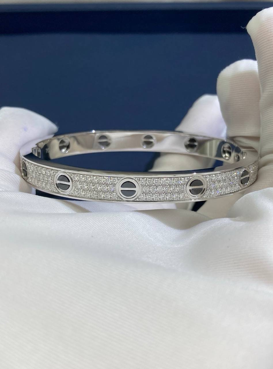 A striking 18k white-gold bracelet crafted in an iconic Love-inspired design, combining ceramic detailing with a luxurious pavé diamond finish. Black ceramic inlays accentuate the signature screw motifs along the outer edge, while 204 round brilliant-cut diamonds are expertly pavé-set between each element, creating a seamless shimmer. The bracelet is fitted with a hinged opening, a secure push clasp, and an additional safety clasp for added confidence and comfort.