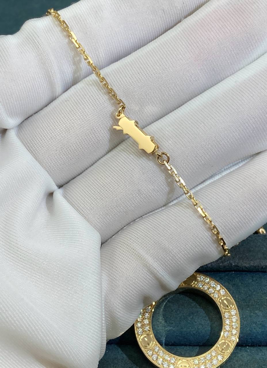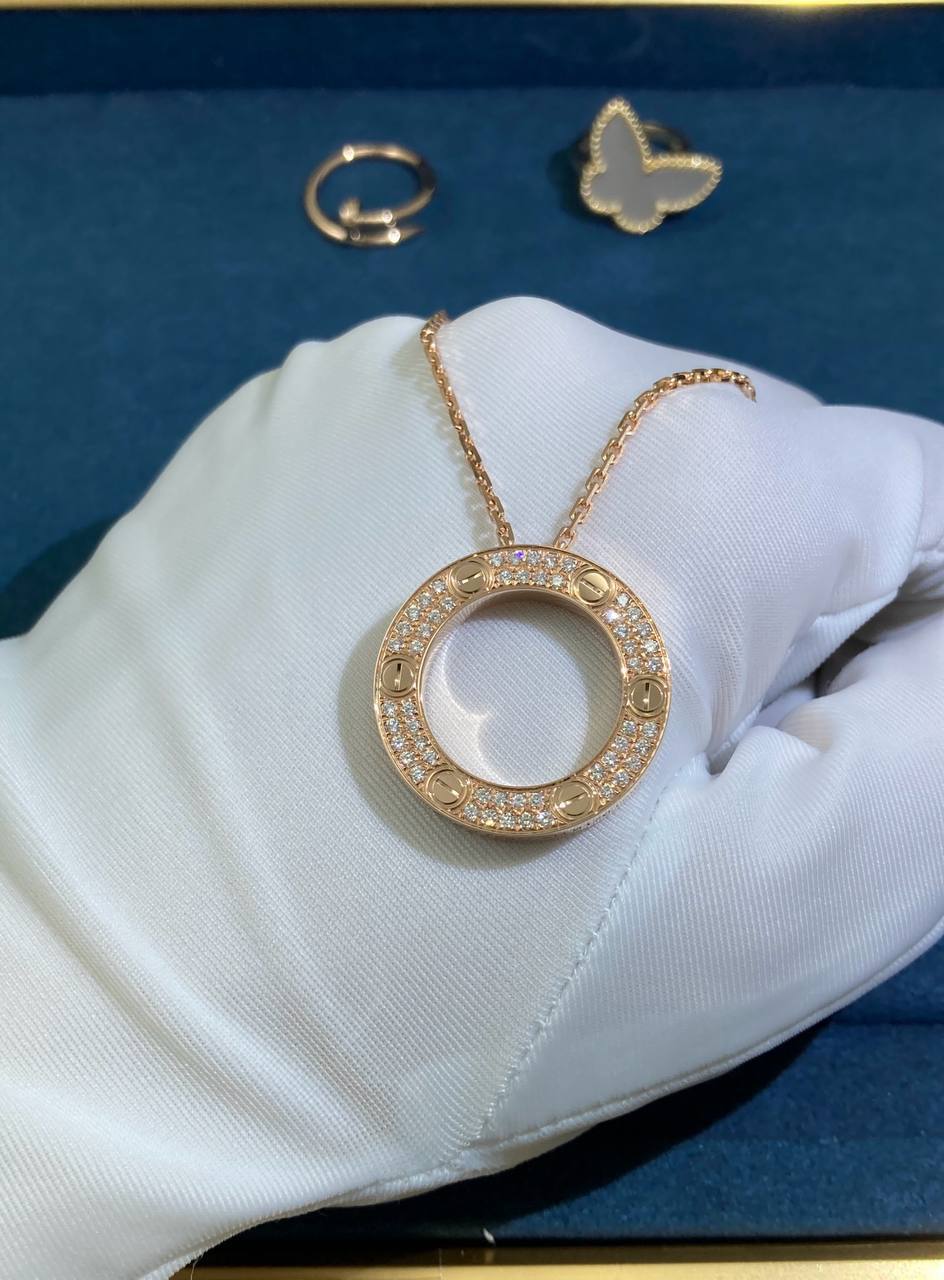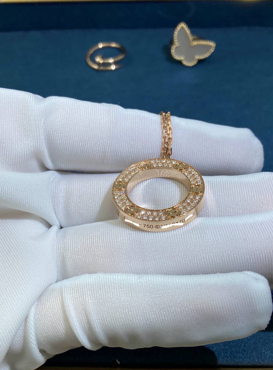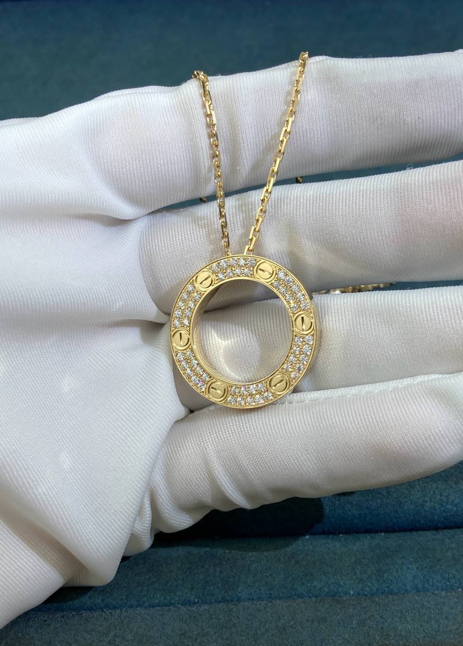 Celebrate timeless love with this exquisite 18K gold necklace. The chain features a circular ring pendant, adorned with the iconic screw motifs and 54 pavé-set brilliant-cut diamonds totaling approximately 0.34ct. Each piece from the LOVE collection is a tribute to the feeling of eternal love, making this necklace a perfect reminder to cherish yourself—because self-love is just as important as love for others.