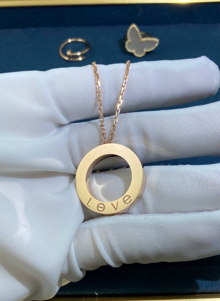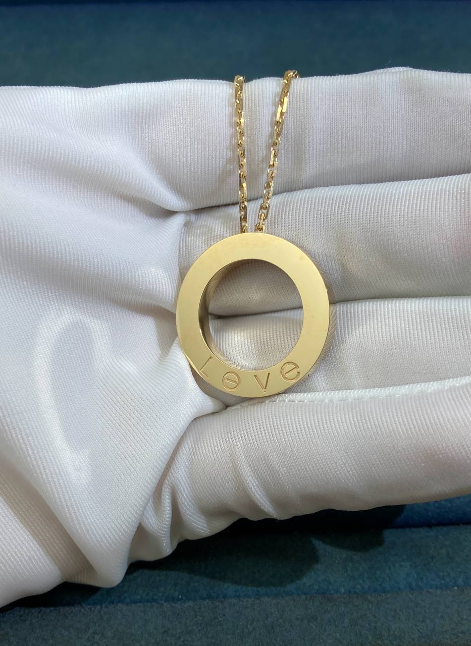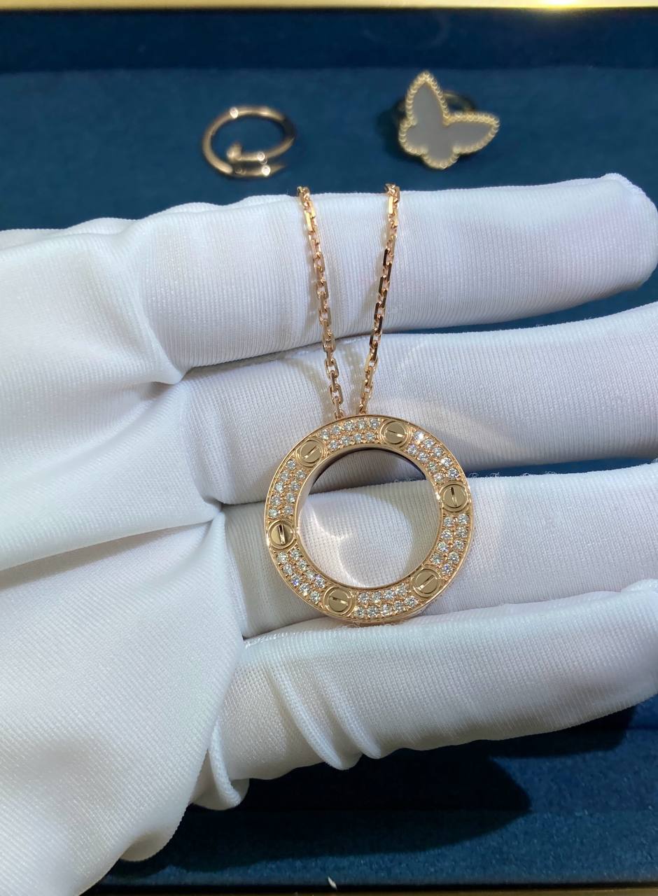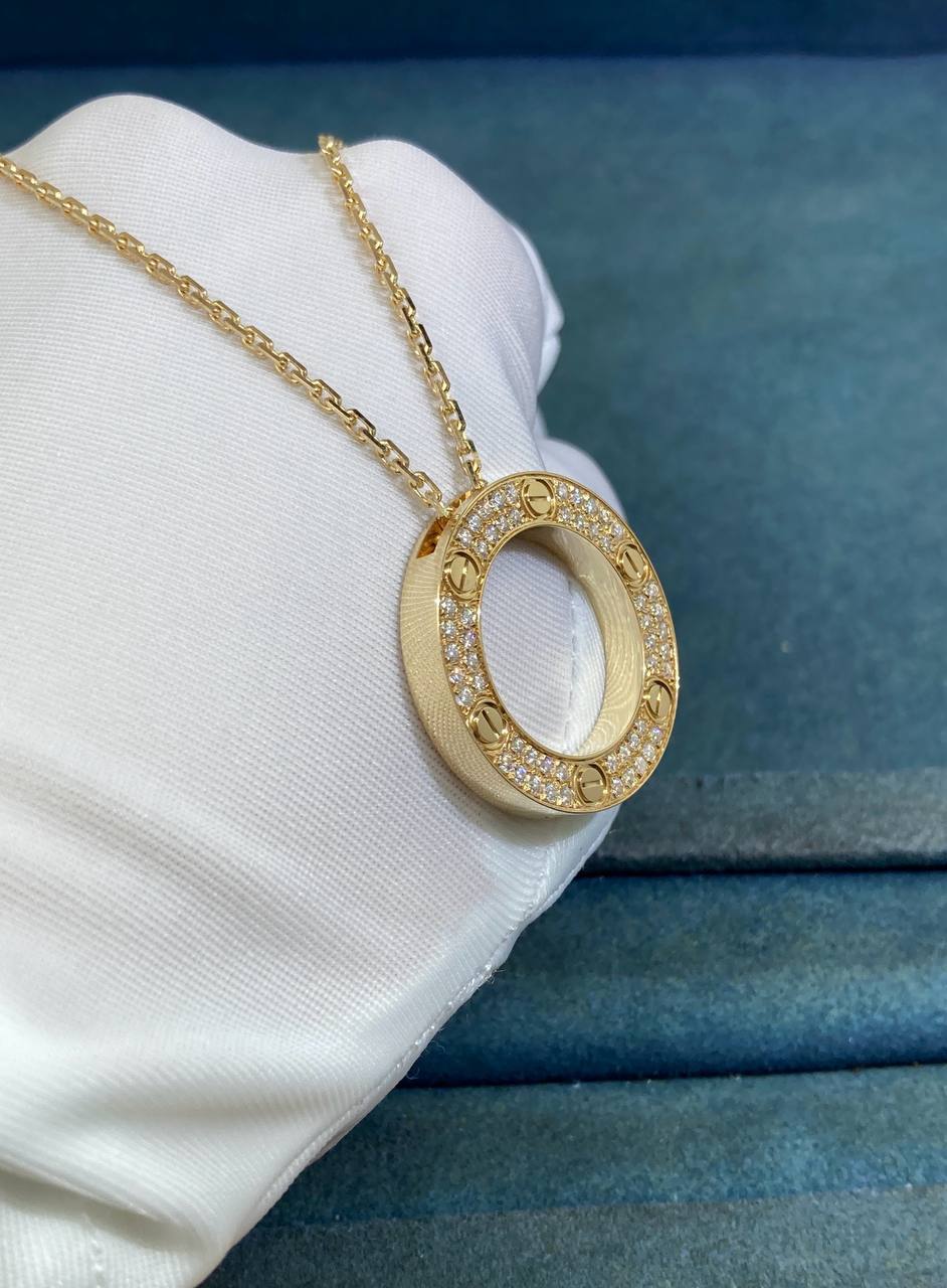 Celebrate timeless love with this exquisite 18K gold necklace. The chain features a circular ring pendant, adorned with the iconic screw motifs and 54 pavé-set brilliant-cut diamonds totaling approximately 0.34ct. Each piece from the LOVE collection is a tribute to the feeling of eternal love, making this necklace a perfect reminder to cherish yourself—because self-love is just as important as love for others.