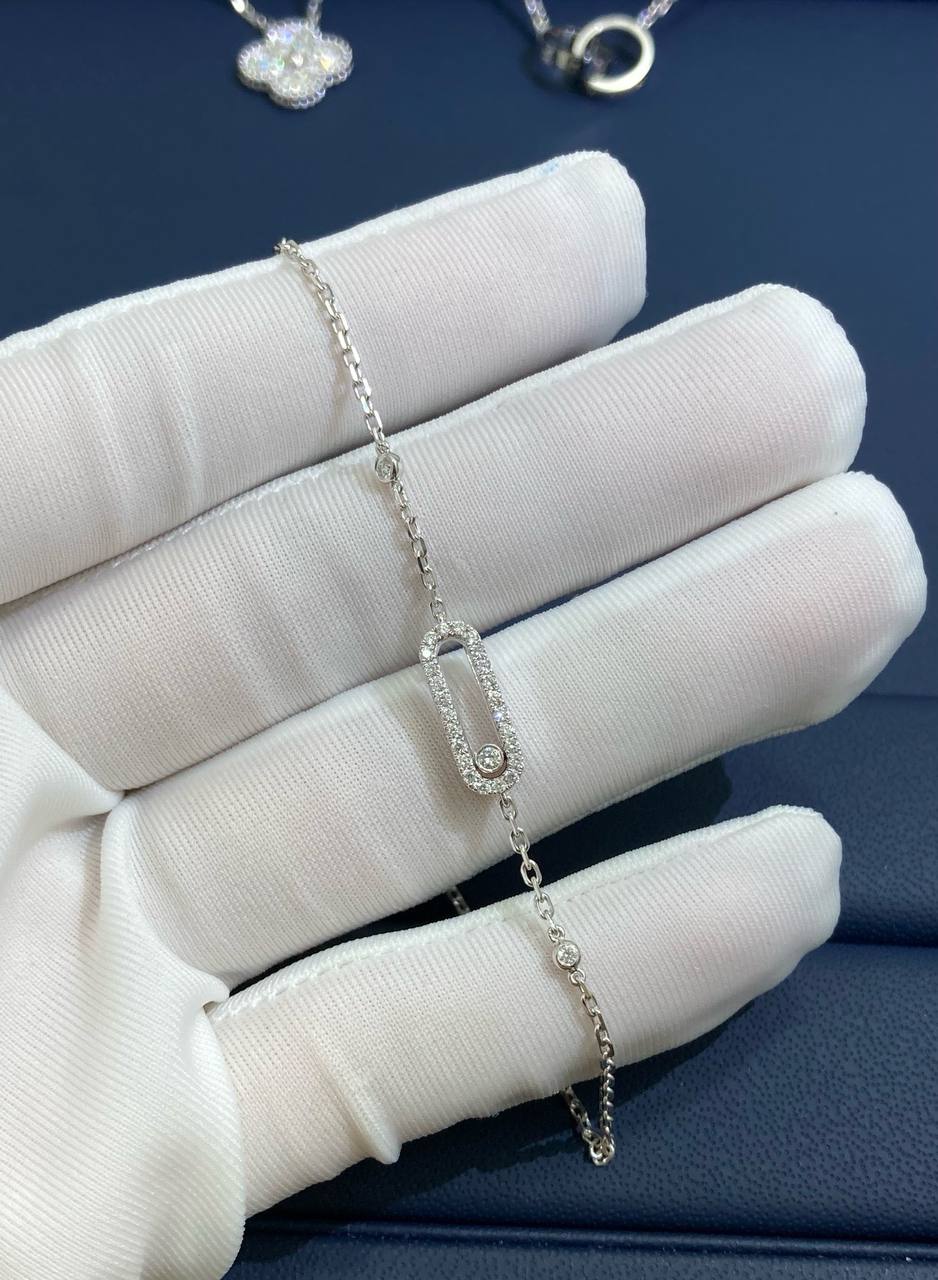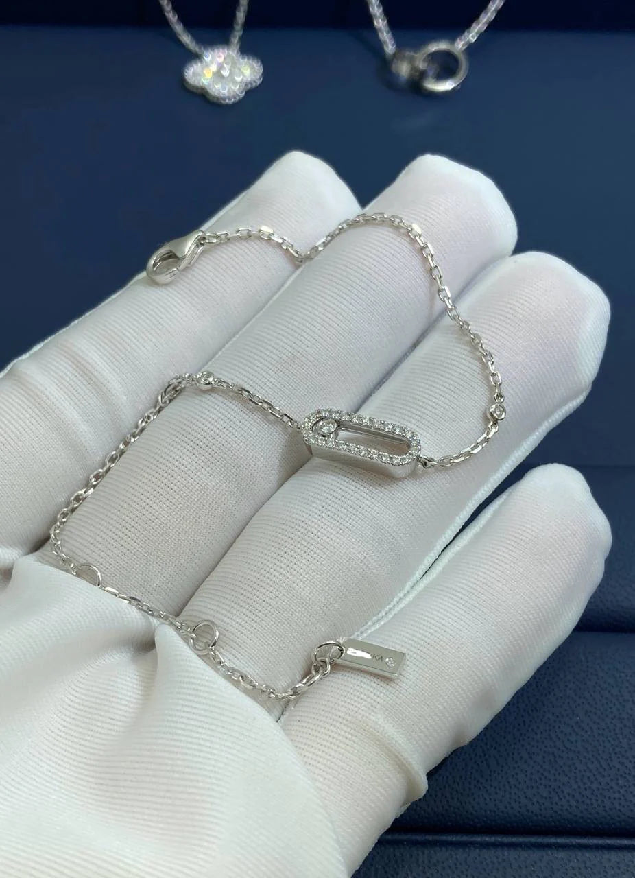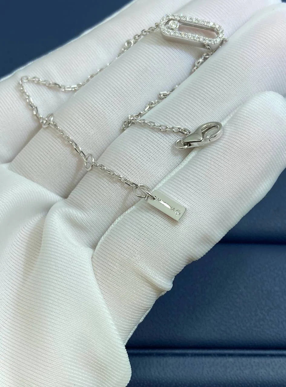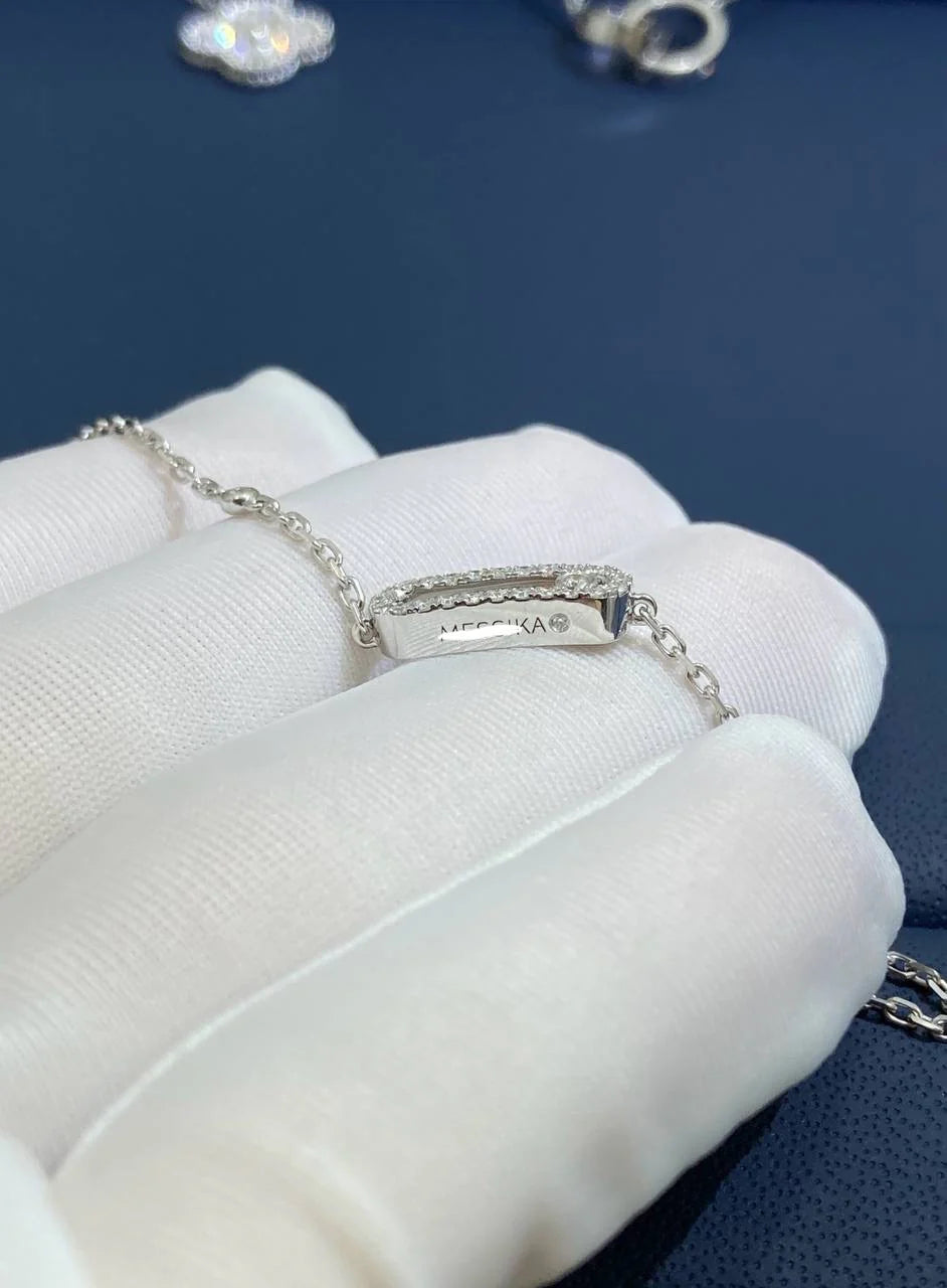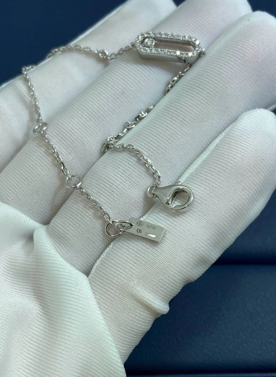 This iconic design embodies love and romance through three moving diamonds, brought to life in a creation that is both modern and timeless. Handcrafted in 18K gold, the bracelet features a sleek silhouette with a delicately sculpted central cage, its feminine curves pavé-set with diamonds. At its heart, three free-moving diamonds sparkle with every motion, symbolizing the love of yesterday, today, and tomorrow. Secured with a lobster clasp, this bracelet is a masterpiece of elegance and sentiment.