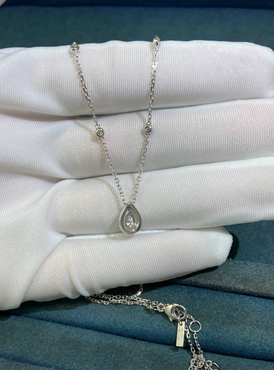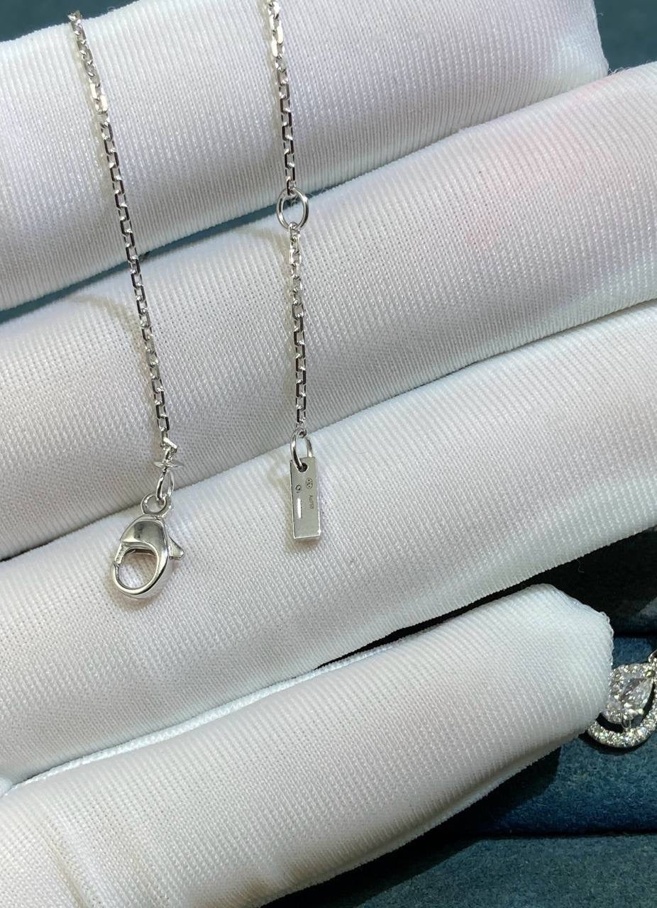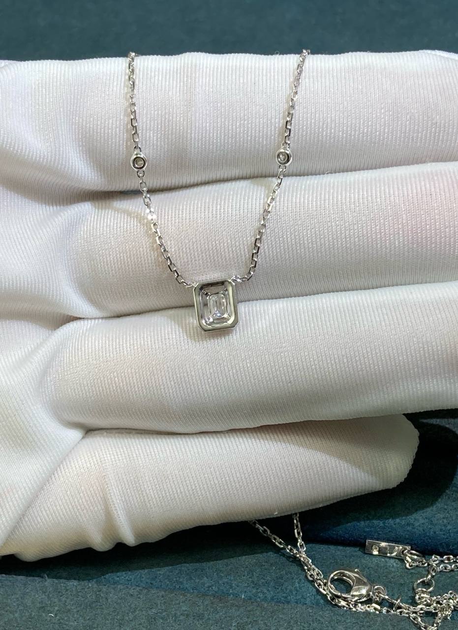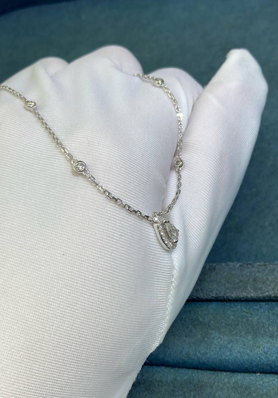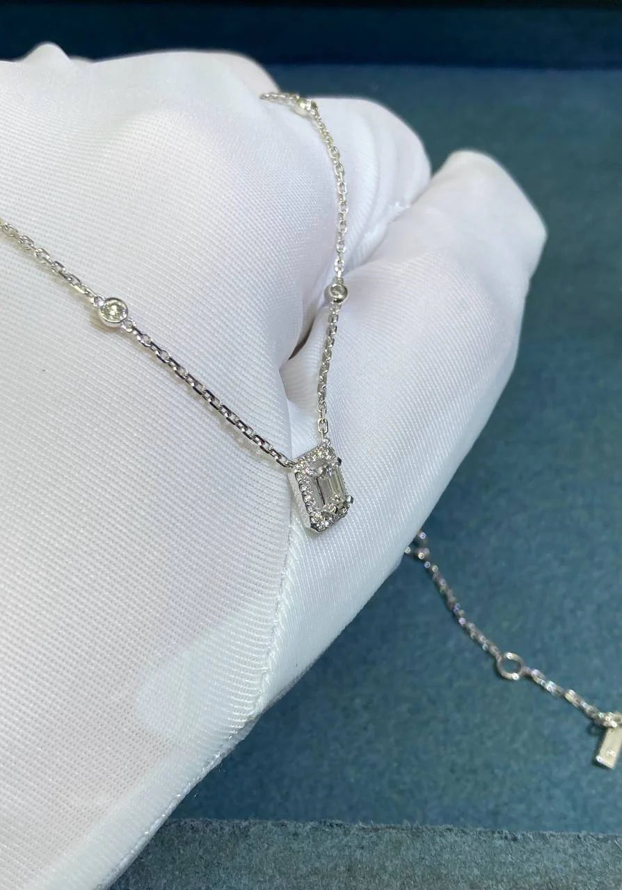 This refined two-row necklace in 18K white gold captures the contemporary elegance of layered jewelry. Featuring two chains of different lengths, it showcases a pear-cut diamond (0.20ct) and an emerald-cut diamond (0.20ct), each set like a luminous solitaire. Together, they dazzle with modern sophistication, while the radiant white gold enhances the purity and brilliance of the stones. A versatile piece, it transitions effortlessly from day to evening wear.