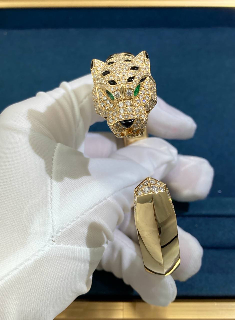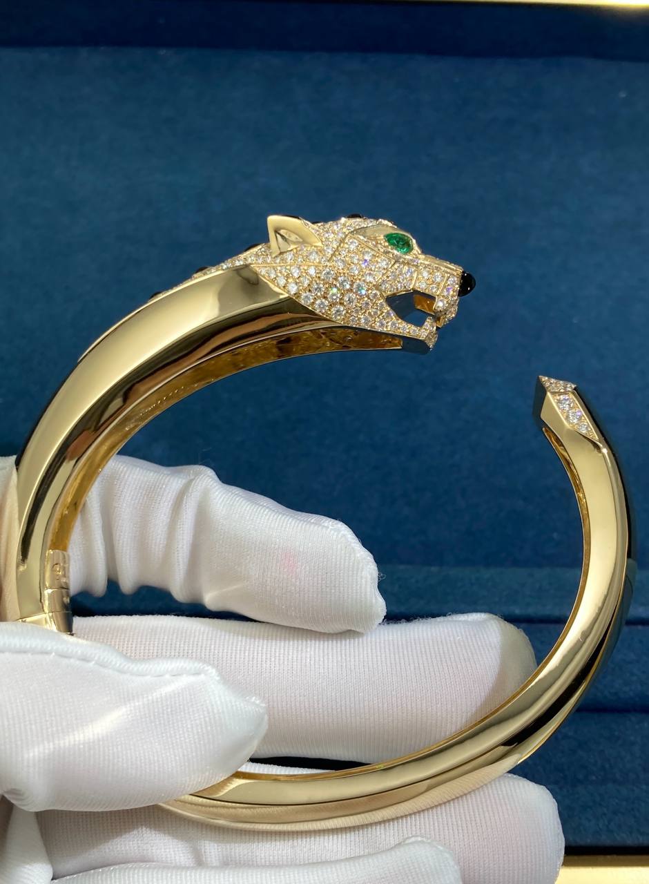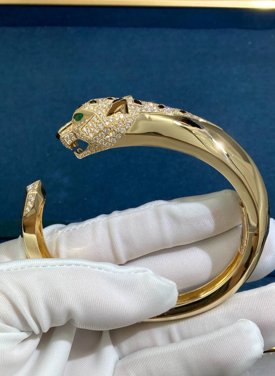Symbolizing power and elegance, the iconic panther makes a bold statement in this exquisite bracelet. Crafted in 18k yellow or white gold, it is adorned with 360 brilliant-cut diamonds totaling 4.33 ct, mesmerizing emerald eyes, and black onyx accents that evoke the feline’s distinctive spotted coat. A striking talisman of strength and sophistication, this bracelet is a captivating addition to any collection.