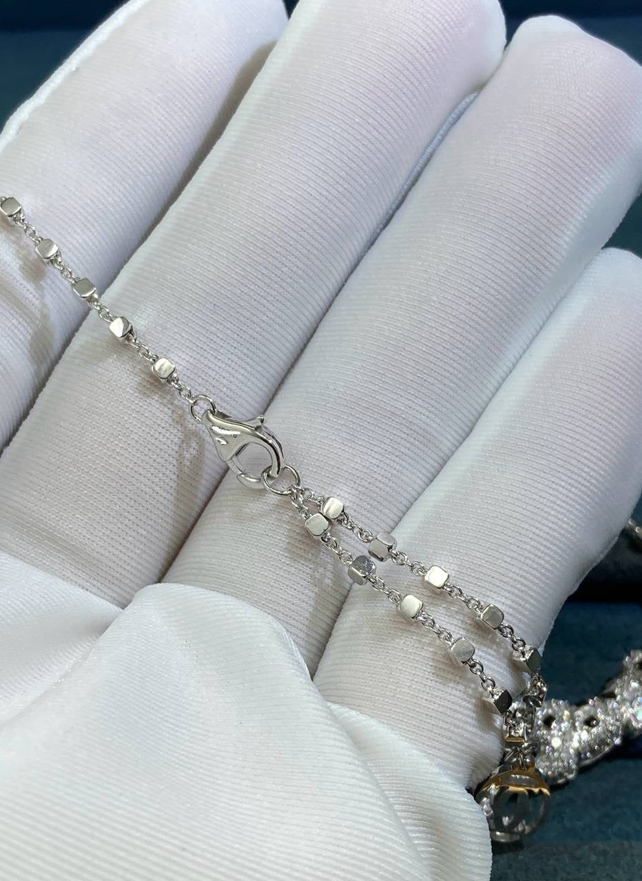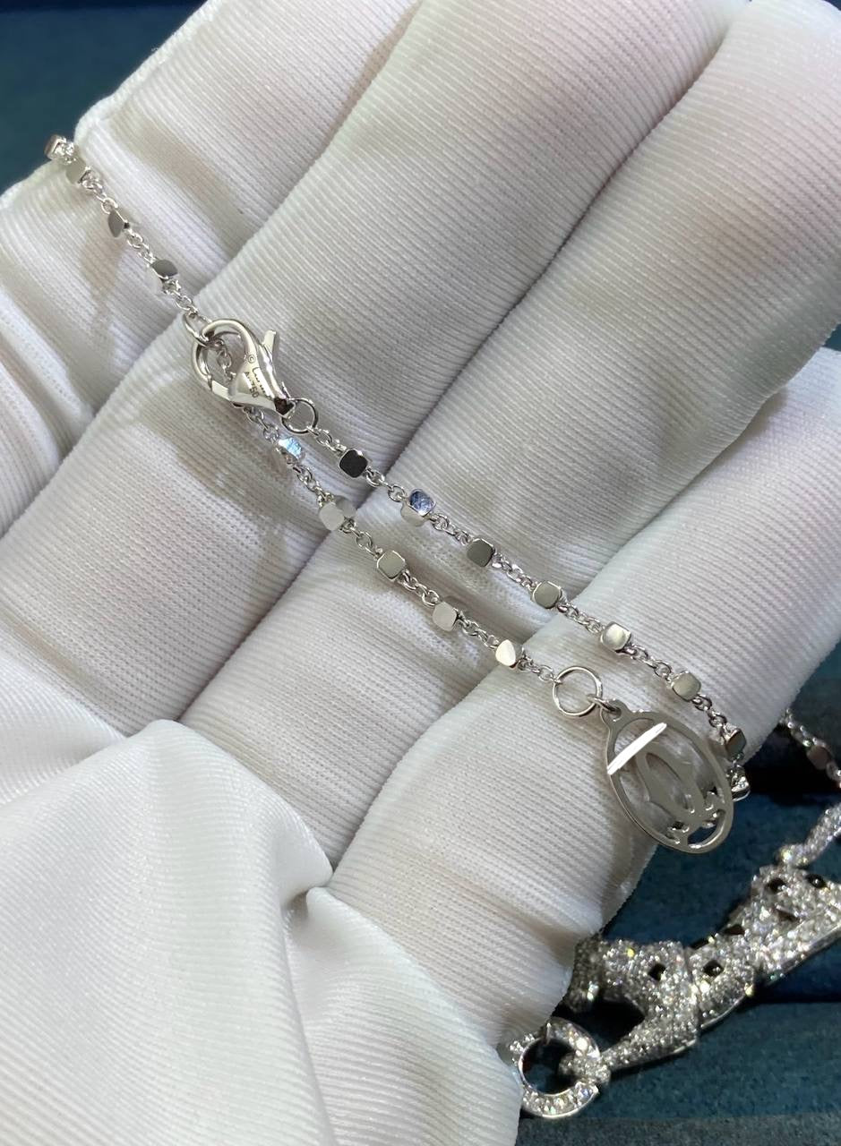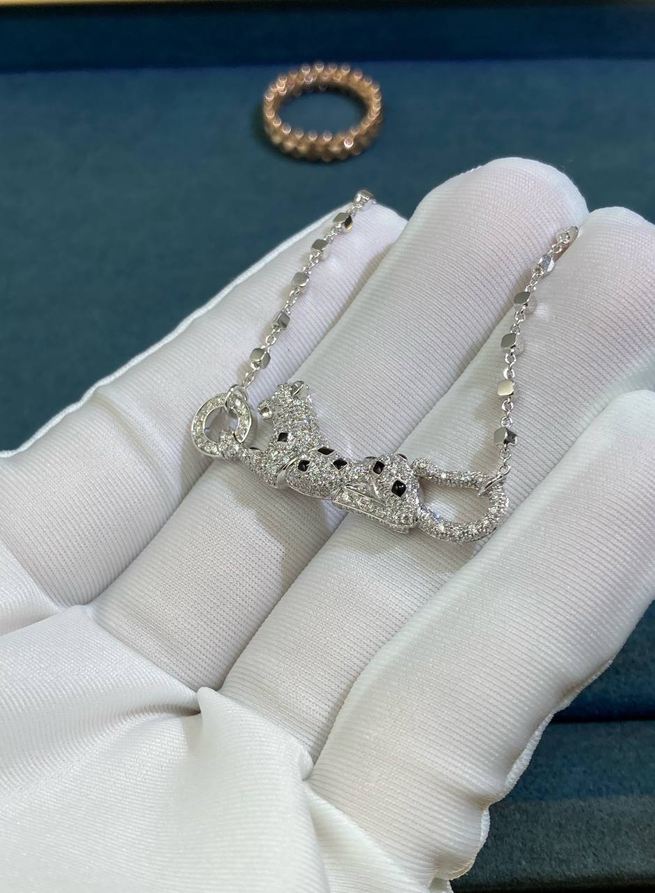 A captivating creation from the iconic Panther collection, this necklace embodies elegance and power. Crafted in 18k white gold, the pendant is pavé-set with 189 brilliant-cut diamonds, totaling 0.73 carat. The panther motif is brought to life with bold black lacquer spots and mesmerizing emerald eyes, showcasing a perfect balance of strength, sophistication, and allure.