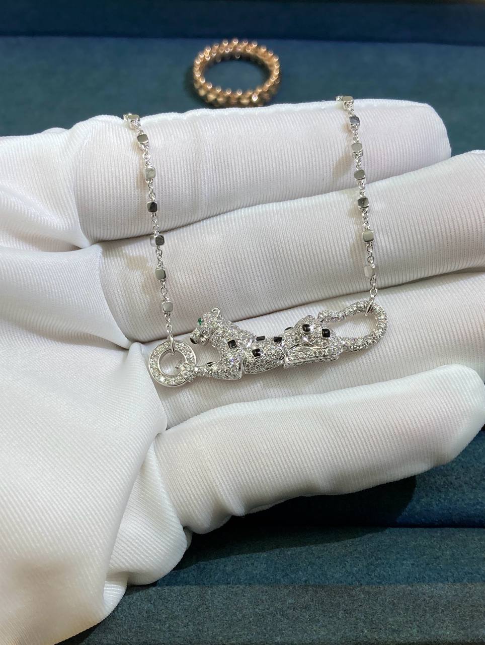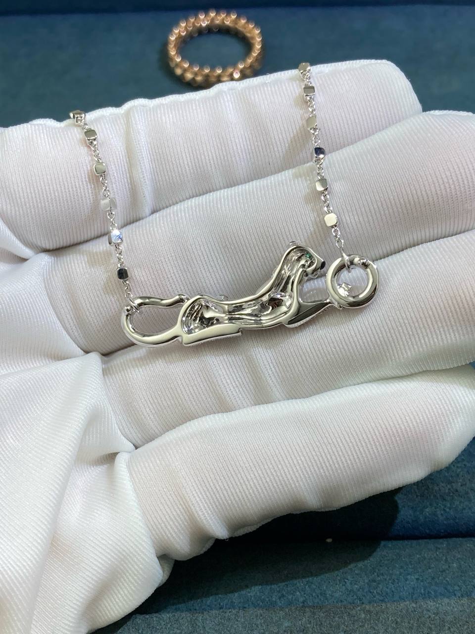 Panther Necklace in 18k White Gold with Diamonds, Emeralds & Black Lacquer