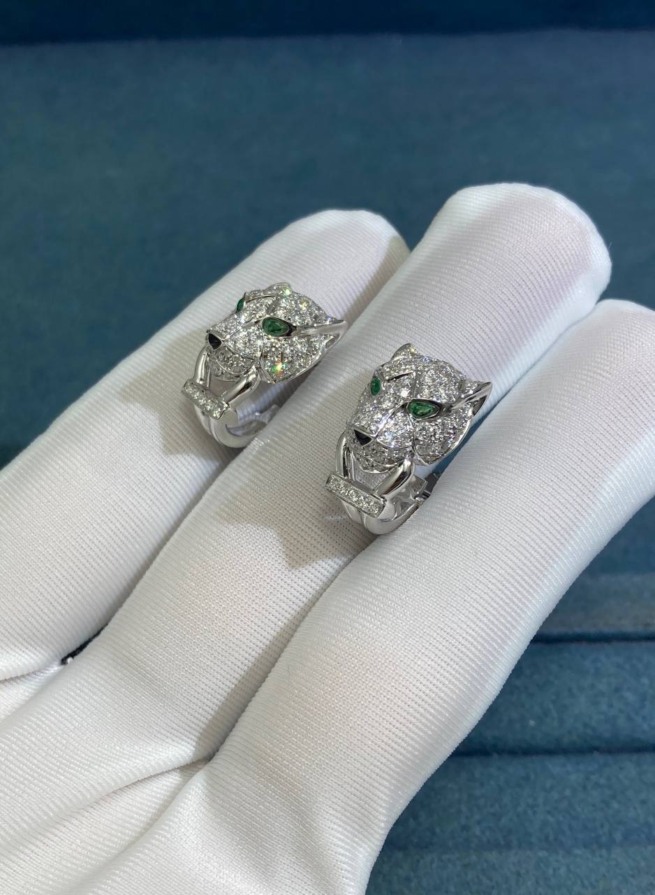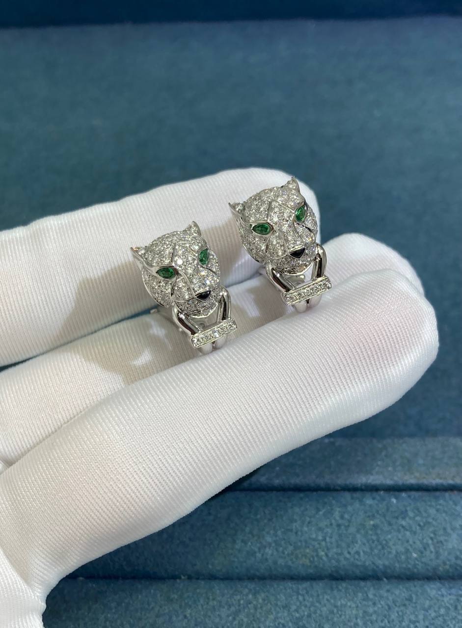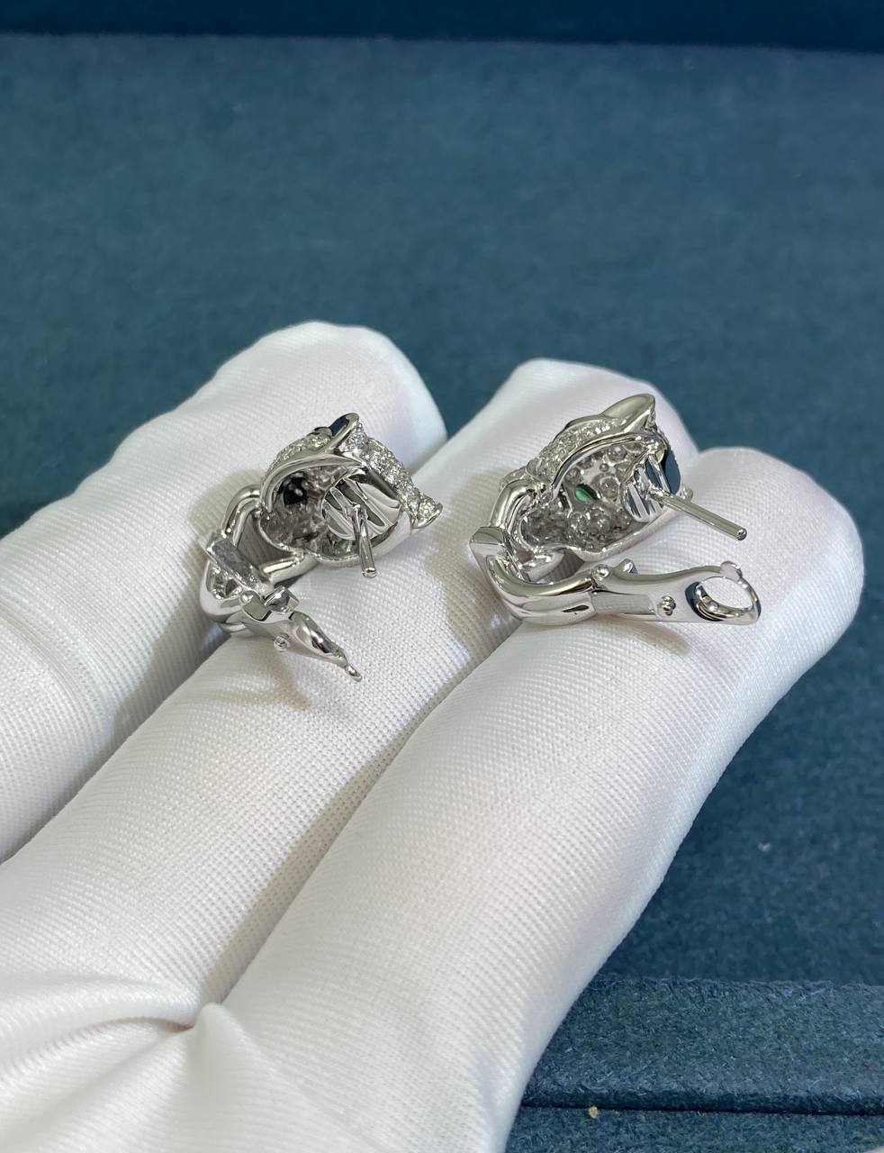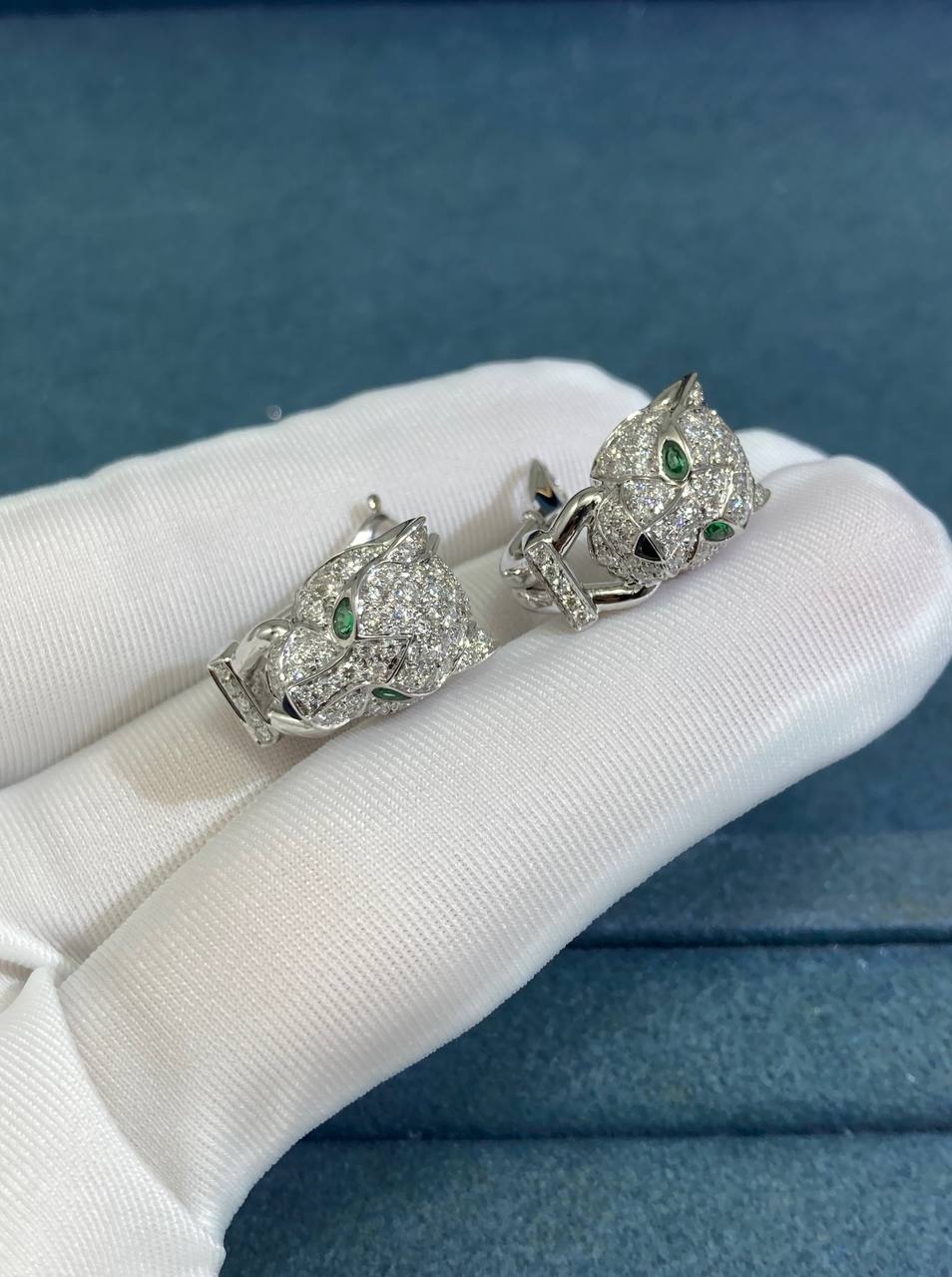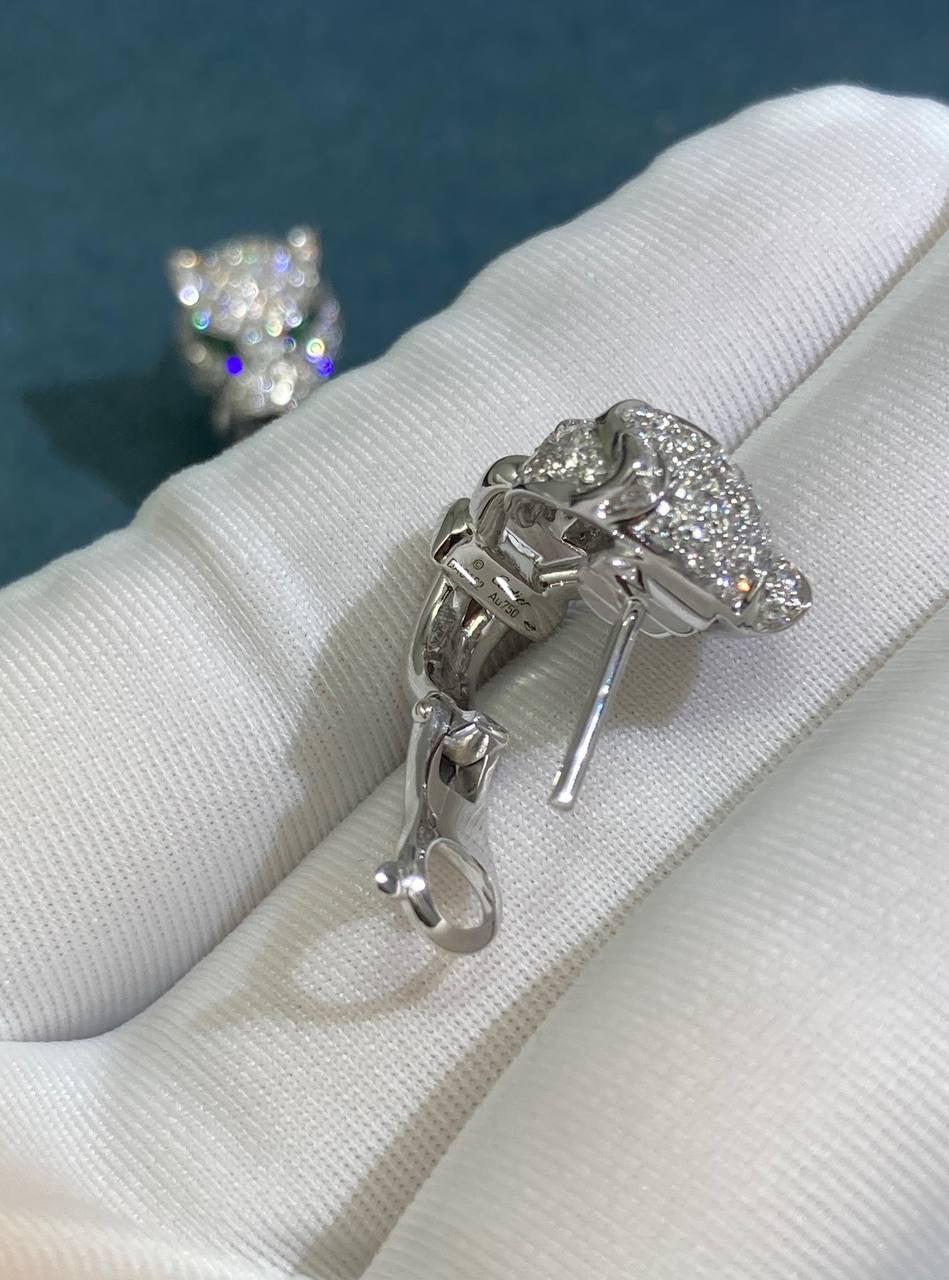 These striking earrings reinterpret the iconic panther with refined elegance. Crafted in 18k white gold, the ear studs feature meticulously pavé-set diamonds that illuminate the feline’s sculpted form. Vivid emerald eyes lend an intense gaze, while sleek onyx detailing defines the nose, bringing the legendary motif to life in exquisite detail.