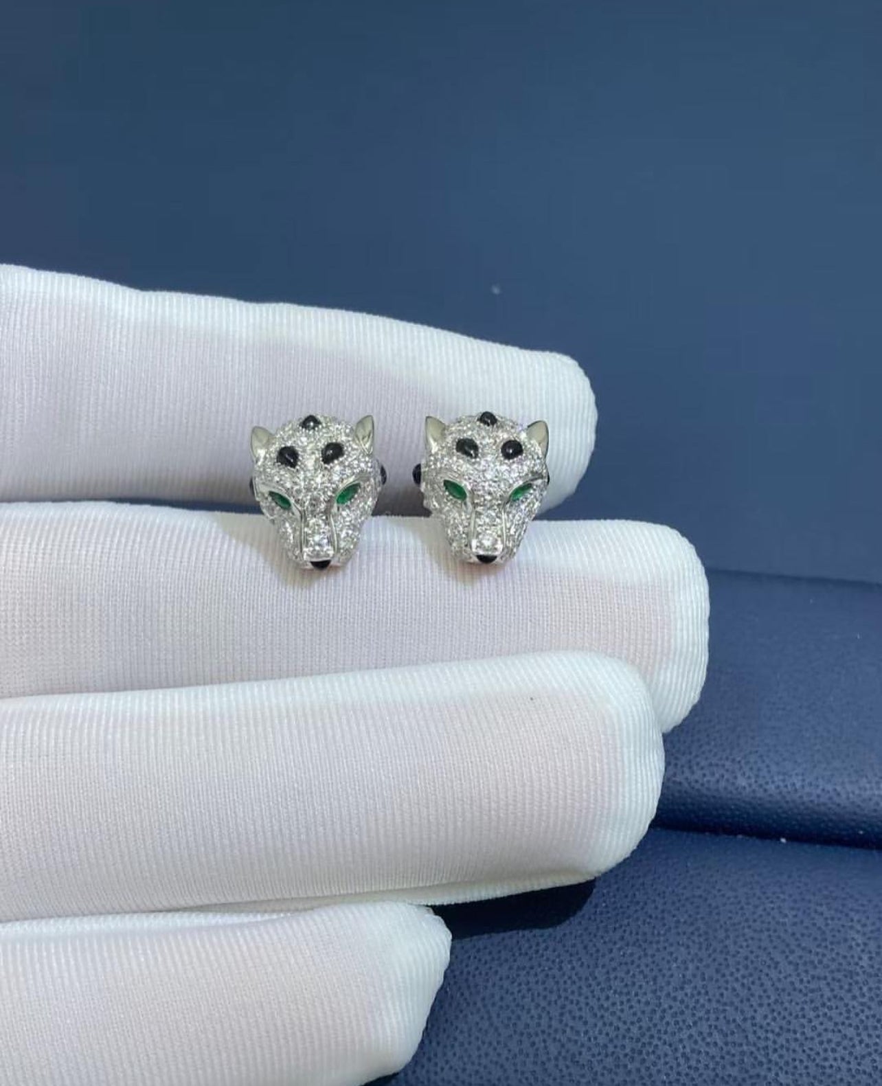 Bold and mesmerizing, these studs are crafted in luminous 18K white gold. Set with 132 natural pavé diamonds, their fierce panther silhouette comes alive with vivid emerald eyes and a sleek onyx nose. A striking balance of elegance and power in every glance.