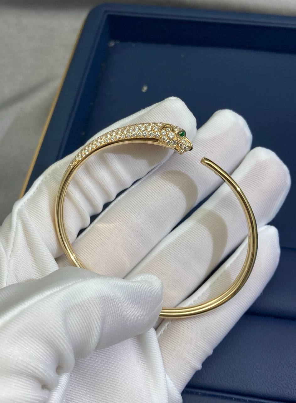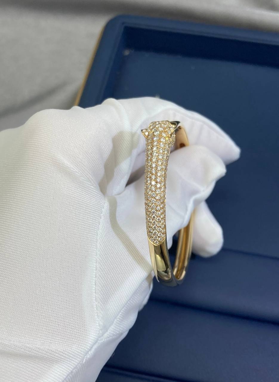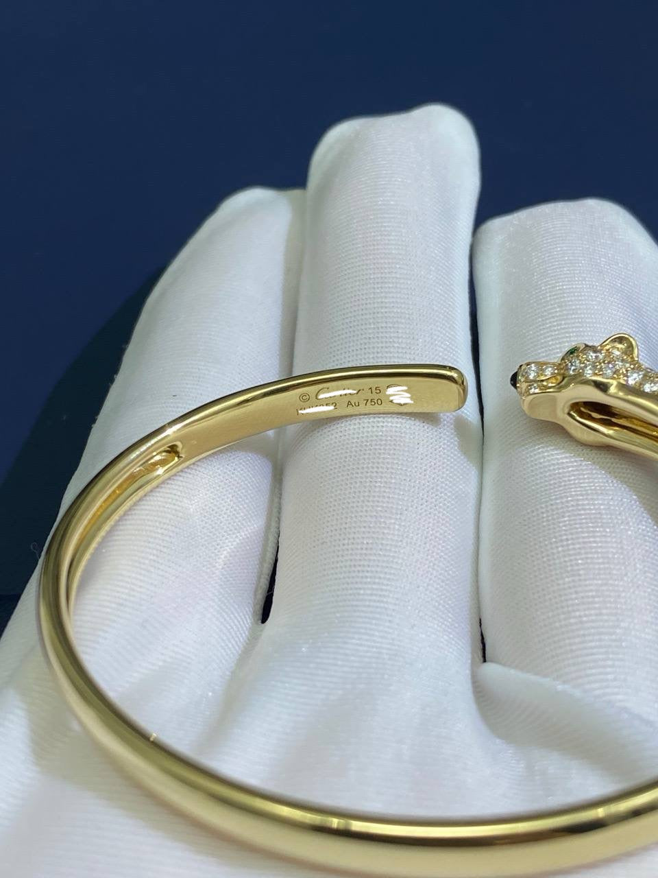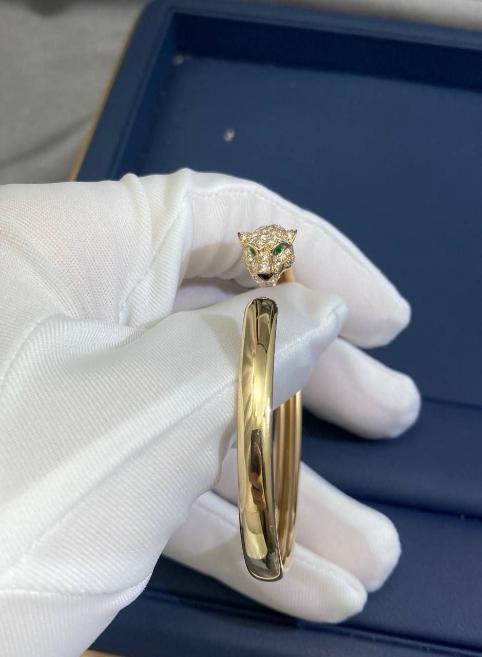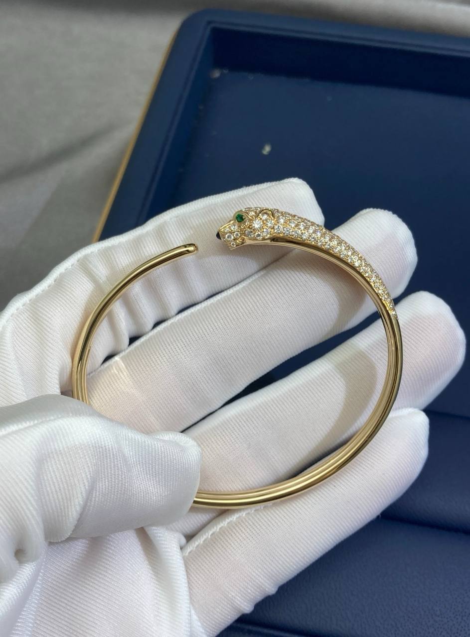 Bold yet refined, this exquisite bracelet is crafted in 18K yellow gold and beautifully detailed with 184 brilliant-cut diamonds totaling 1.56ct. The iconic panther is brought to life with piercing emerald eyes and a sleek onyx nose, embodying both strength and elegance. A timeless piece that exudes sophistication with every detail.