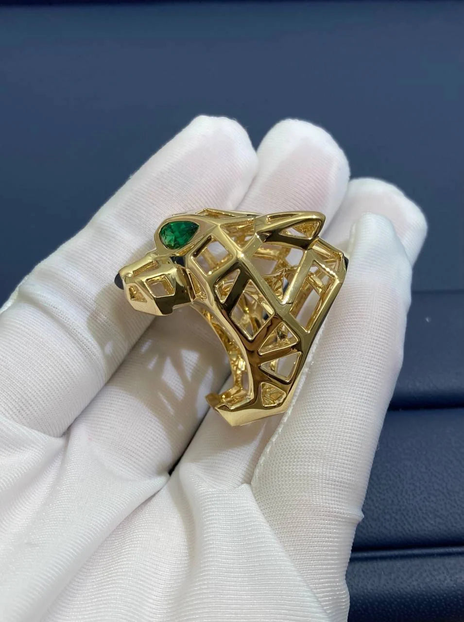 An exceptional creation in 18k yellow gold, this bold ring features an openwork panther motif—an enduring symbol of strength and elegance. The design is brought to life with two vivid pear-cut tsavorite garnets for the eyes and a polished onyx nose, adding depth and character to the sculptural form. Striking in both scale and detail, this statement ring embodies timeless sophistication.