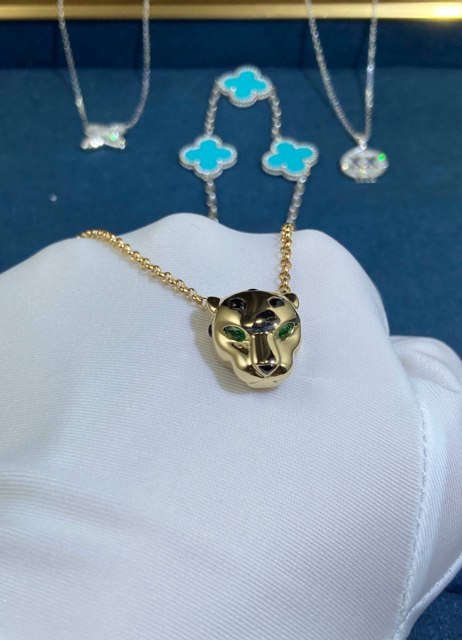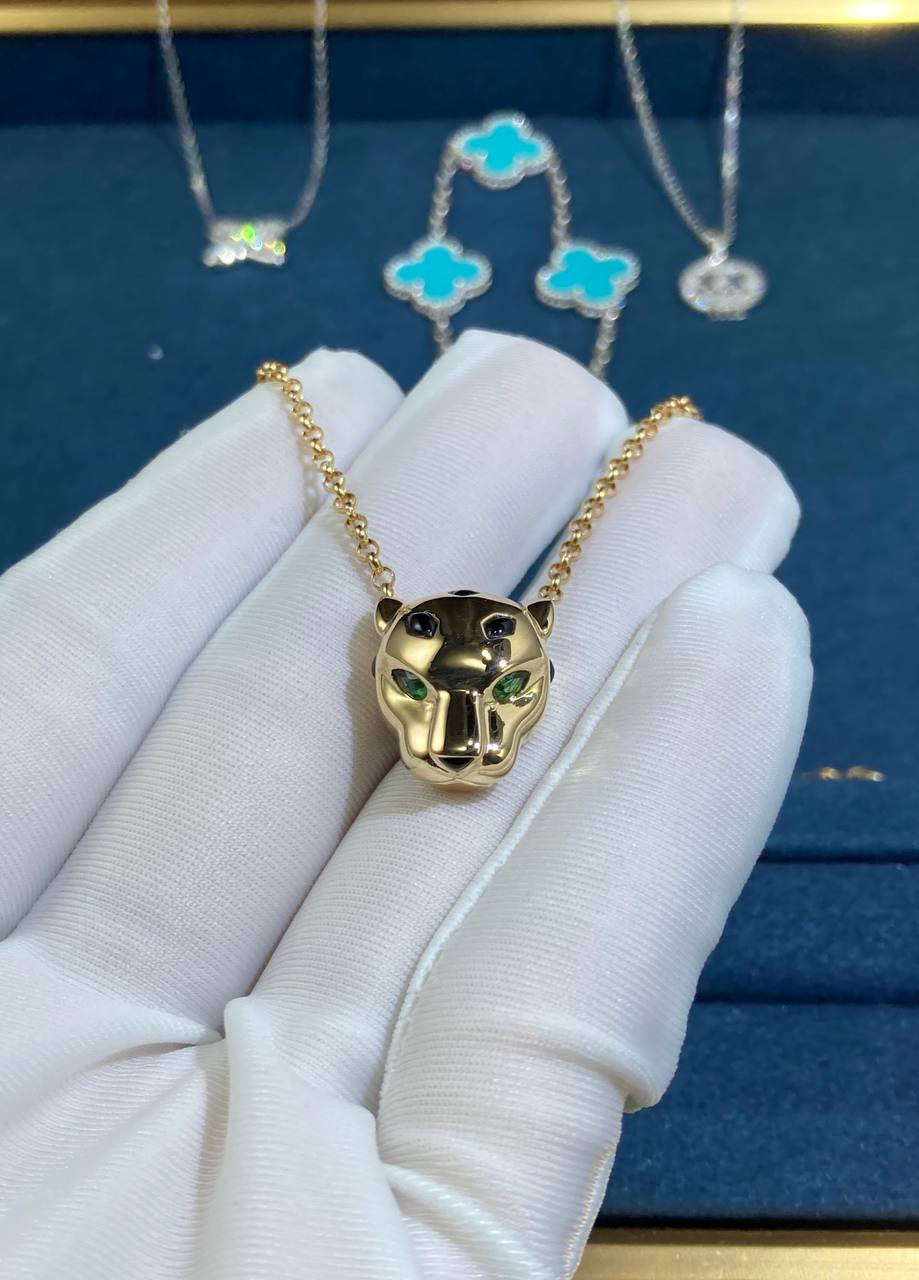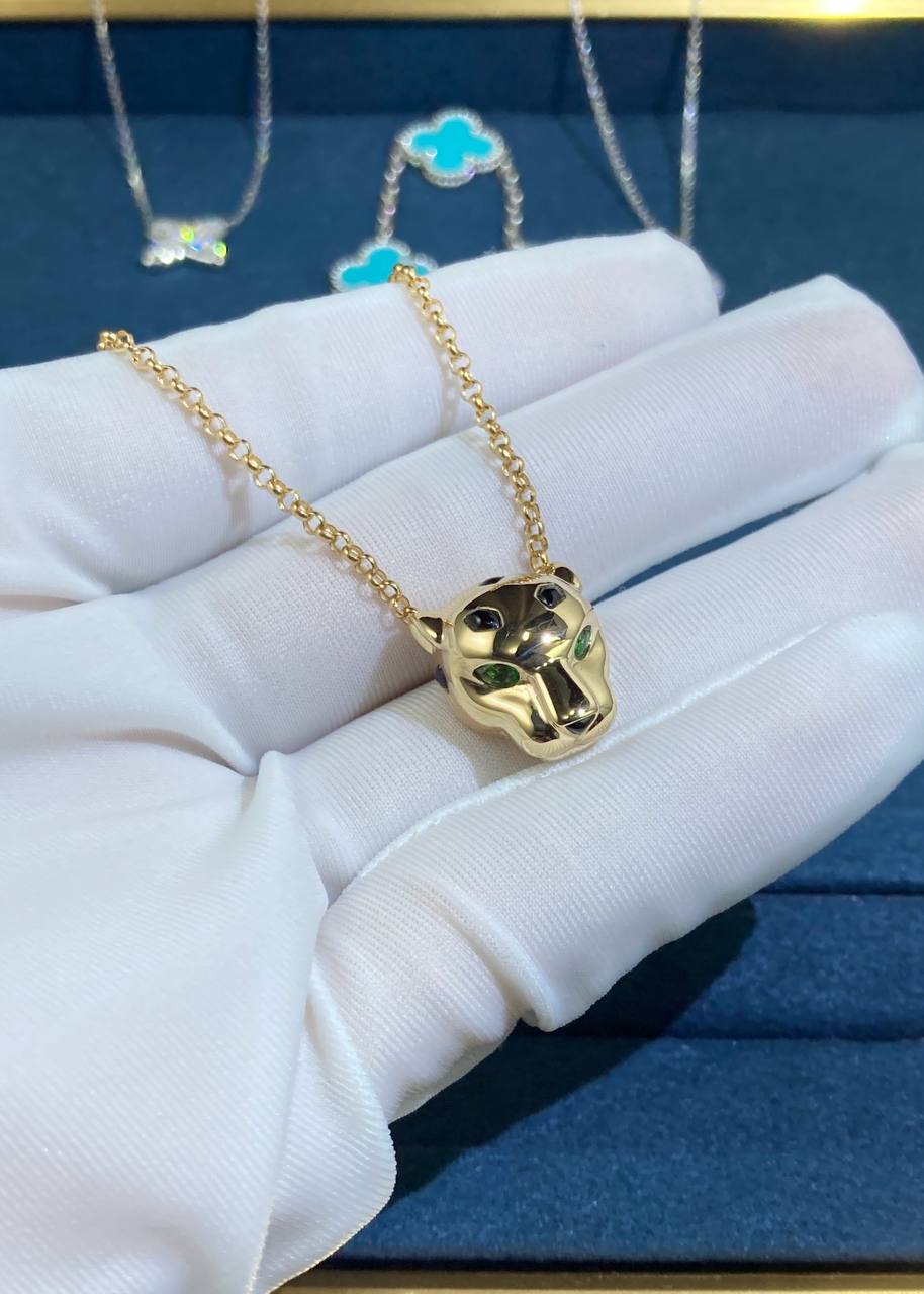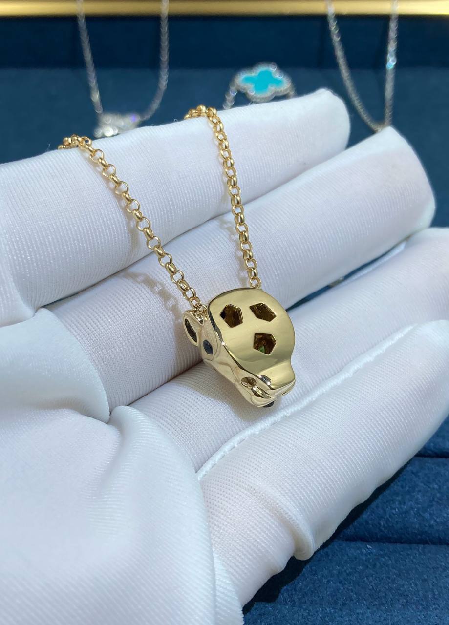 The panther, a timeless symbol of strength and grace, is reimagined in this exquisite pendant necklace. Crafted in 18k yellow gold, the design is brought to life with two vibrant tsavorite garnets for the eyes, bold black lacquer spots, and a single onyx detail. Elegant and captivating, this necklace celebrates the wild feline’s allure while remaining a versatile, statement piece for any occasion.