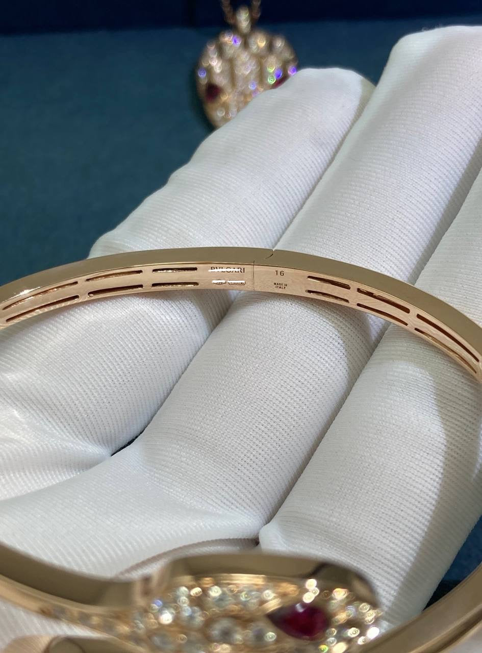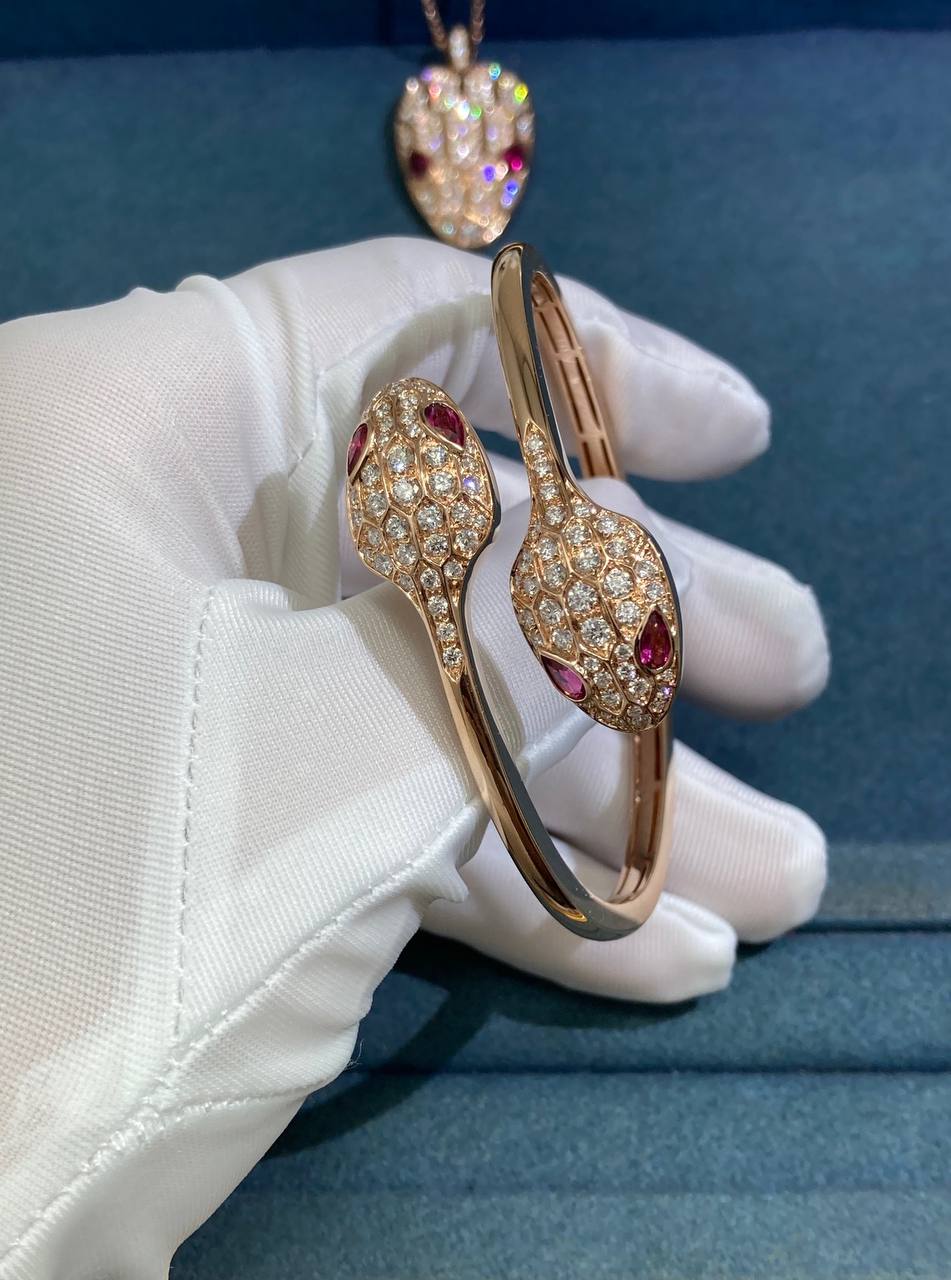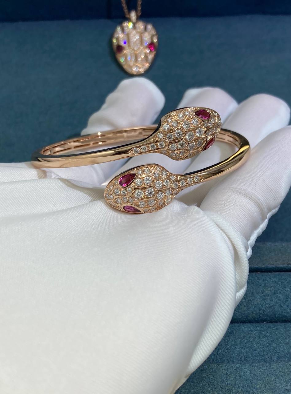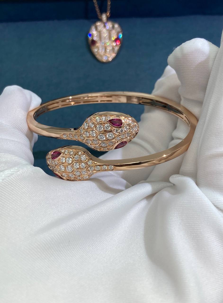 Paying tribute to the jeweler’s iconic serpent muse, this 18k rose gold bracelet is a modern emblem of power and elegance. Its sinuous form coils gracefully around the wrist, with pavé-set diamonds evoking the shimmer of delicate scales and vivid rubellites illuminating the eyes. A timeless symbol of wisdom, vitality, and seduction, the design fuses mythic allure with contemporary craftsmanship, radiating both strength and sensuality.