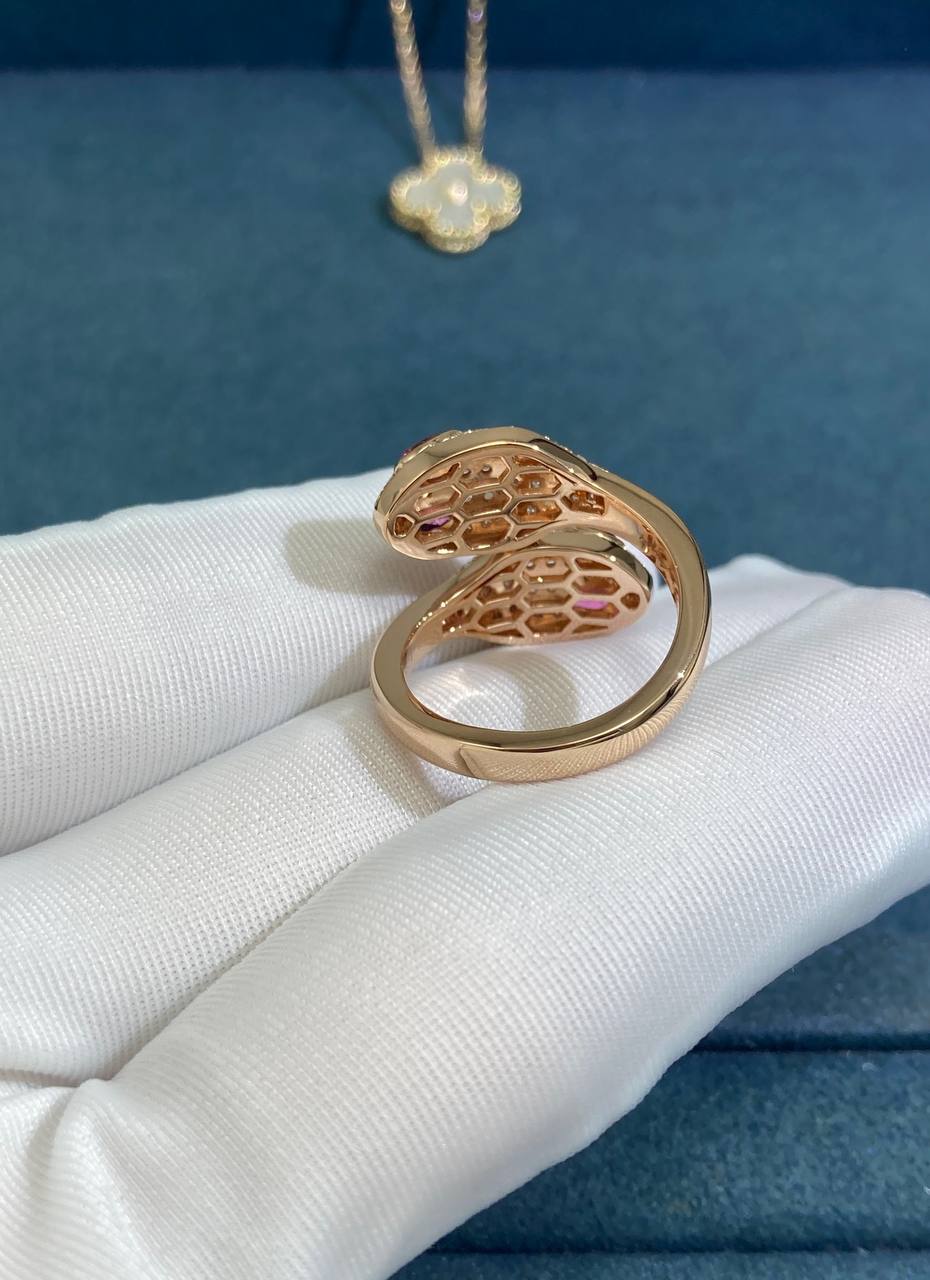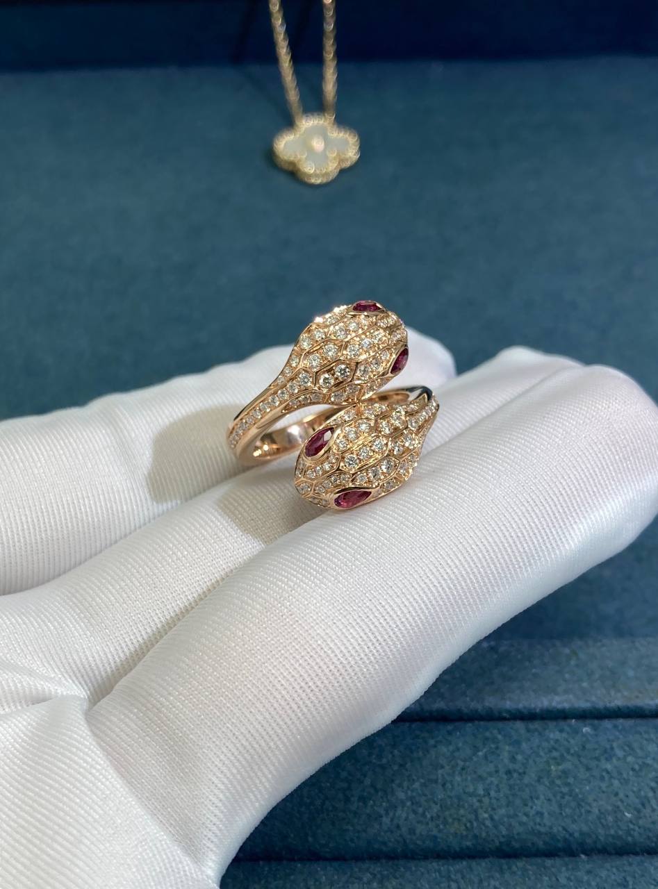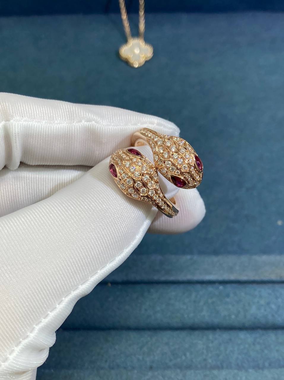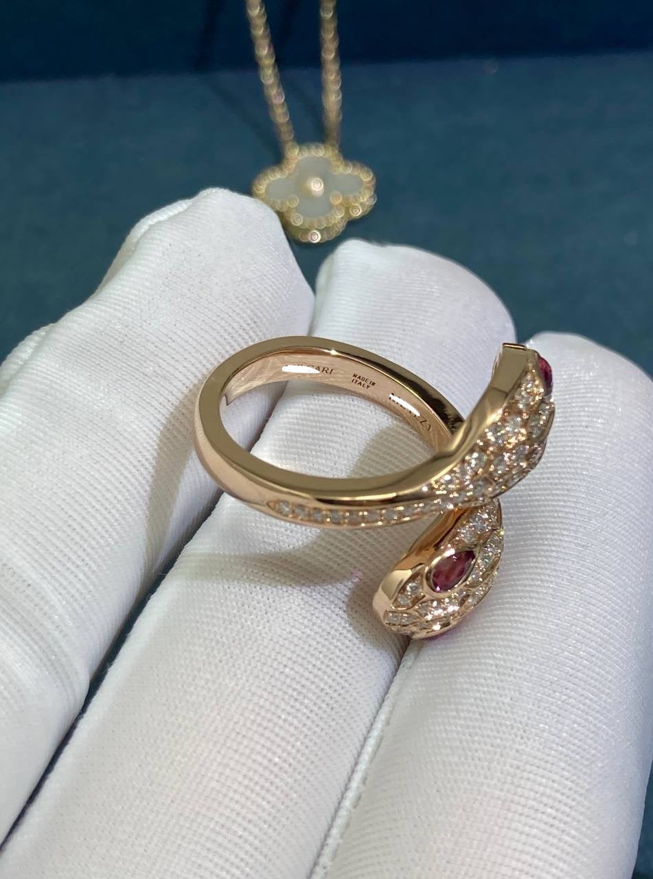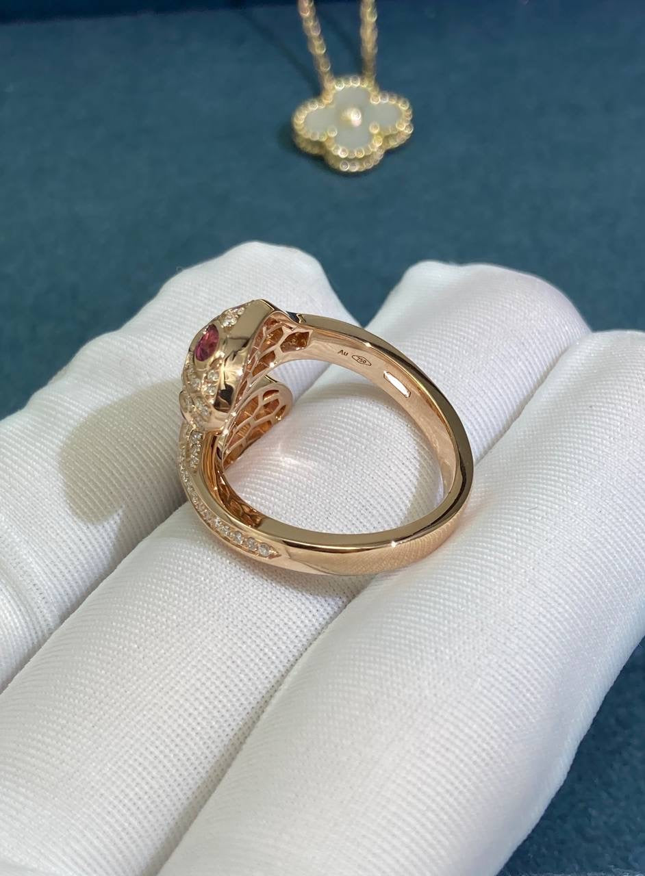 This striking ring showcases two serpent heads exquisitely crafted in 18k rose gold. Each head is accented with vibrant rubellite eyes and pavé-set natural diamonds totaling 0.57 carat, creating a design that is both bold and elegant. A perfect fusion of artistry and symbolism, it embodies power, sophistication, and timeless allure.
