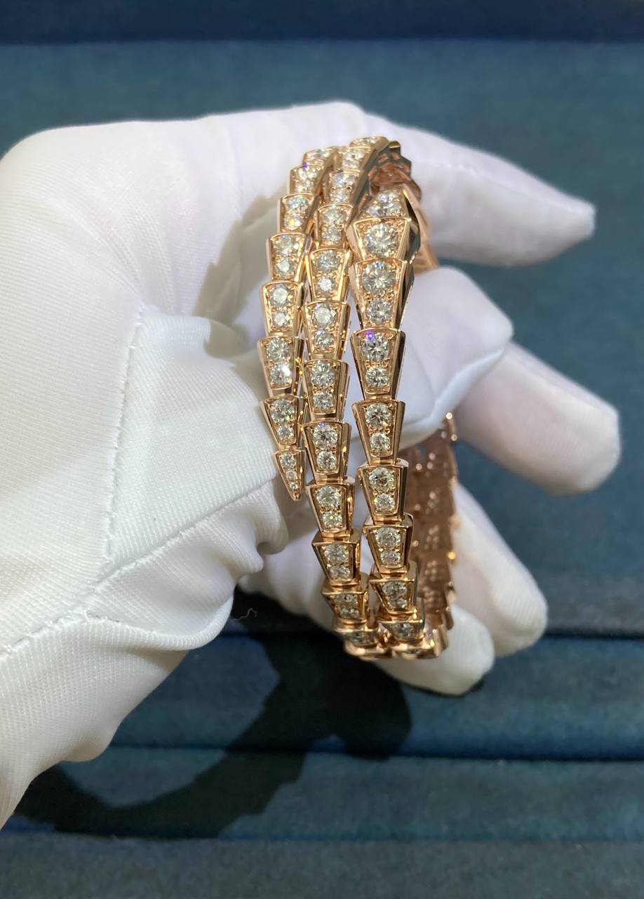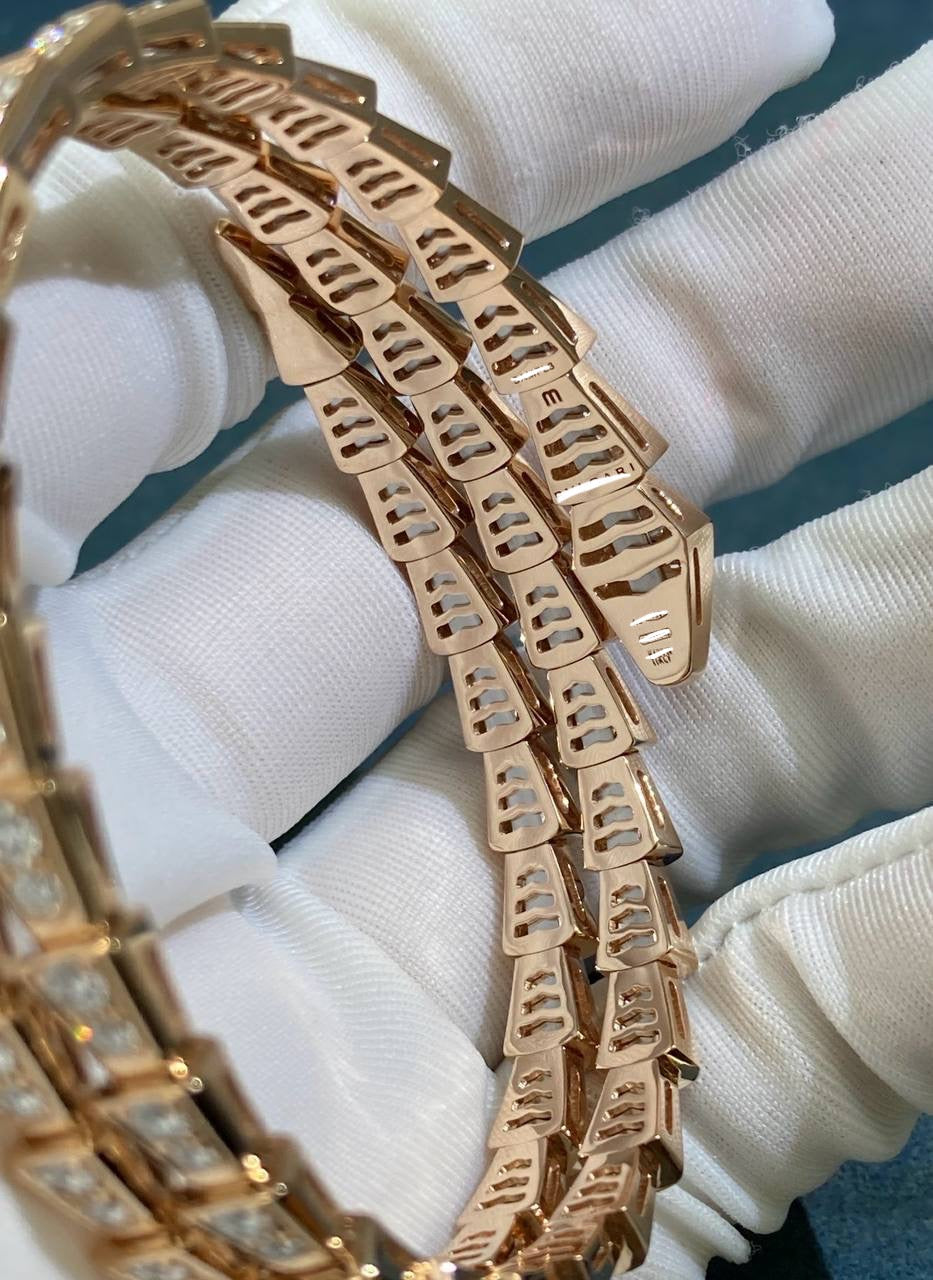 An ultra-modern reimagining of an eternal symbol of glamour and seduction, this bracelet captivates with its bold yet fluid design. The mythical serpent coils elegantly around the wrist, its sinuous form brought to life in sculpted 18k rose gold. Each scale glimmers with pavé-set diamonds, radiating brilliance and enhancing the serpent’s iconic allure.