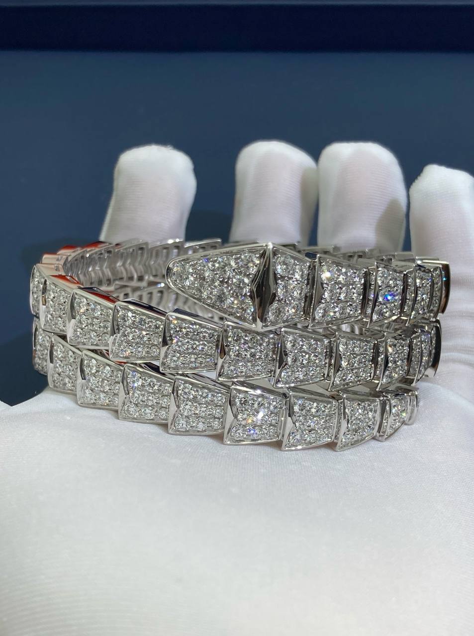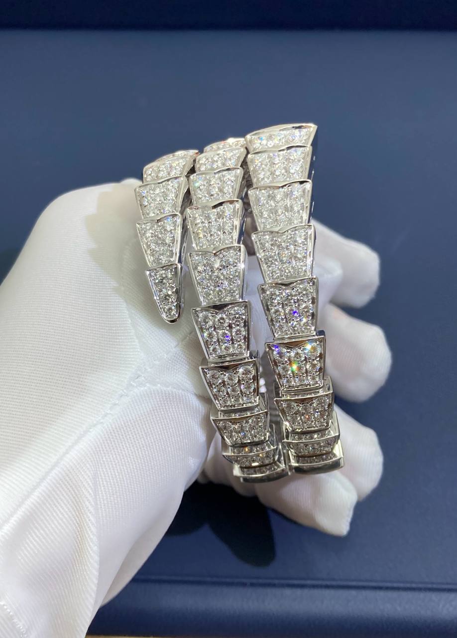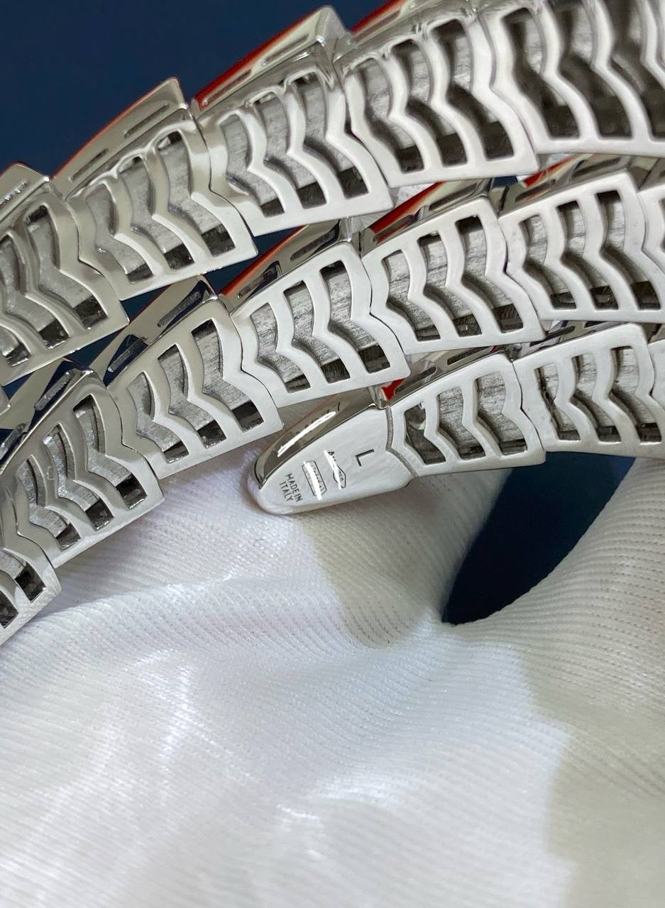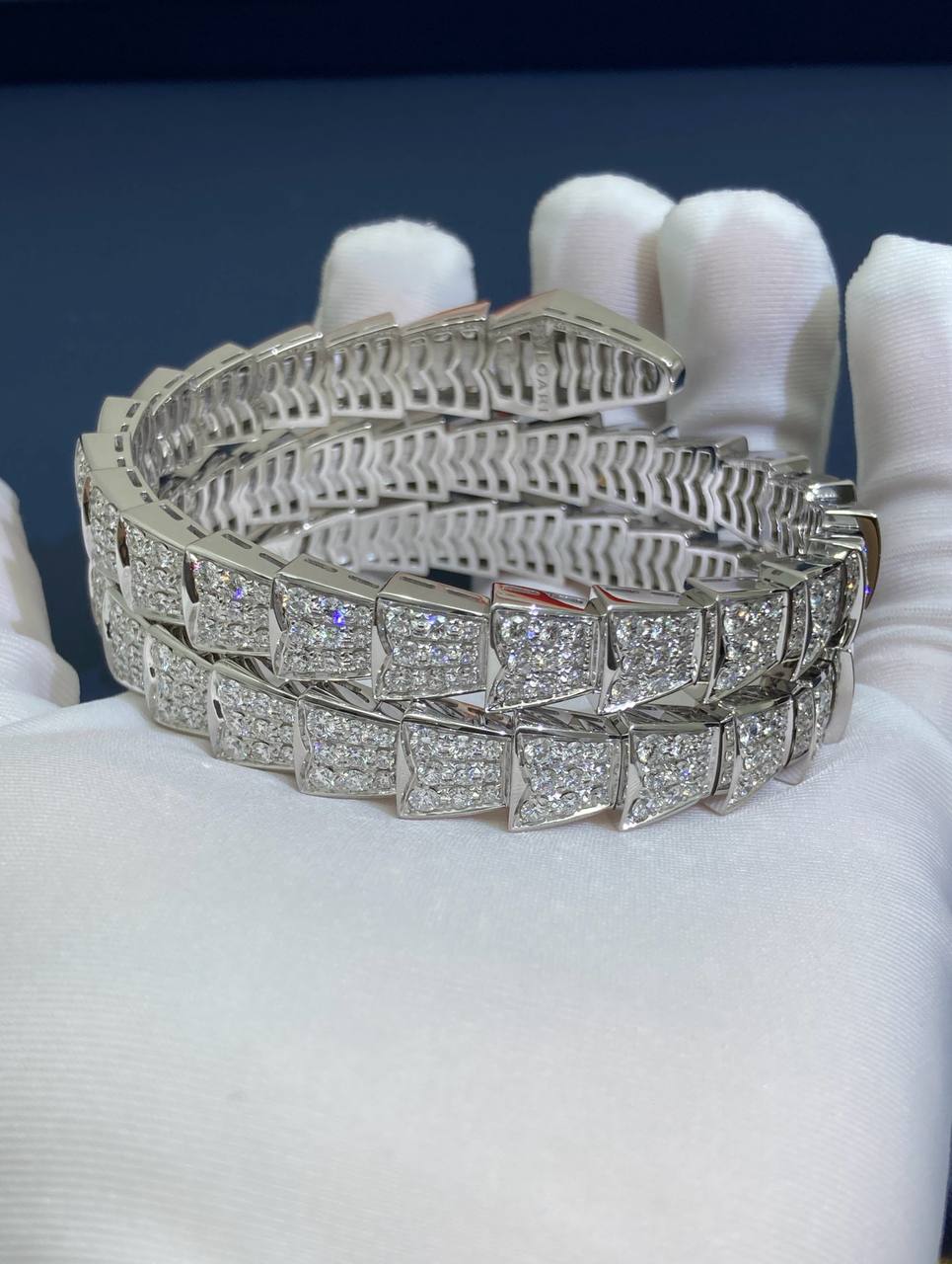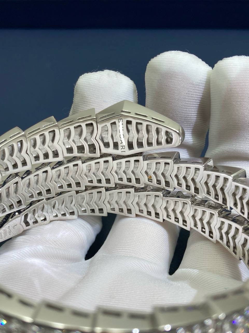 A bold emblem of elegance and power, this Serpenti Viper bracelet is crafted in 18k white gold and designed to coil gracefully around the wrist. The double-row pavé diamond setting, totaling 5.02 ct, accentuates the sinuous curves and fluidity of the serpent. This Large model delivers a striking presence while maintaining refined sophistication, making it a captivating statement piece for any occasion.