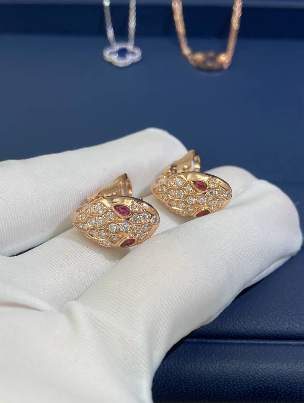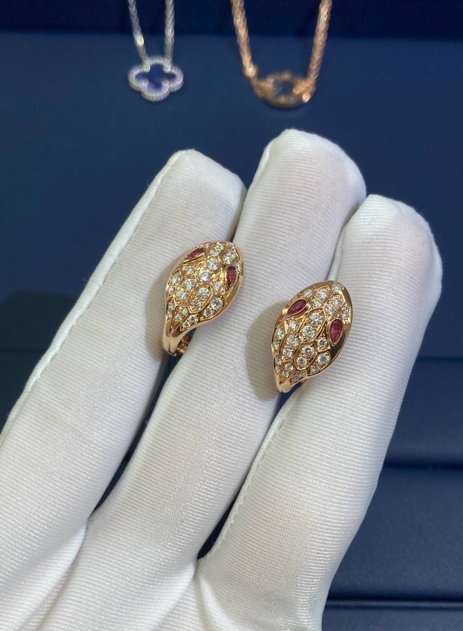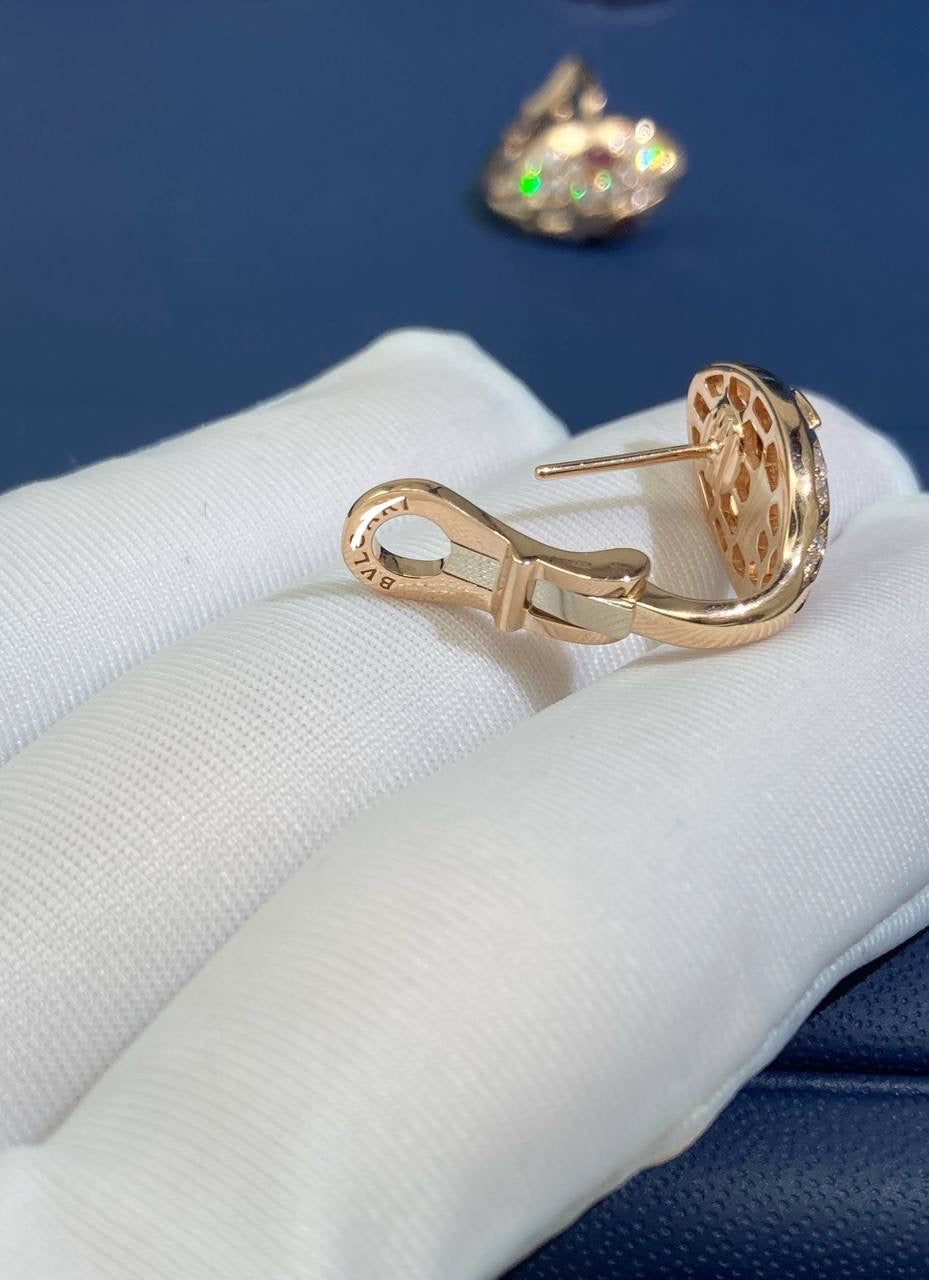 Departing from the flowing curves of the signature Serpent silhouette, these striking earrings draw attention to the powerful head of the snake. Crafted in 18k rose gold, the design is brought to life with pavé-set diamonds totaling 2.28 ct and accented by two hypnotic rubellite eyes. Bold yet elegant, they embody a sense of mystery and forbidden allure.