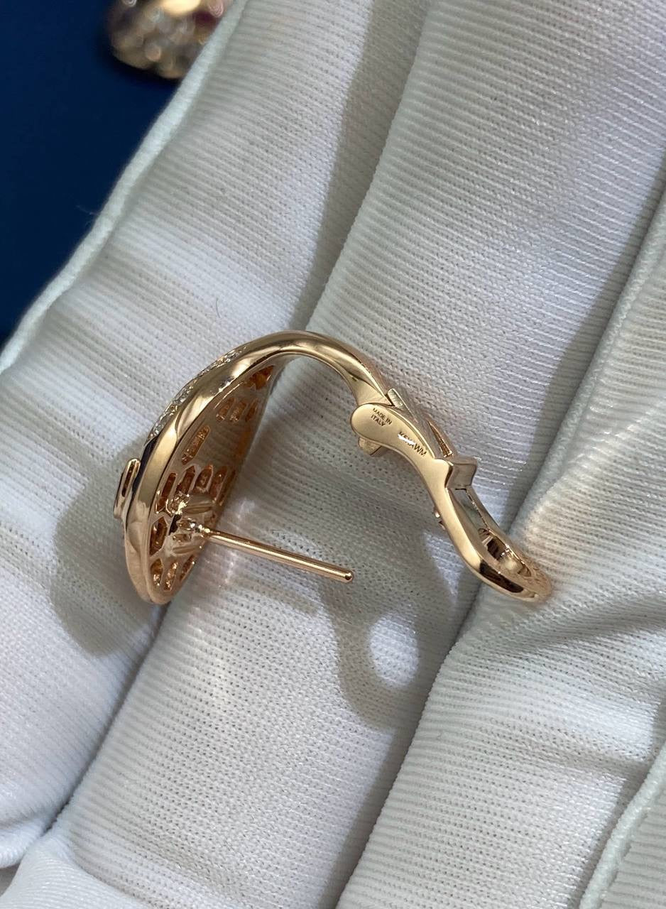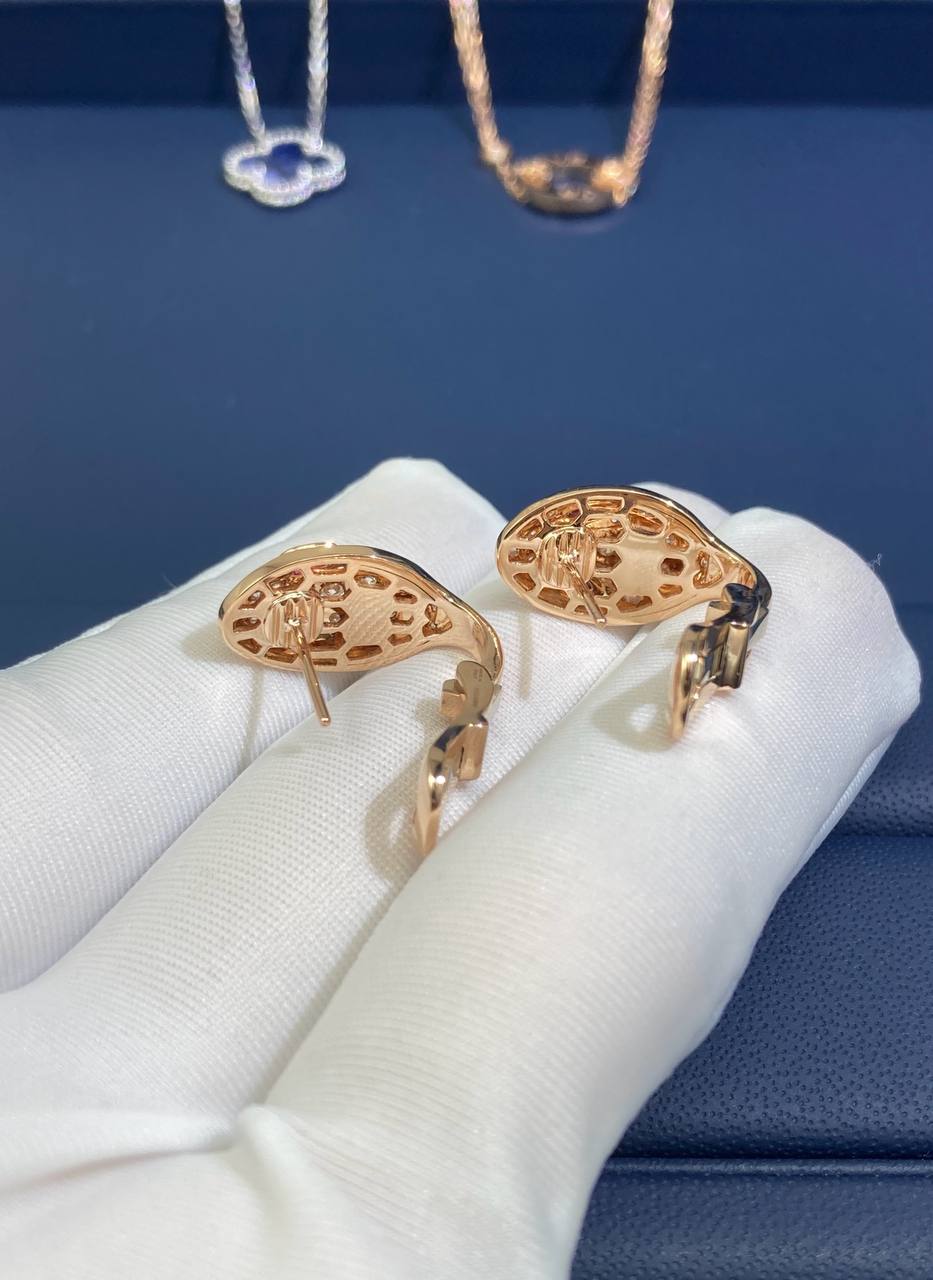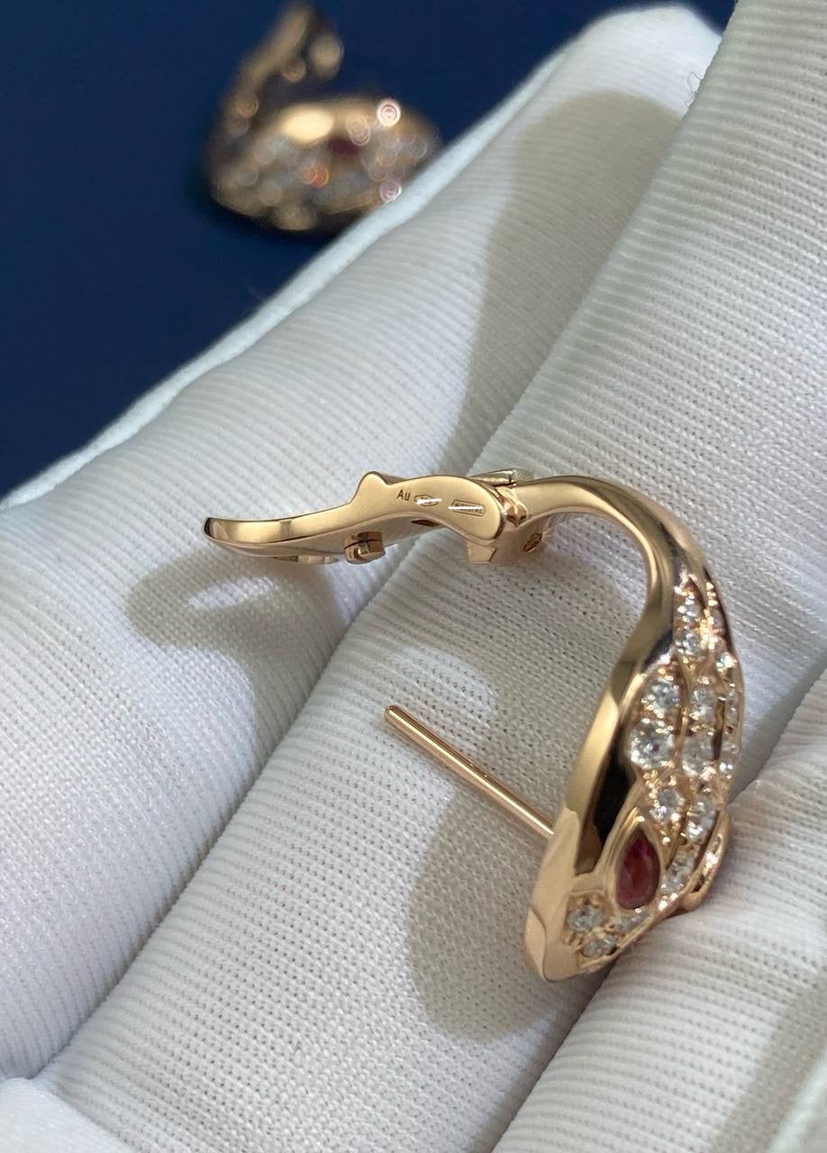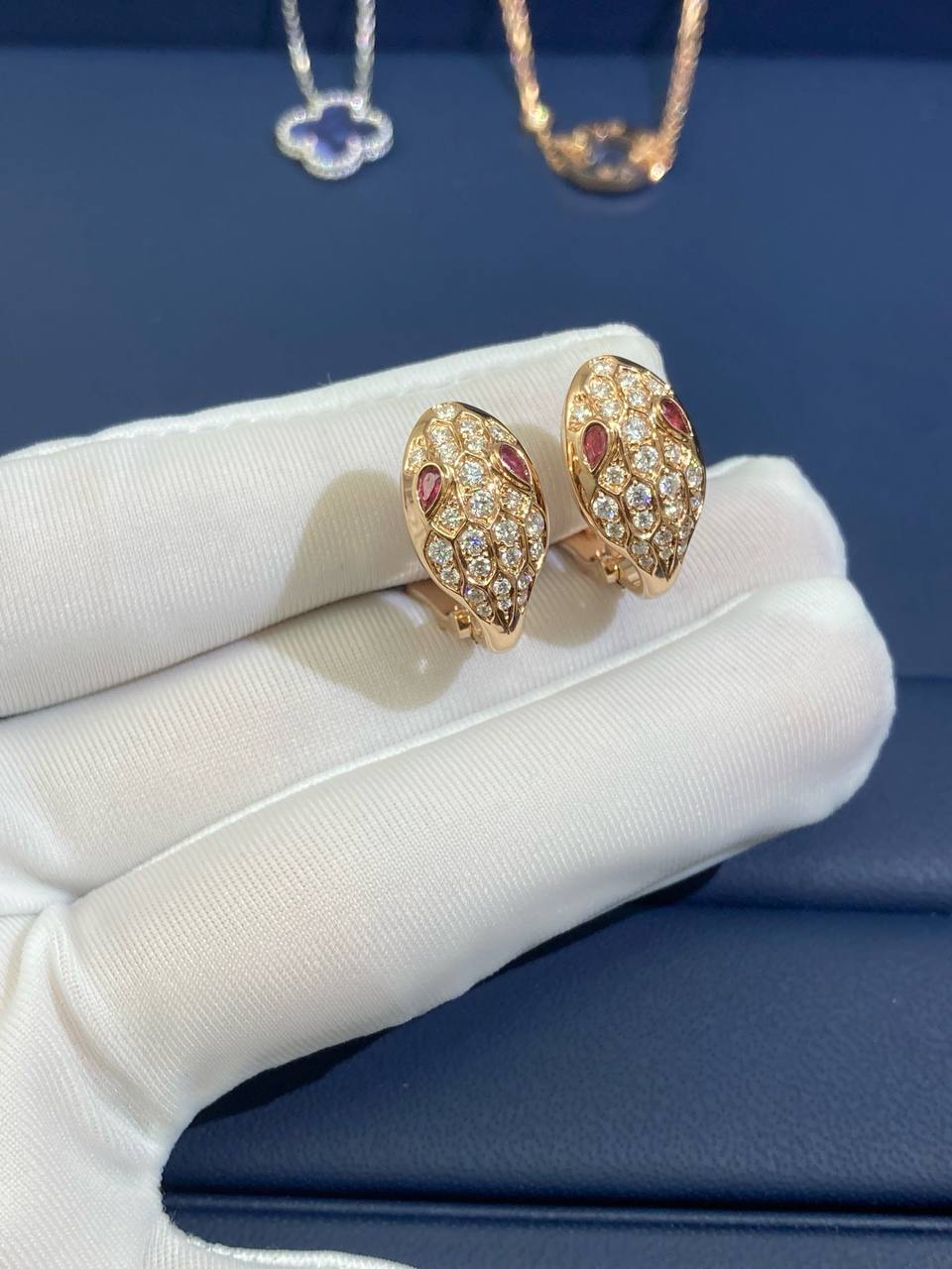 Departing from the flowing curves of the signature Serpent silhouette, these striking earrings draw attention to the powerful head of the snake. Crafted in 18k rose gold, the design is brought to life with pavé-set diamonds totaling 2.28 ct and accented by two hypnotic rubellite eyes. Bold yet elegant, they embody a sense of mystery and forbidden allure.