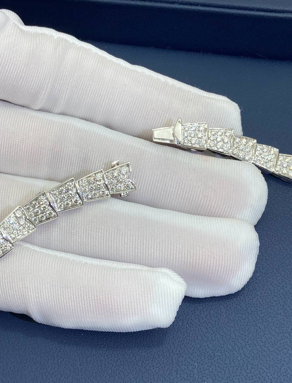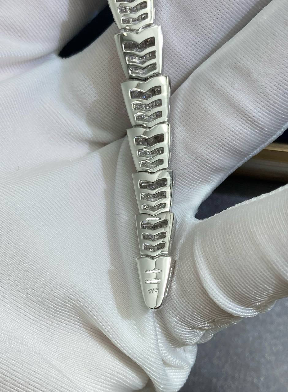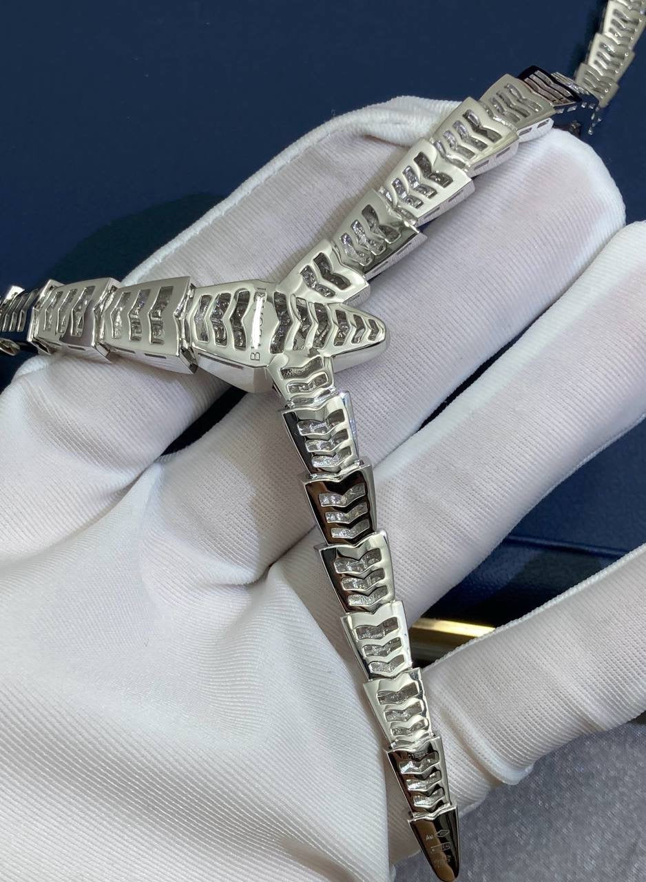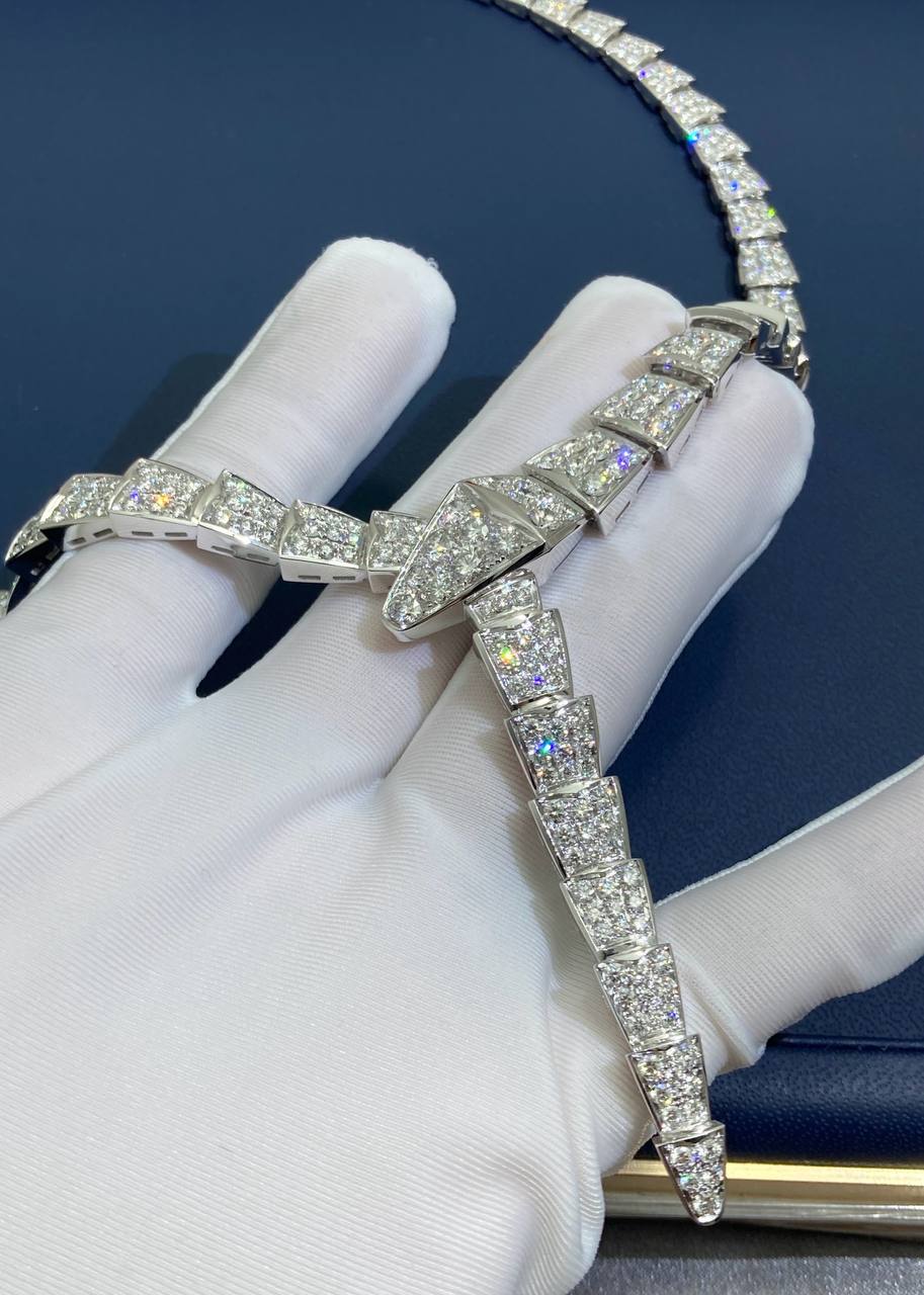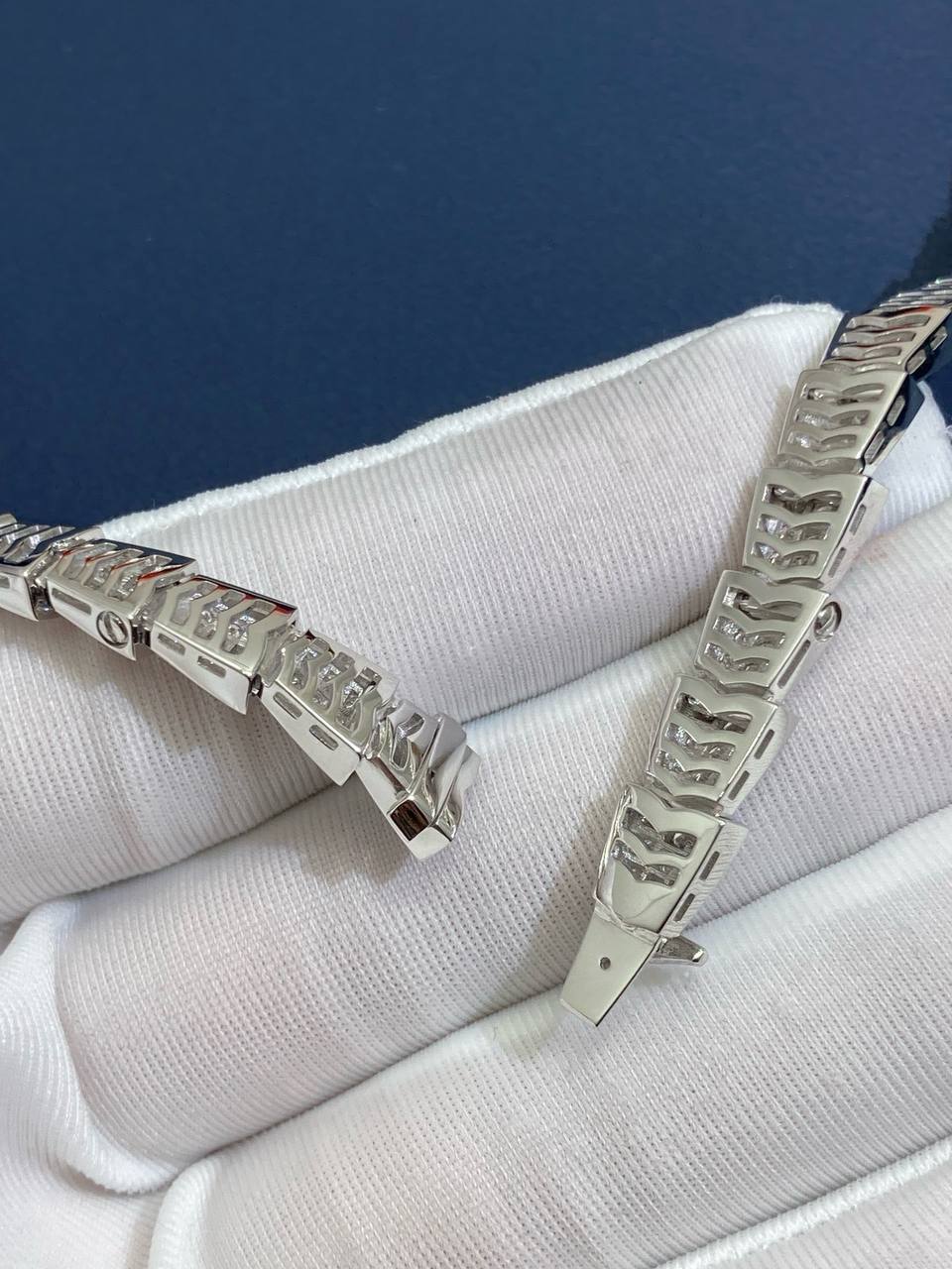 A striking tribute to the house’s iconic spirit animal, this glamorous serpent necklace captivates with its hypnotic design. Crafted in 18k white gold, it features stacked geometric links pavé-set with brilliant-cut diamonds, evoking the fluidity and texture of a serpent’s scales as they coil elegantly around the neck. With a total of 14.74 ct of diamonds, this piece radiates both sophistication and bold allure.