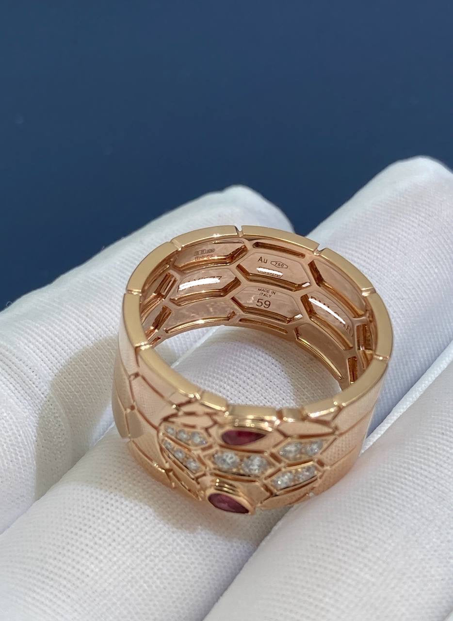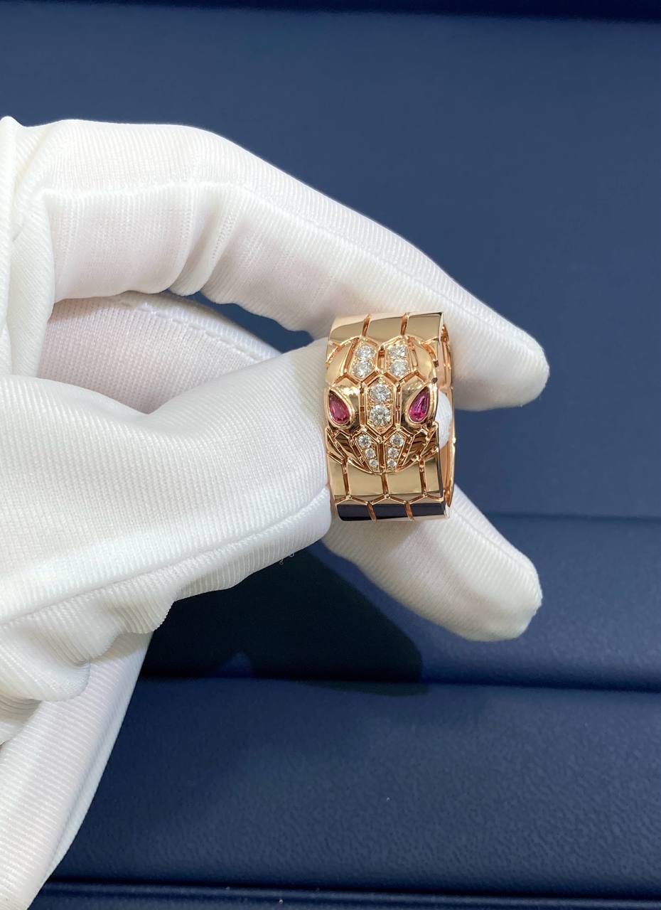 An entrancing 18k rose gold ring from the Serpenti Seduttori collection, featuring a sinuous snake design that wraps gracefully around the finger. The head is set with 12 round brilliant-cut diamonds totaling approximately 0.15 ct (F–G color, VS clarity), while the serpent’s eyes are highlighted by two bezel-set pear-shaped rubellites totaling 0.30 ct, radiating a captivating medium reddish-pink hue. Bold and elegant, this ring embodies both artistry and sensuality.