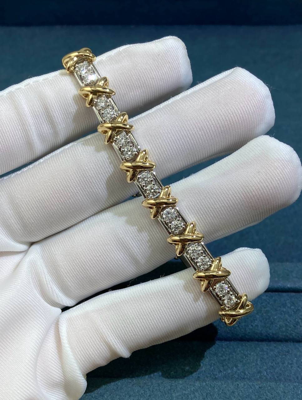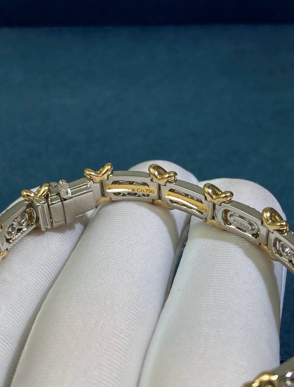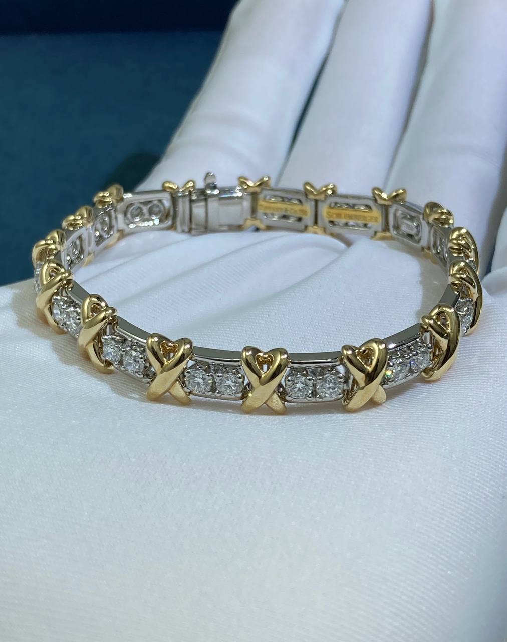 This exquisite bracelet comes from one of the maison’s most distinctive collections, defined by its harmonious balance of form and brilliance. Crafted in platinum and accented with 18k yellow gold, the design features the house’s iconic cross motif, elegantly separating each diamond-set section. A total of 36 round brilliant diamonds, weighing 3.11 carats, are arranged in pairs along the bracelet, their exceptional F color and VVS clarity radiating timeless beauty.
