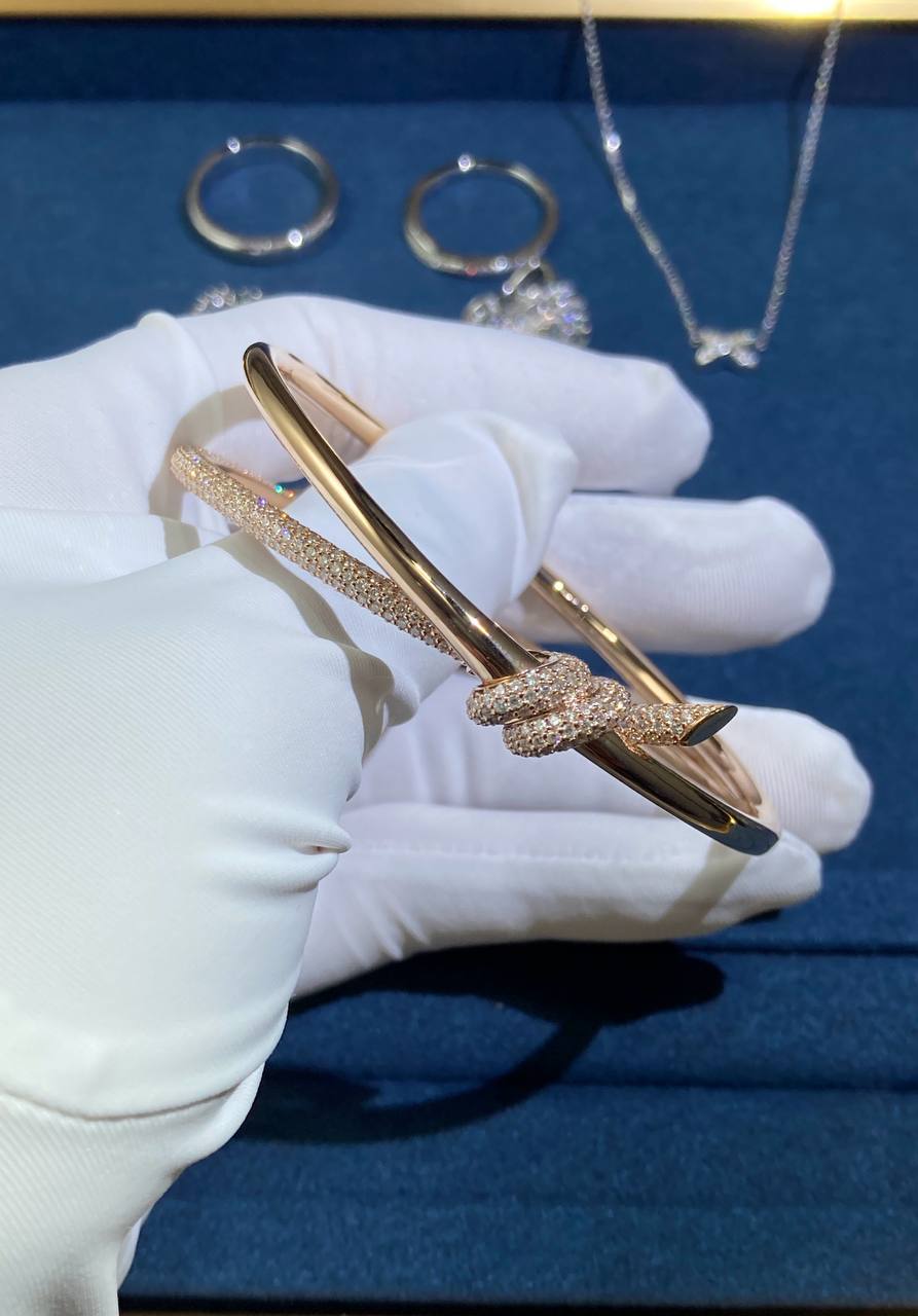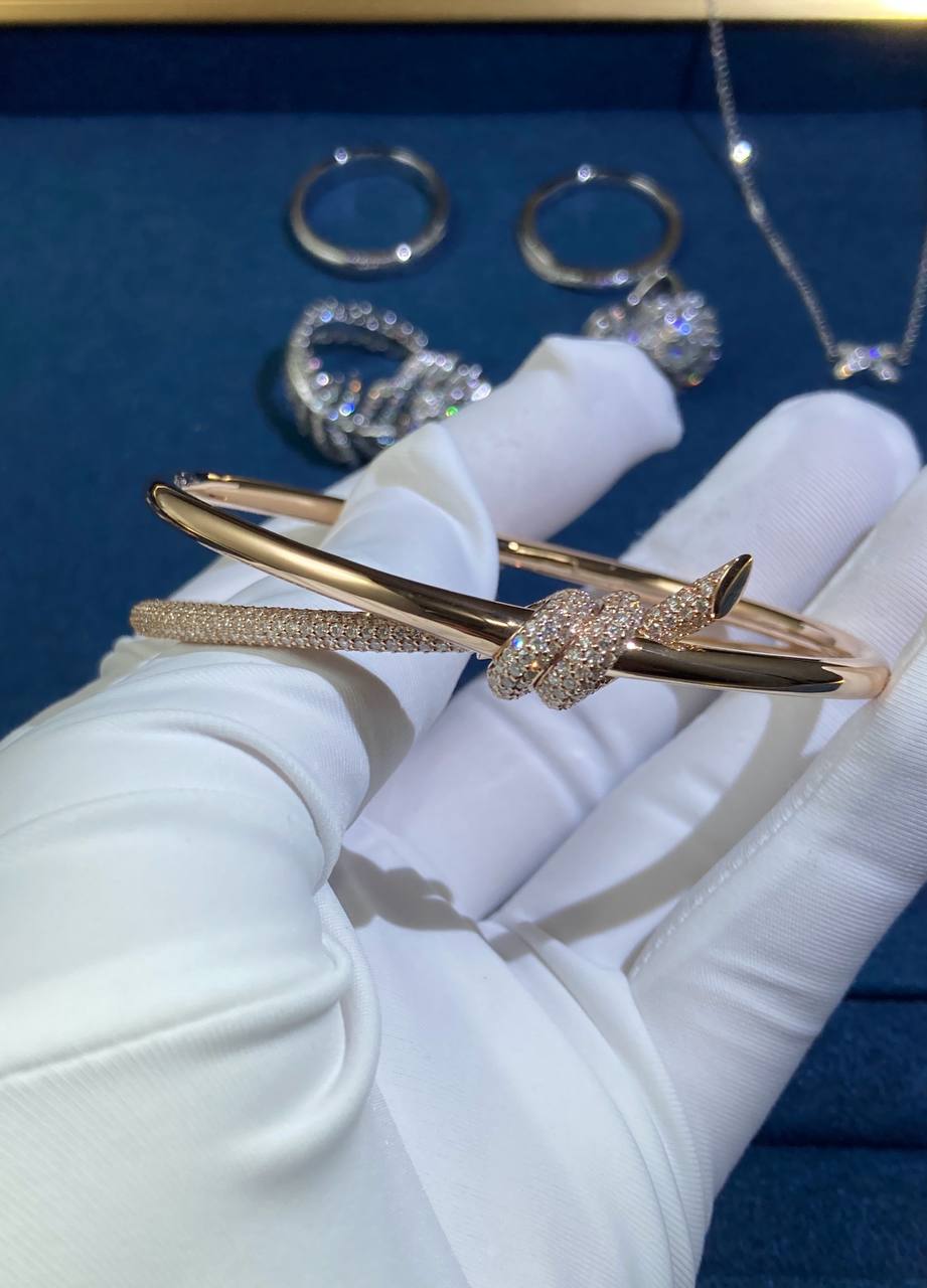 - Clasp: Knot motif concealing hidden push-and-rotate fastening