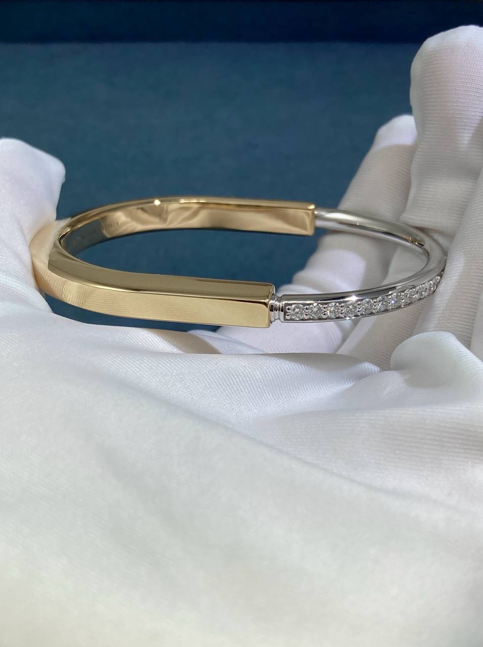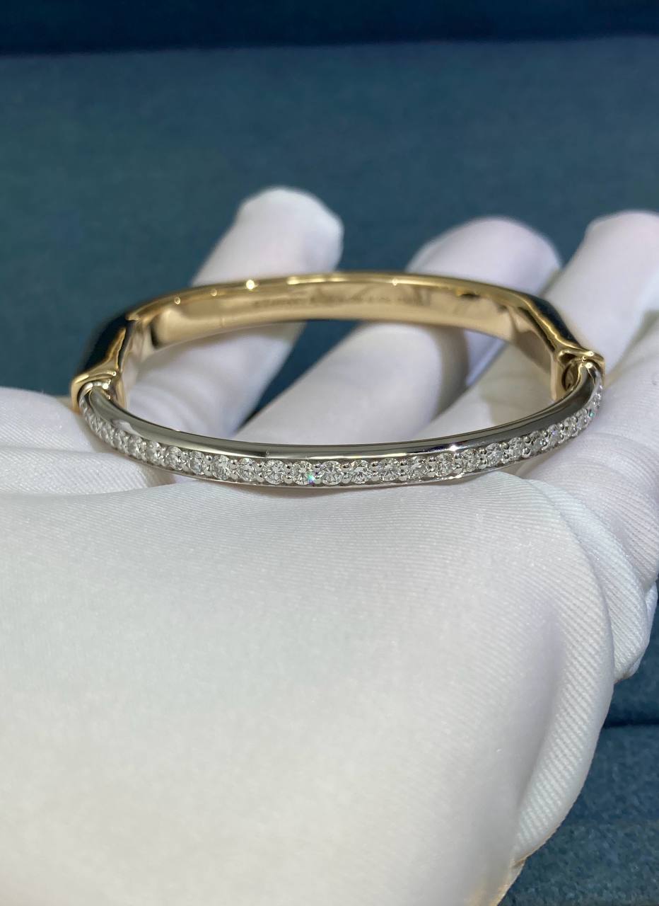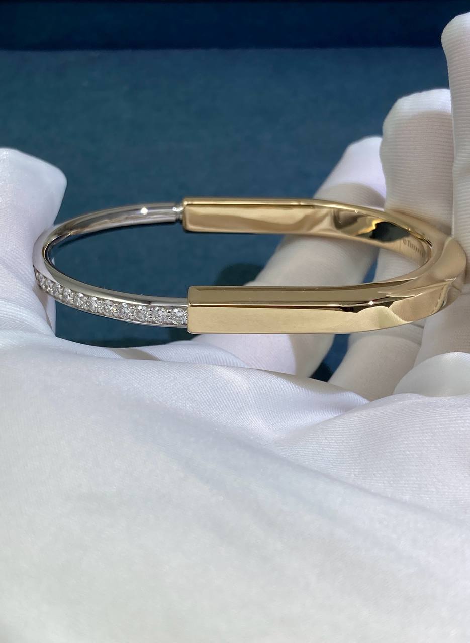 Celebrating connection and inclusivity, the Lock bangle is a bold statement of the personal bonds that define us. Expertly crafted in 18K yellow and white gold, this unisex design features hand-set diamonds that create a striking contrast. The innovative clasp, inspired by a padlock, adds both functionality and a distinctive visual signature.