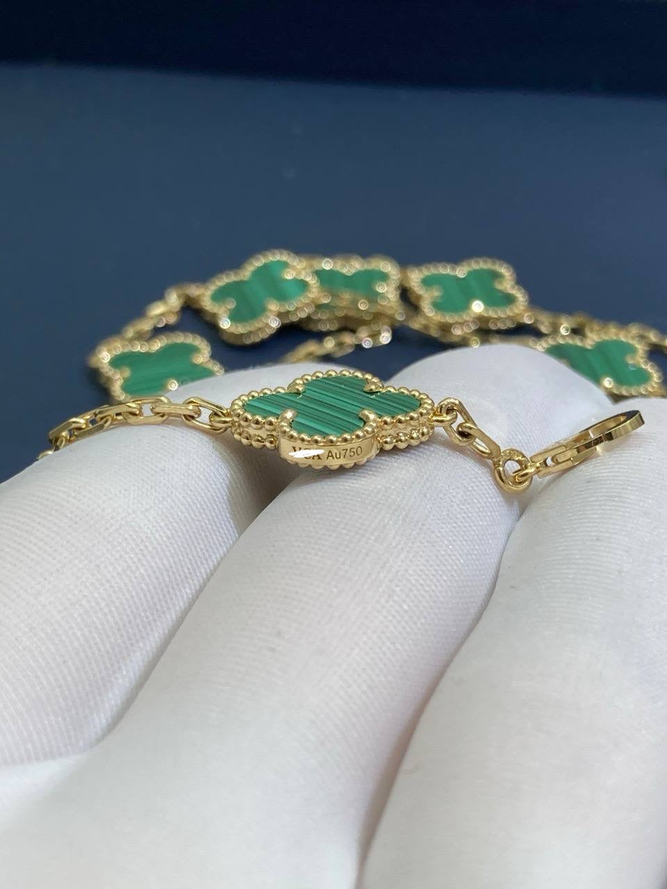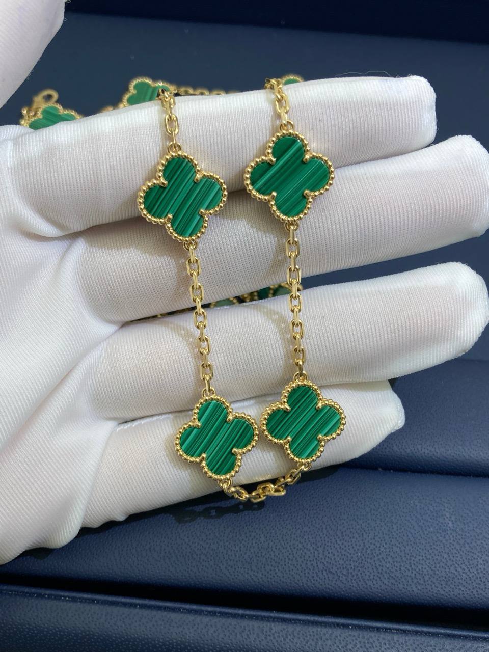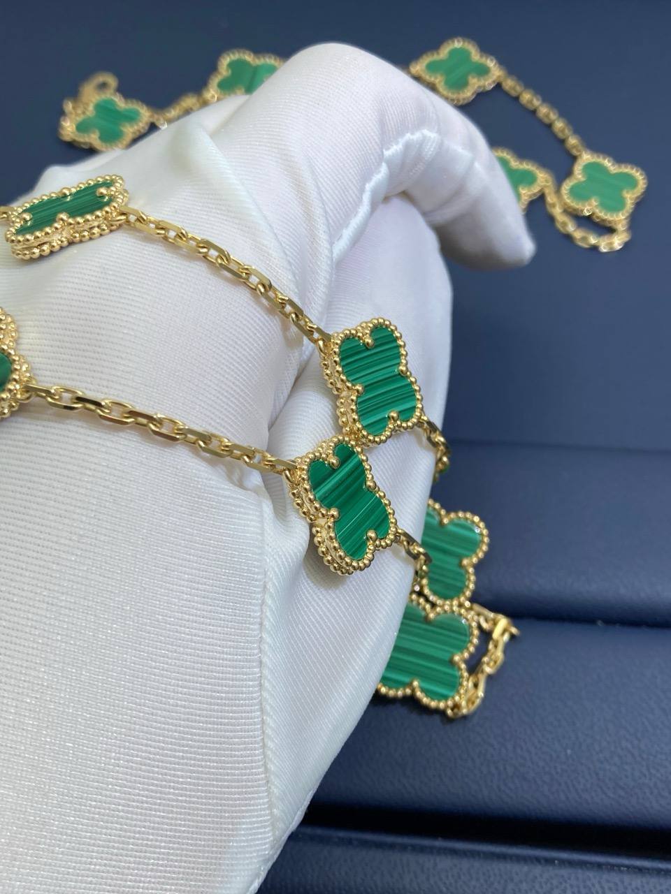 This iconic VC necklace is crafted in 18k yellow gold and features 10 clover motifs, each inlaid with rich green malachite and framed by a delicate beaded edge. A timeless design that embodies elegance and natural beauty, it is a jewel of enduring sophistication.