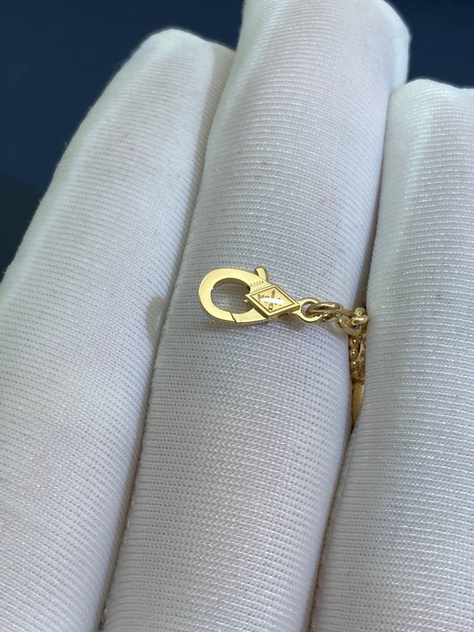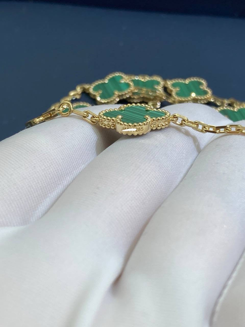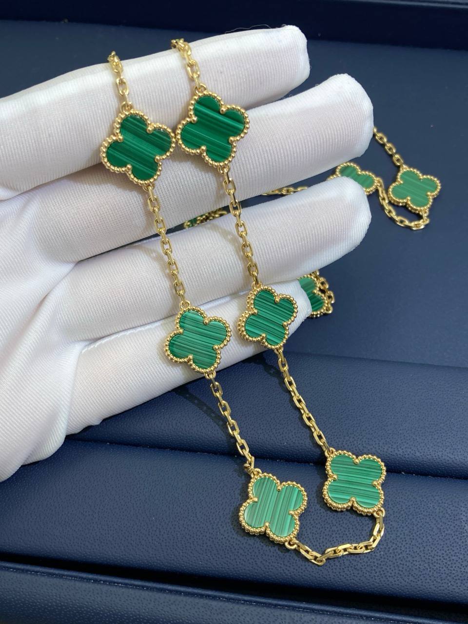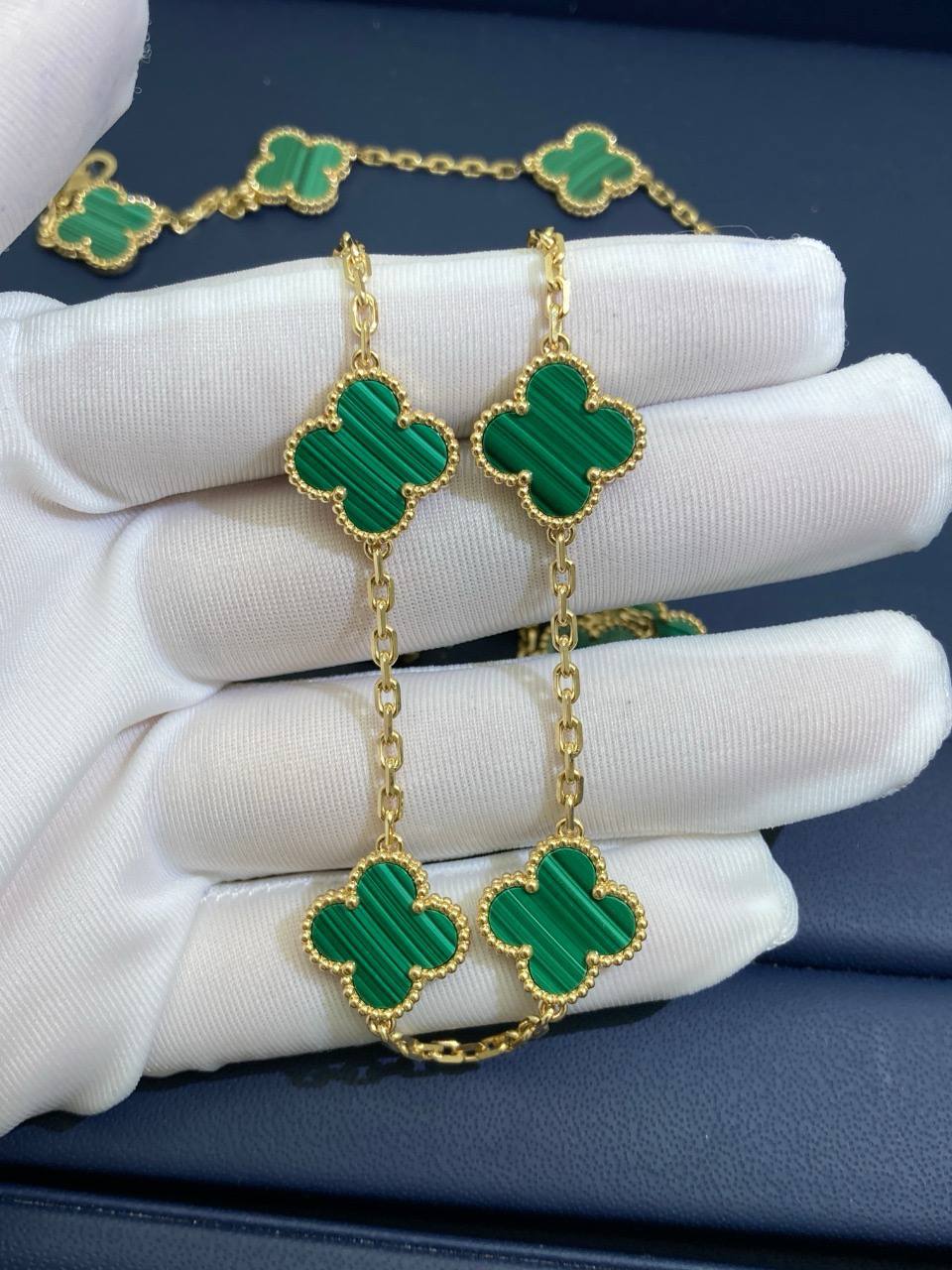 This iconic VC necklace is crafted in 18k yellow gold and features 10 clover motifs, each inlaid with rich green malachite and framed by a delicate beaded edge. A timeless design that embodies elegance and natural beauty, it is a jewel of enduring sophistication.