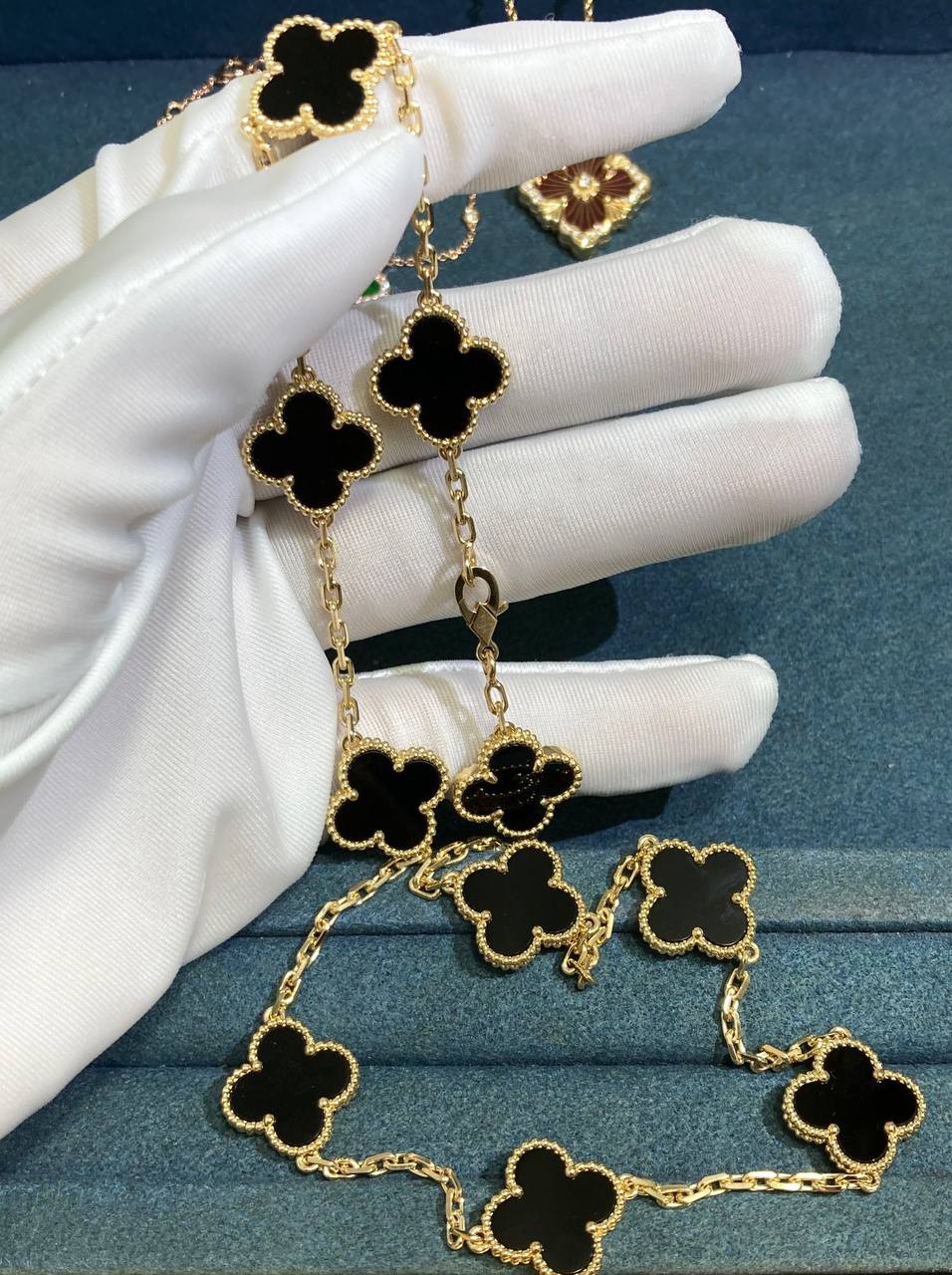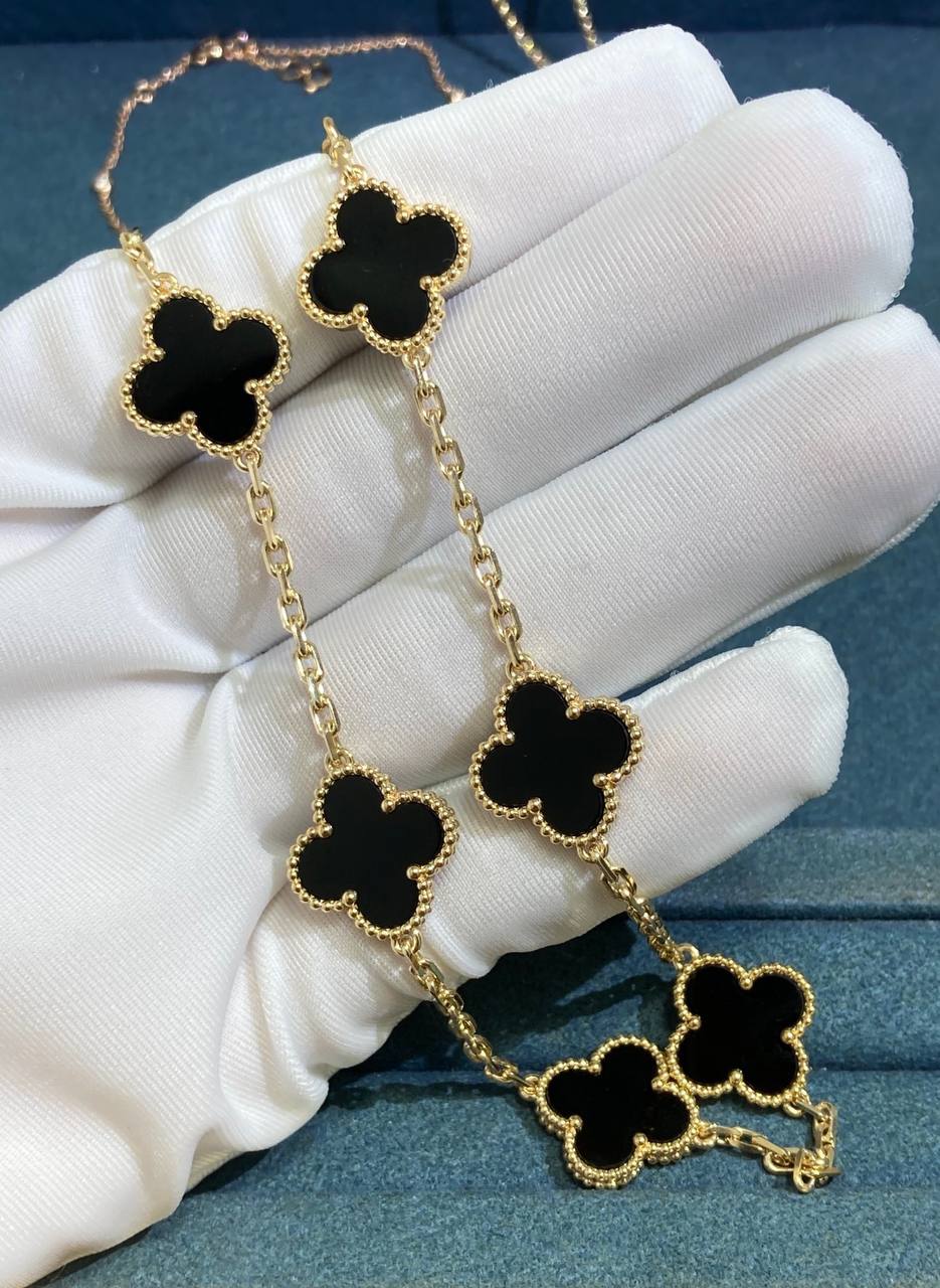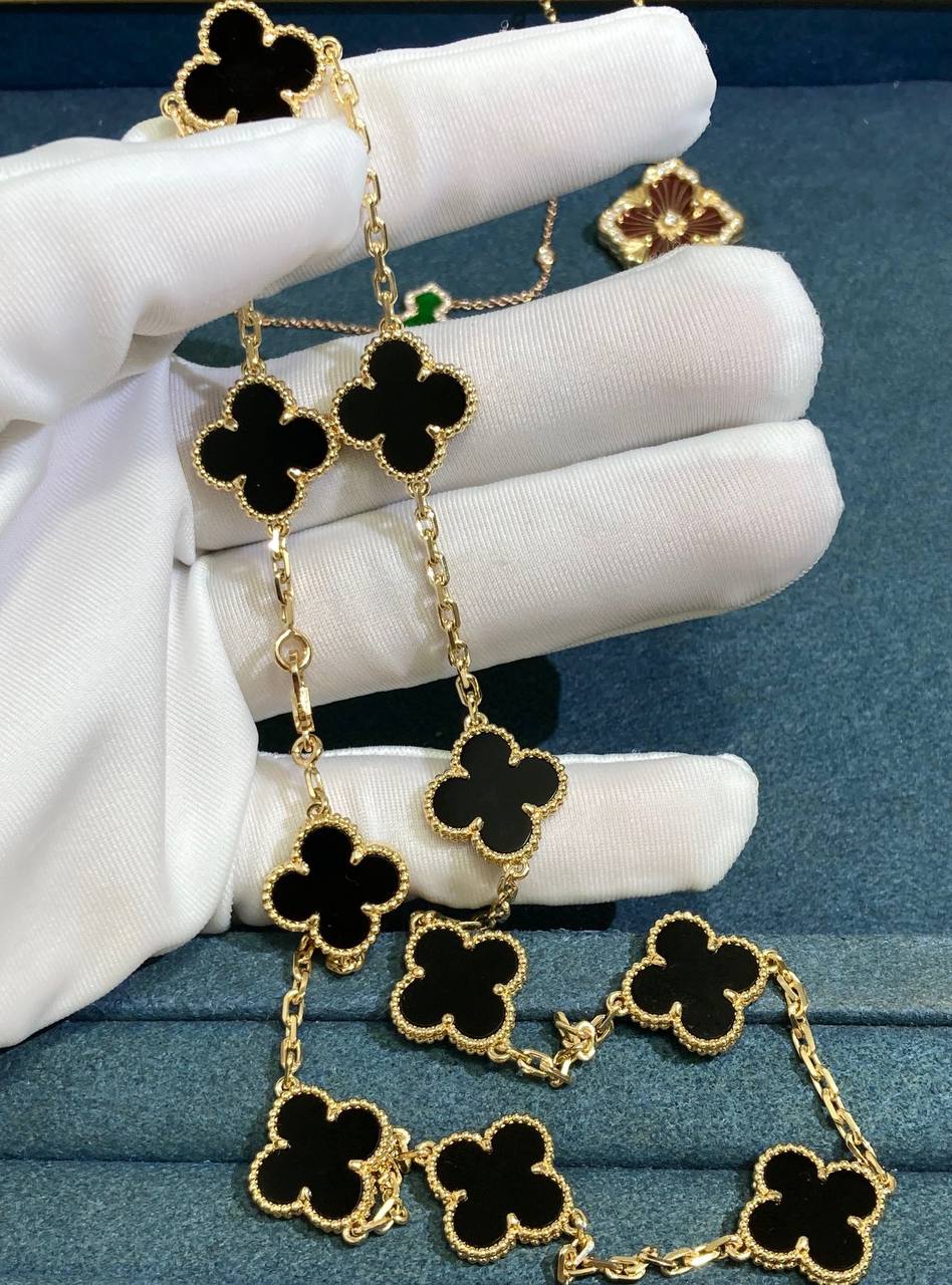 This iconic VC necklace is crafted in 18k yellow gold and showcases 10 clover motifs, each finely inlaid with rich black onyx and framed in a delicate round bead setting. A timeless creation that balances bold contrast with refined elegance.
