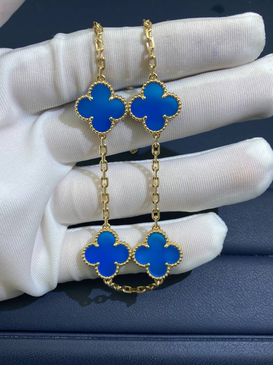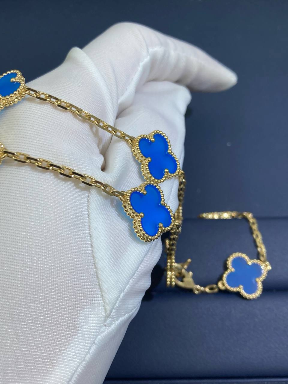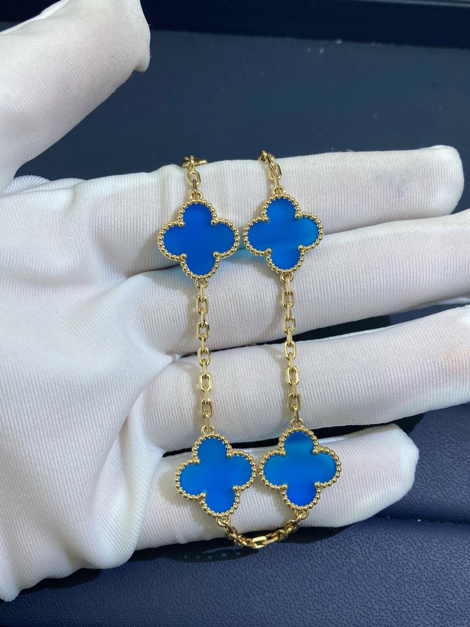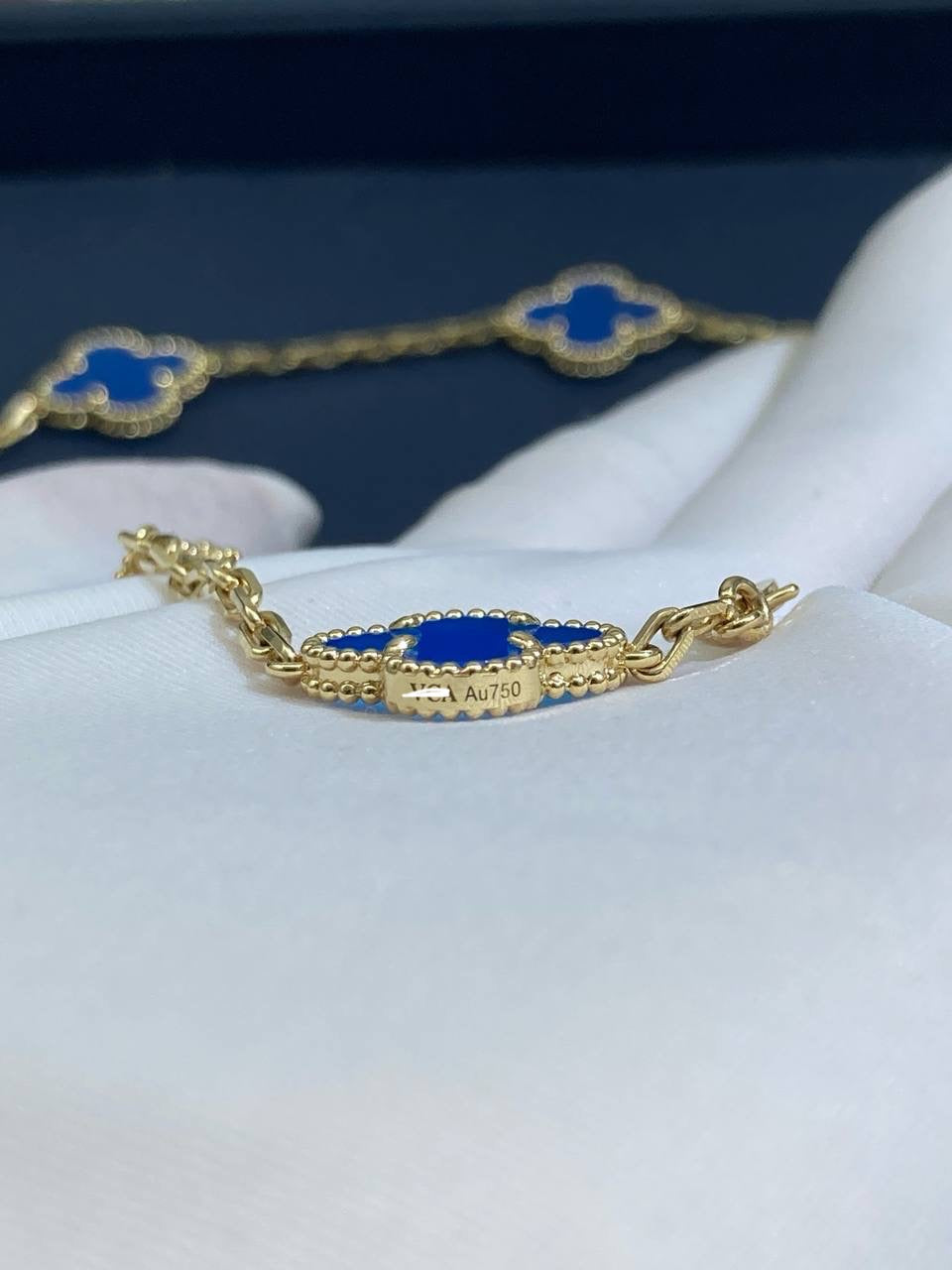 This exquisite VC creation is finely crafted in 18K yellow gold and features five iconic clover motifs. Each motif is beautifully set with luminous blue agate, creating a harmonious balance of color and elegance. Perfectly designed for everyday wear or special occasions, this bracelet is a timeless expression of refined style.