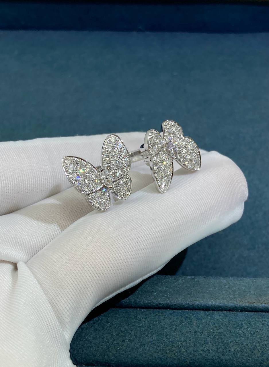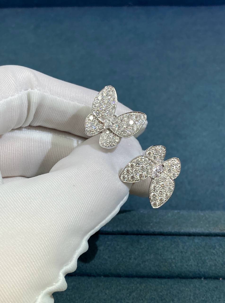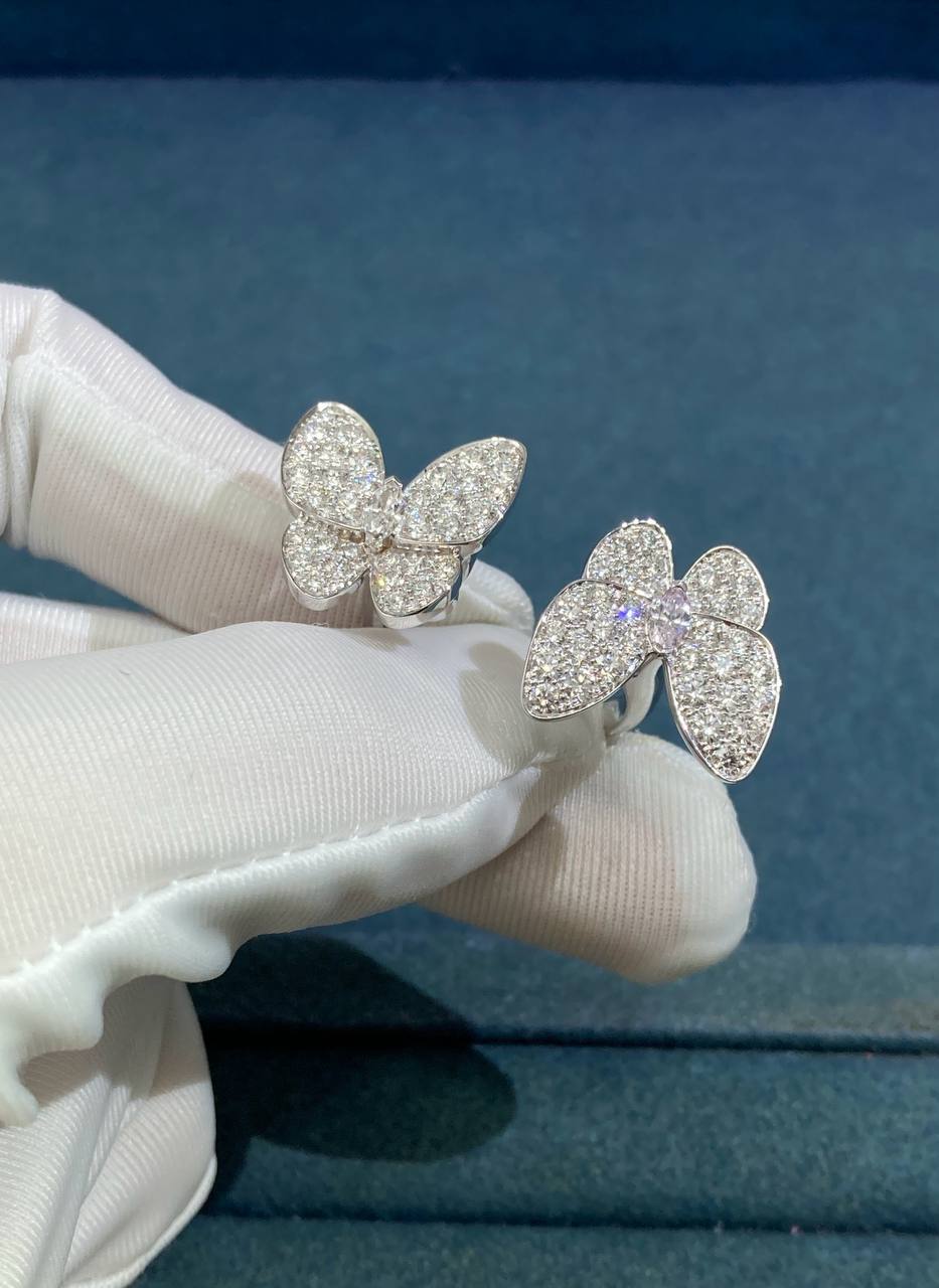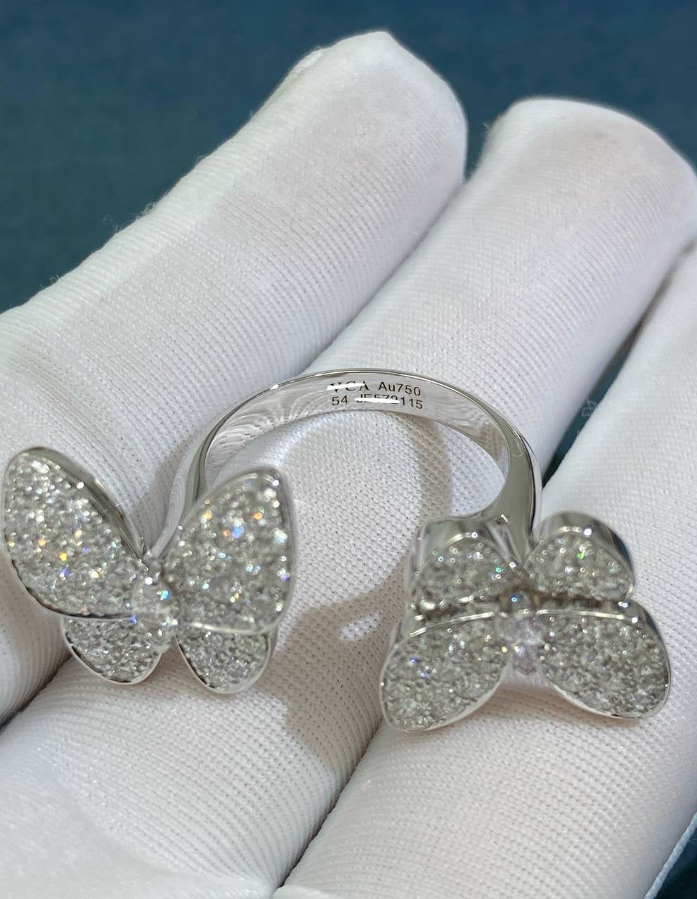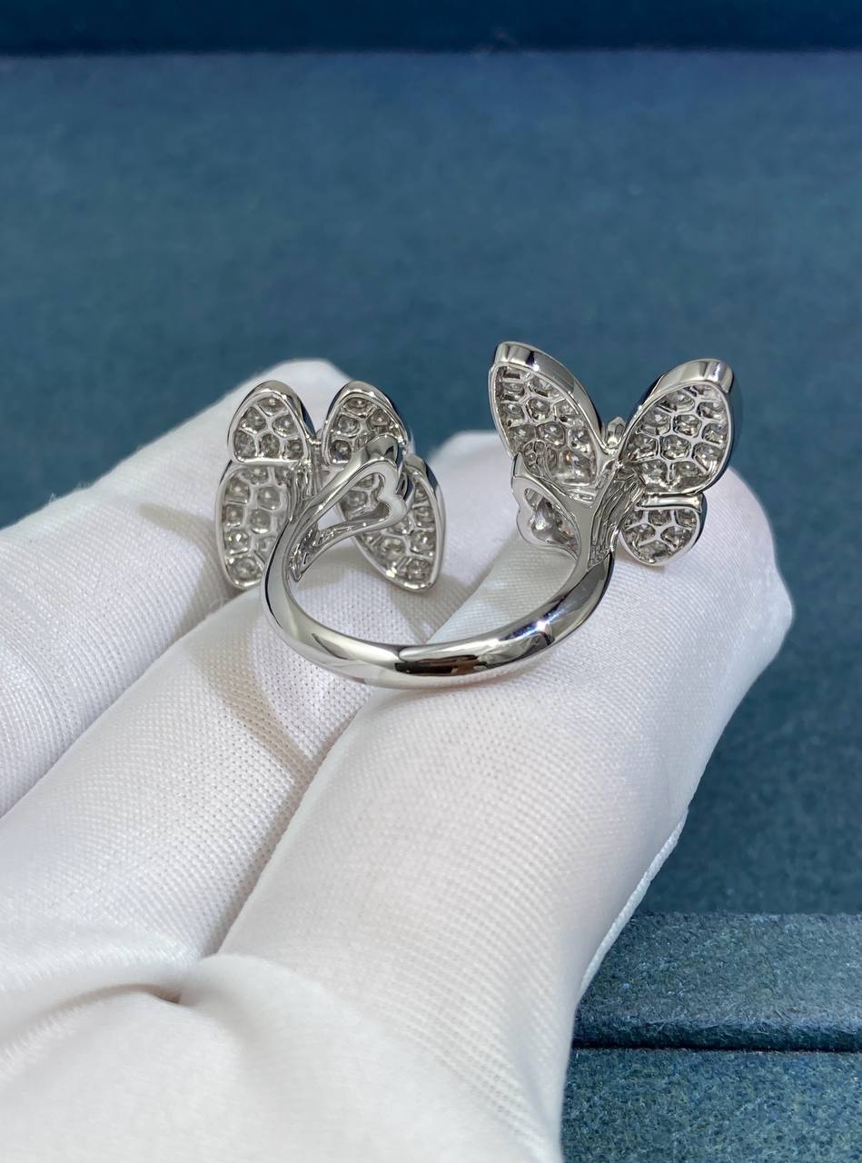This exquisite 18K white gold “Between the Finger” ring from the Butterfly Collection showcases two elegant butterfly motifs perched on a sleek knife-edge band. Each butterfly is adorned with 68 round brilliant-cut diamonds and a marquise-cut diamond at its center, totaling 1.67 ct, creating a dazzling play of light and refined sophistication.