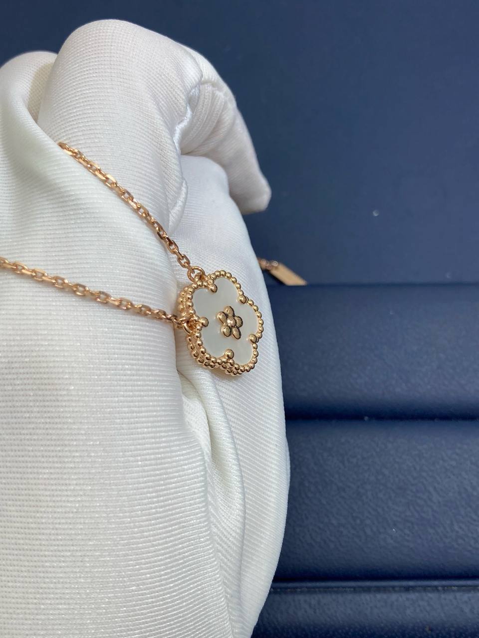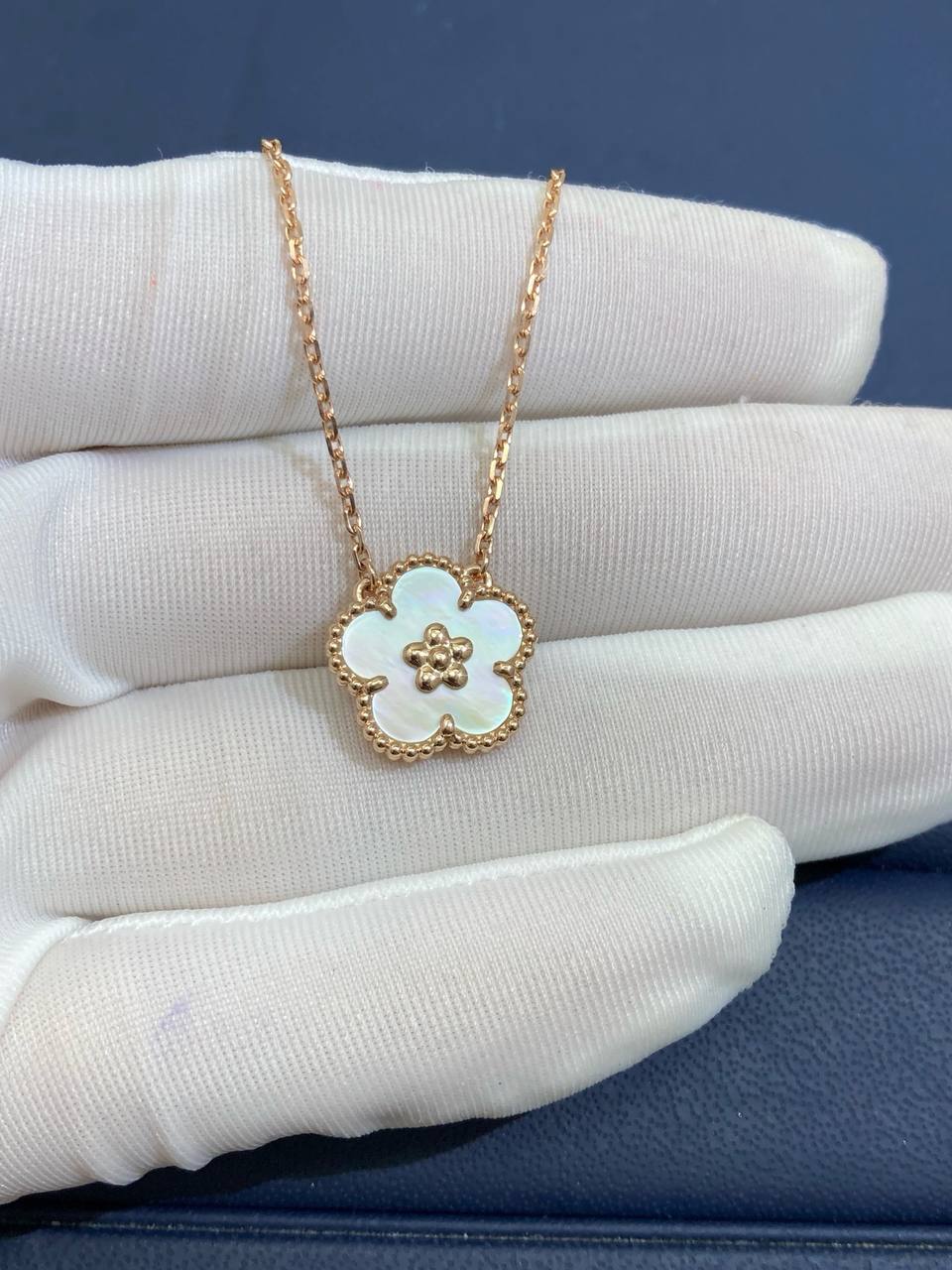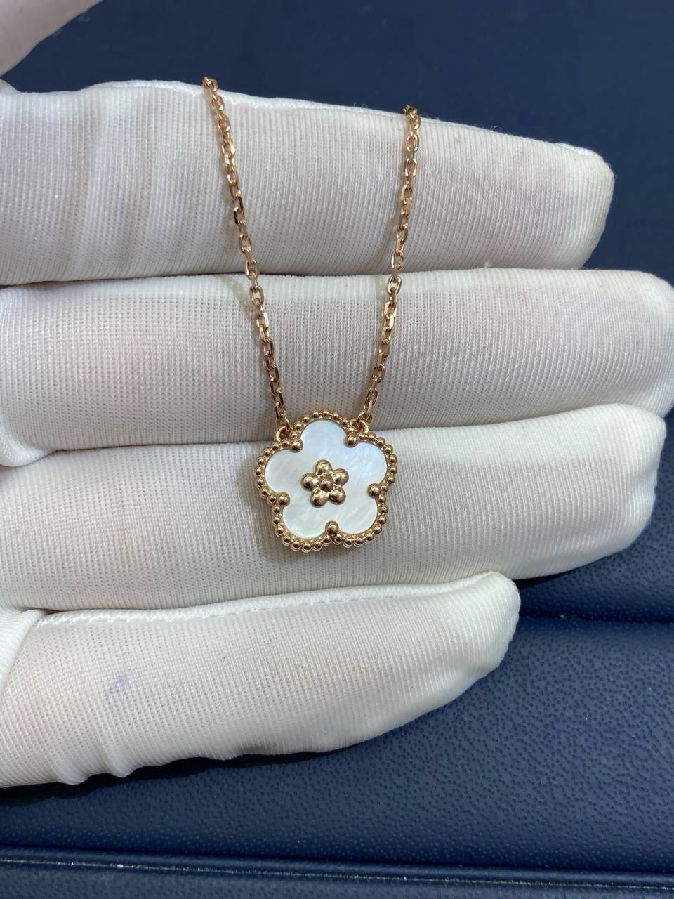 This delicate blossom pendant is crafted in 18k rose gold and adorned with luminous white mother-of-pearl. Celebrating the timeless themes of nature and luck, the design embodies grace and positivity while offering a refined touch of everyday elegance.