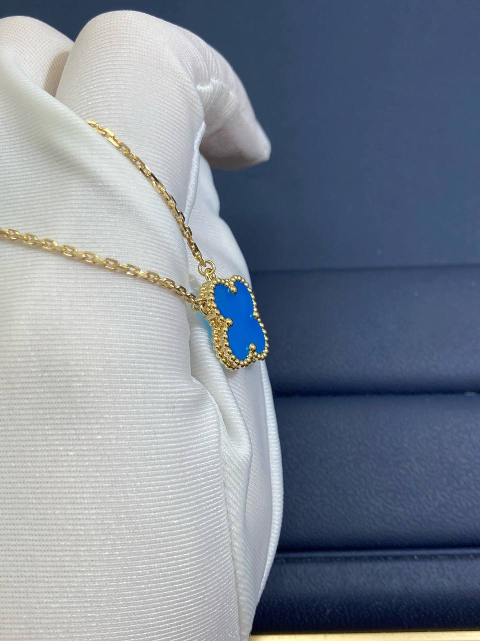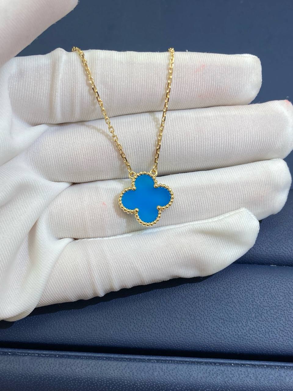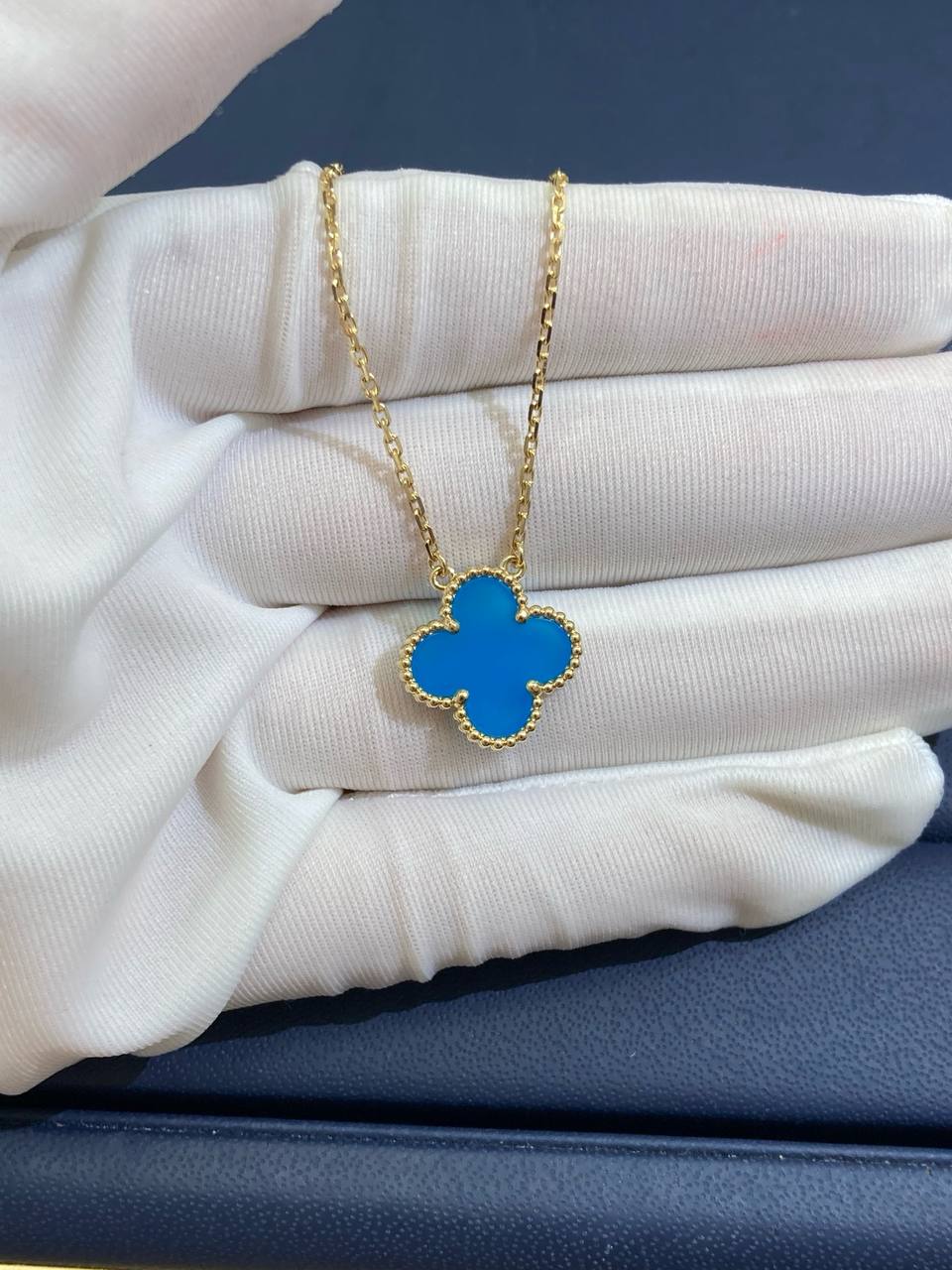 This refined collar-length necklace is crafted in 18k yellow gold and features a single clover pendant inlaid with vivid blue agate. Secured with a hallmark clasp, the design blends timeless elegance with a modern pop of color, making it perfect for both everyday wear and special occasions.