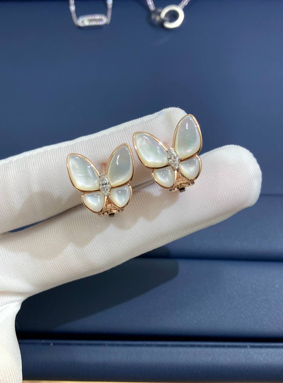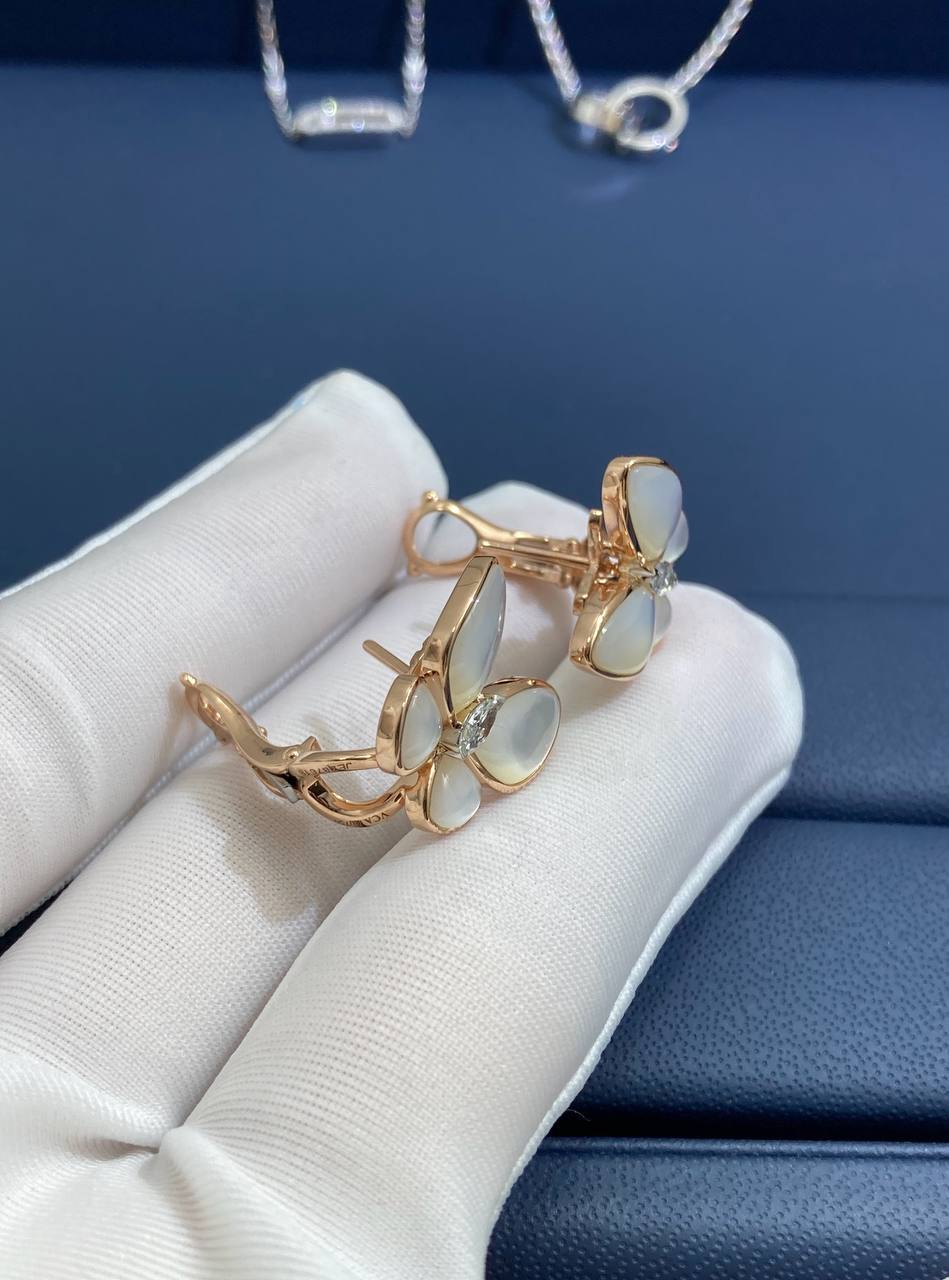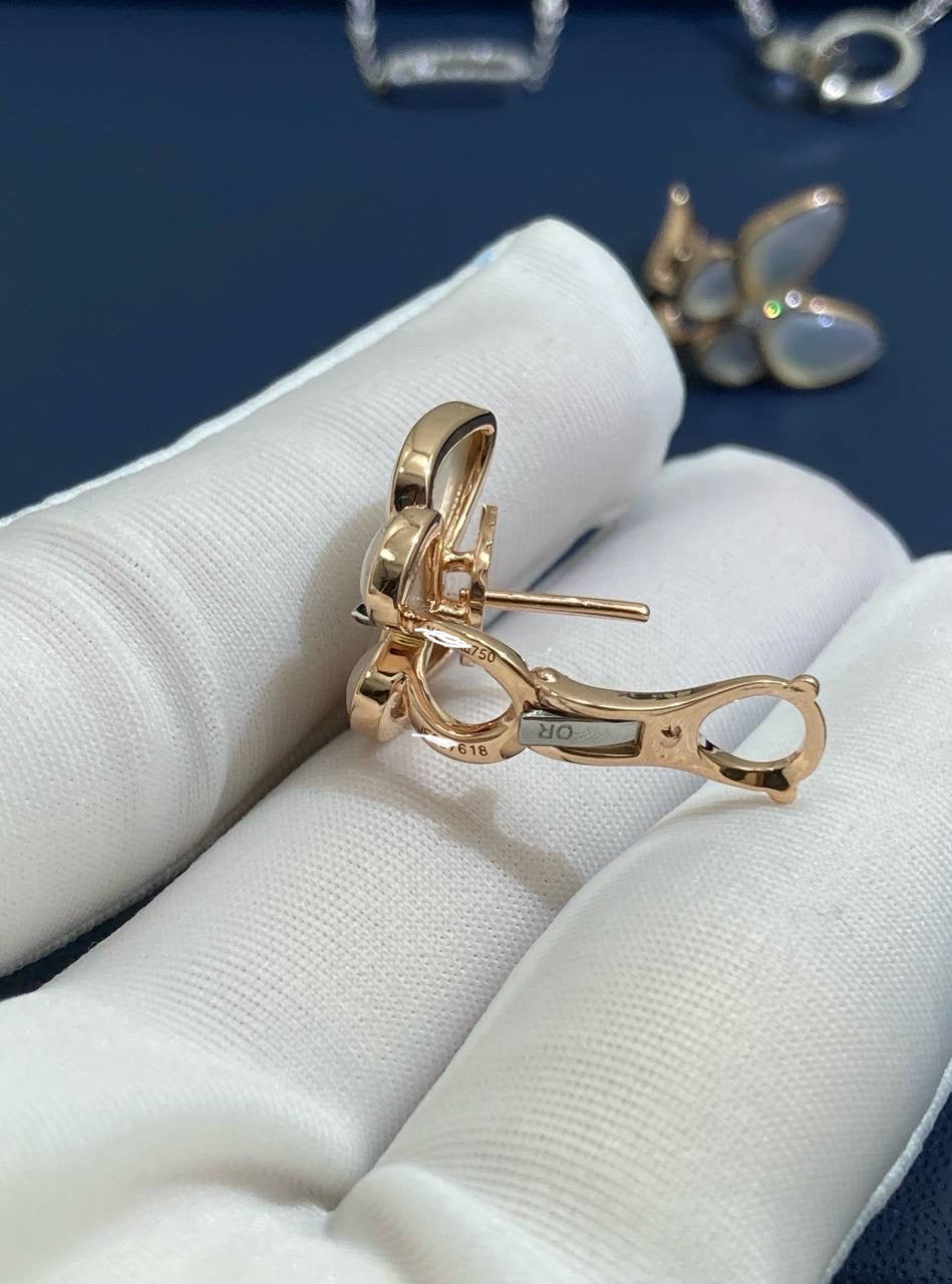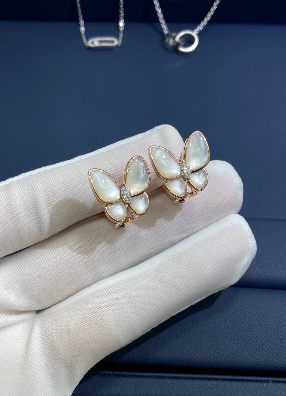 Where luxury meets the beauty of nature, these exquisite Two Butterfly earrings are crafted in 18k rose gold and adorned with luminous mother-of-pearl wings. Each butterfly is accented with a sparkling marquise-cut diamond at its center, while a floating round diamond adds a touch of graceful brilliance. Finished with clip backs and detachable stems for versatile wear, they are a timeless celebration of elegance and femininity.